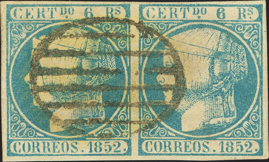 16F(2). 1852. 6 reales azul, pareja. FALSO SPERATI (Tipos C y D), al dorso marca de la B.P.A. MAGNIFICA.