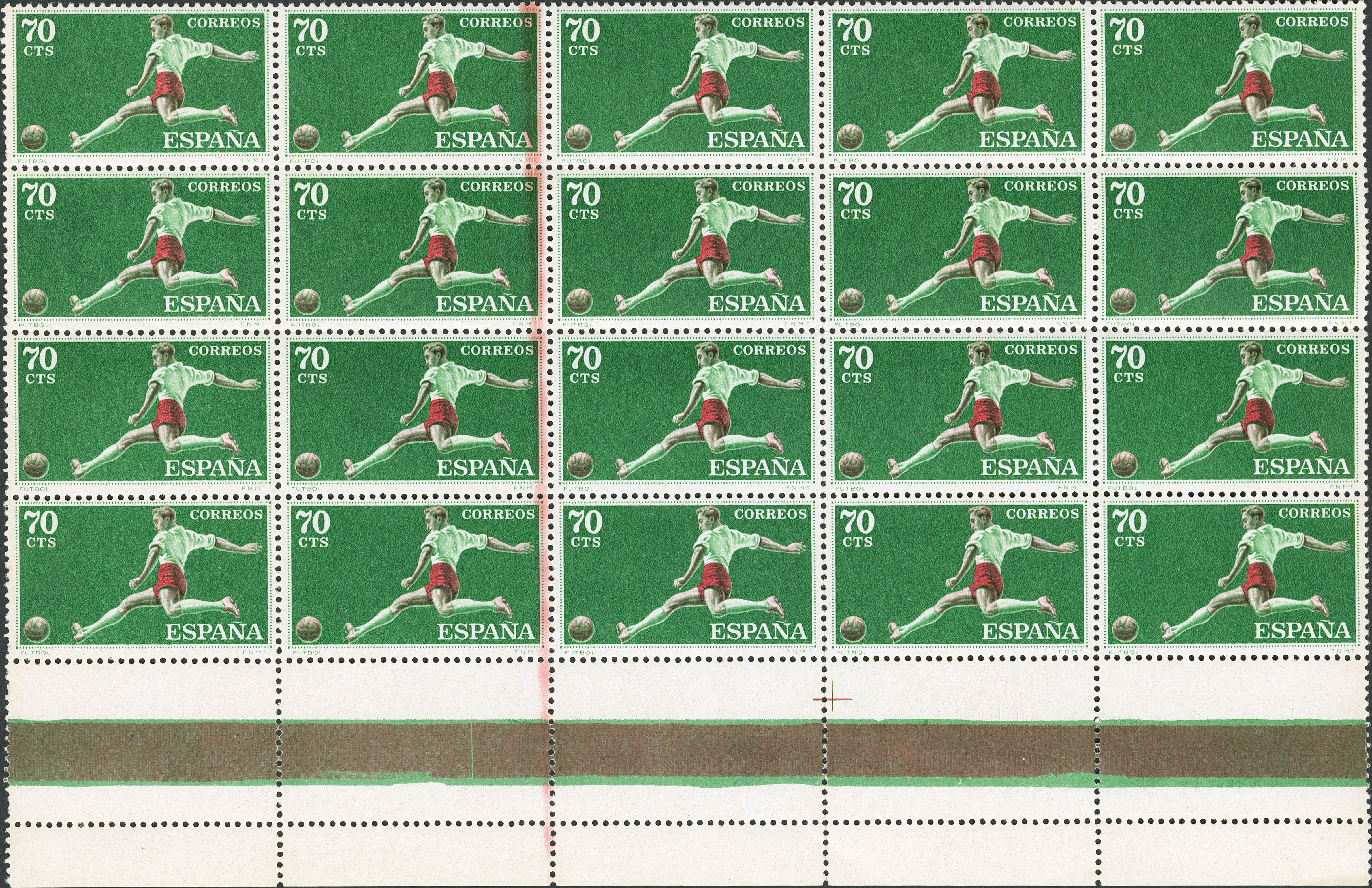 ★★ 1308(11). 1960. 70 cts verde y rojo, bloque de once, cuatro sellos RAYA DE TINTA VERTICAL, en rojo. MAGNIFICO.