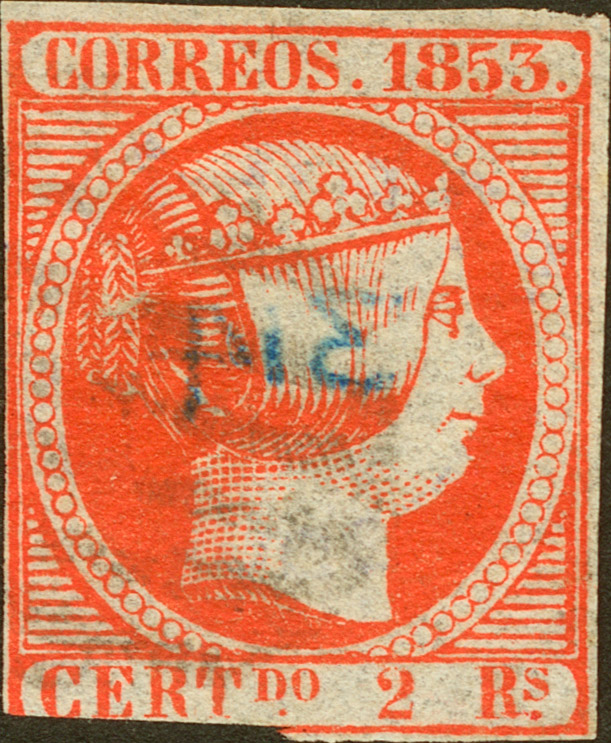 19F. 1853. 2 reales bermellón (margen inferior justo). FALSO SPERATI, al dorso marca de la B.P.A. MAGNIFICO.