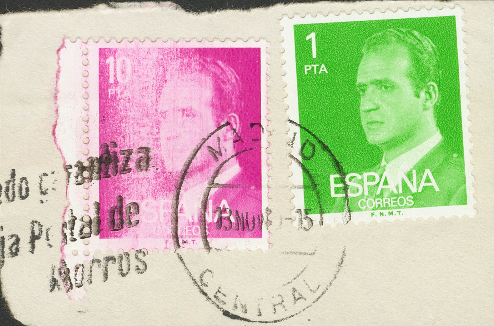 △ 2394, 2390. 1977. 10 pts rosa variedad IMPRESION DIFUMINADA y 1 pts verde, sobre fragmento. MAGNIFICO Y RARA VERDADERA VARIEDAD.