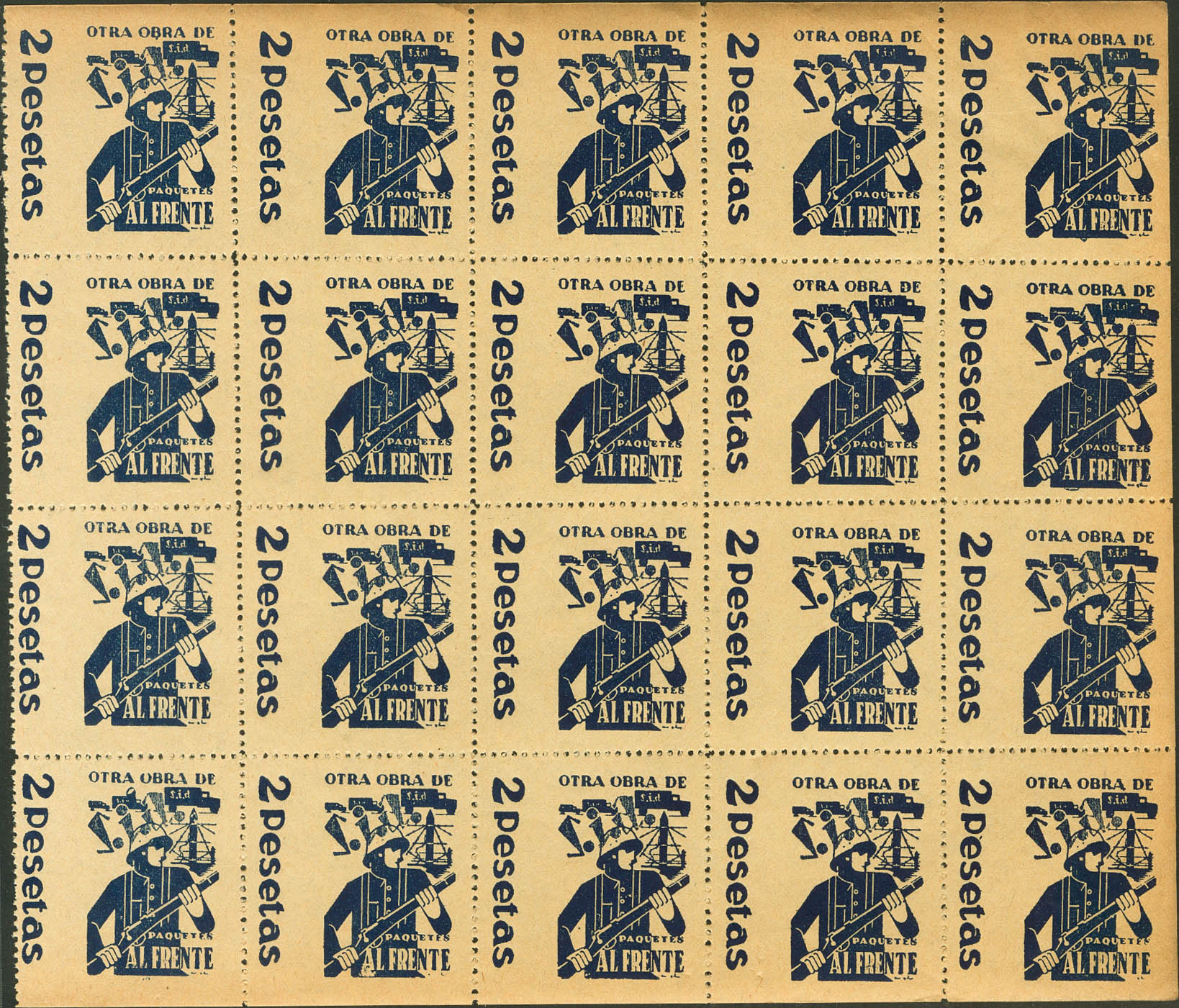 ★★1937. 2 pts azul, bloque de veinte. S.I.A. PAQUETES AL FRENTE. MAGNIFICO Y MUY RARO. (Allepuz 1288, Domenech 146)