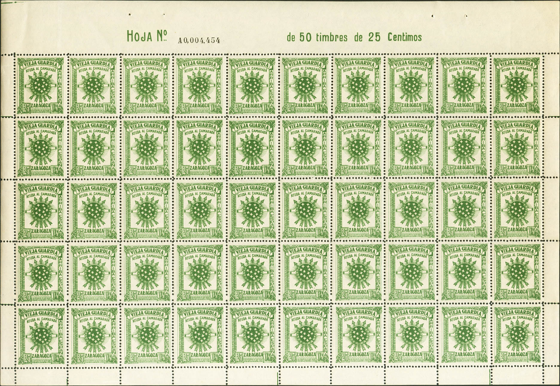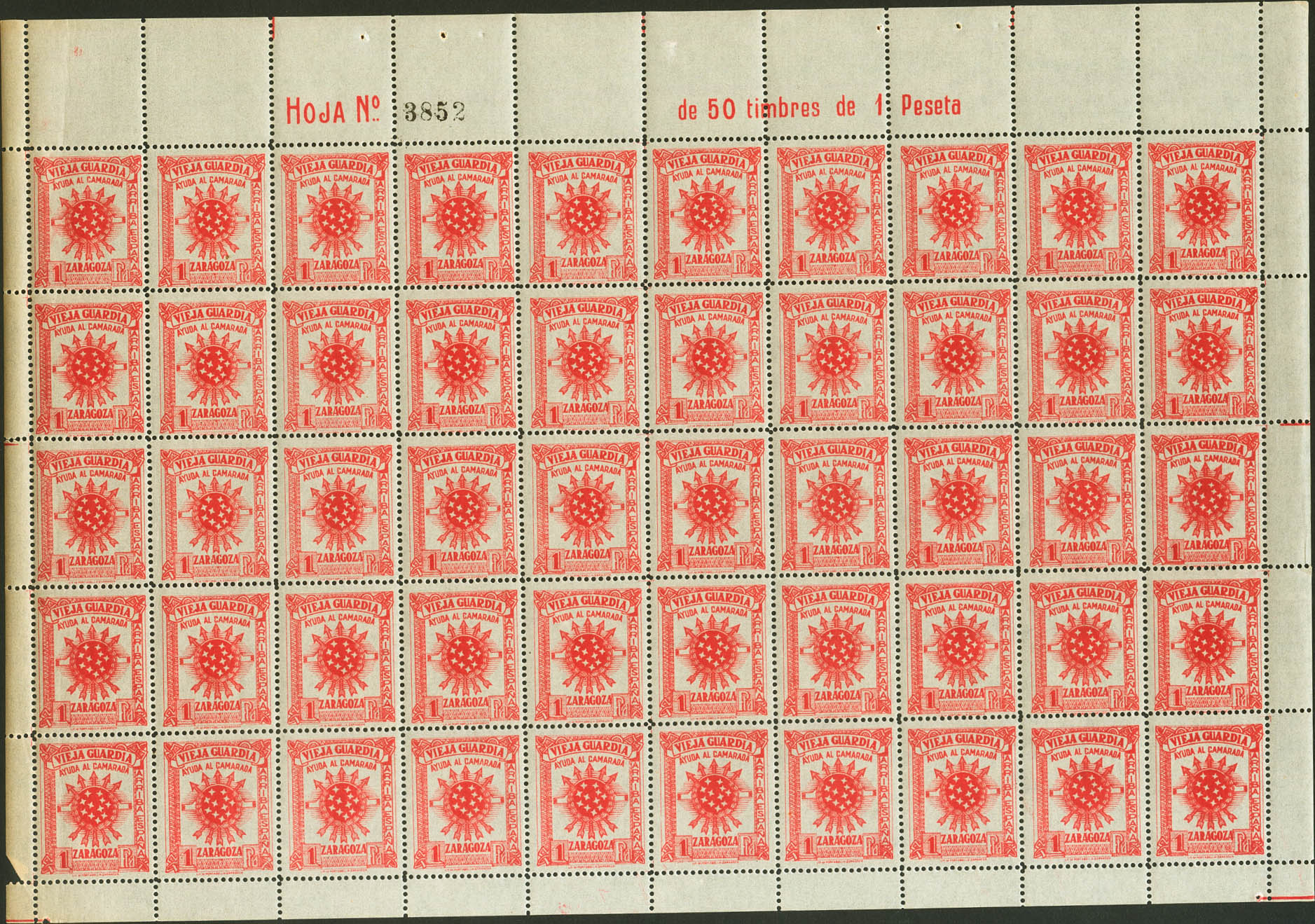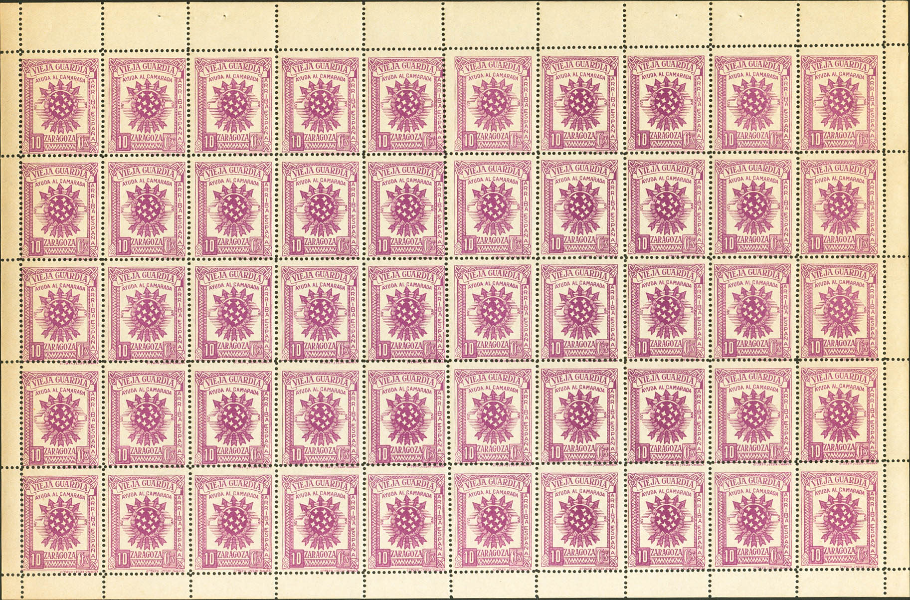 ★★1937. Serie completa, tres valores, en pliegos de cincuenta sellos. ZARAGOZA. MAGNIFICA Y RARA EN PLIEGOS. (Fesofi 27/29)