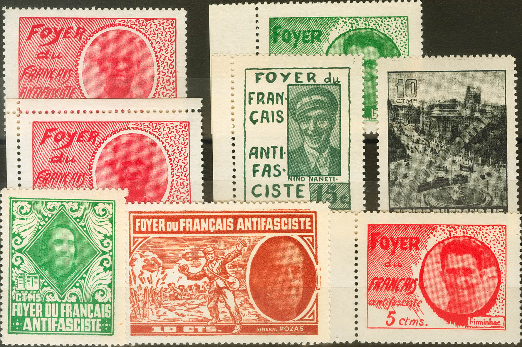 (★)1936. Conjunto de ocho viñetas políticas de FOYER FRANCAIS ANTIFASCISTE nuevas (una repetida). MAGNIFICAS. (Allepuz 3168, 3210, 3226, 3251, 3260, 3271, 3272 Domenech 1334, 1336, 1357, 1390/91, 1394, 1396)