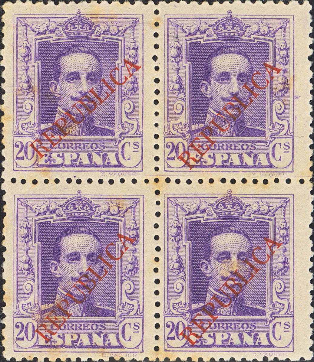 ★★ NE1(4). 1931. 20 cts lila, bloque de cuatro (manchitas del tiempo). NO EMITIDO. MAGNIFICO Y RARO. Edifil 2017: +280 Euros