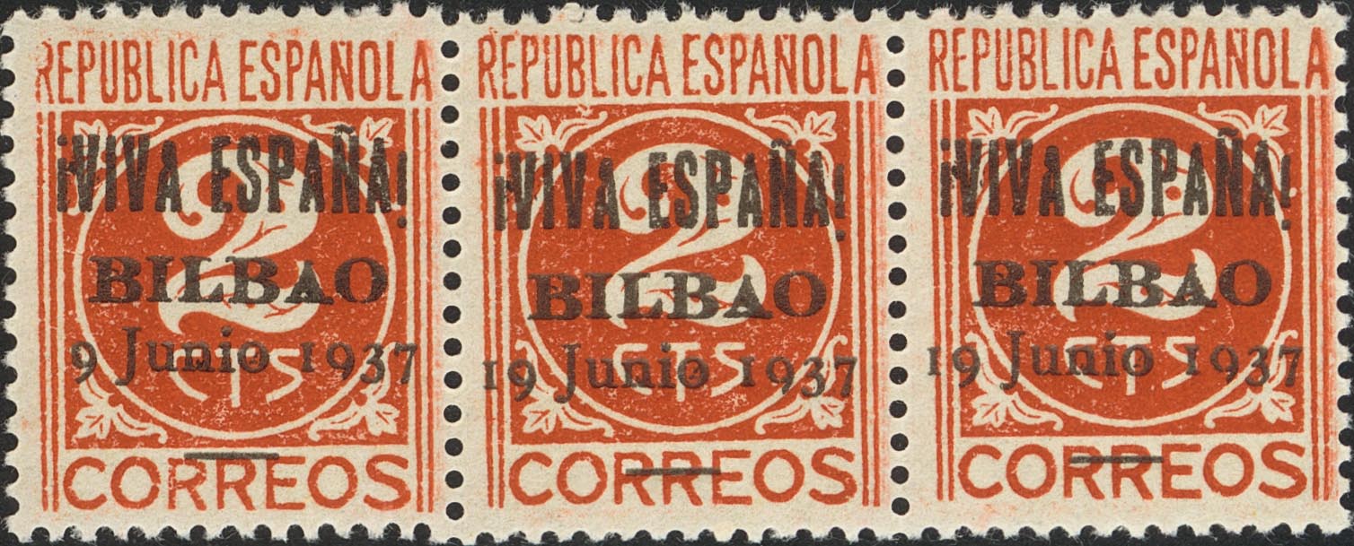 ★★ 2. 1937. 2 cts castaño, tira de tres. ERROR DE IMPRESION "9 JUNIO 1937" SIN "1", en el primer sello de la tira. MAGNIFICA.