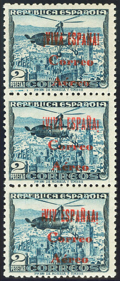 ★ 72, 72he, 72heb. 1938. 2 pts azul, tira de tres. Sello superior SOBRECARGA "VIVA ESPAÑA" y sello inferior SOBRECARGA "VIV ESPAÑAA". MAGNIFICA Y RARA. Edifil 2017: 192 Euros