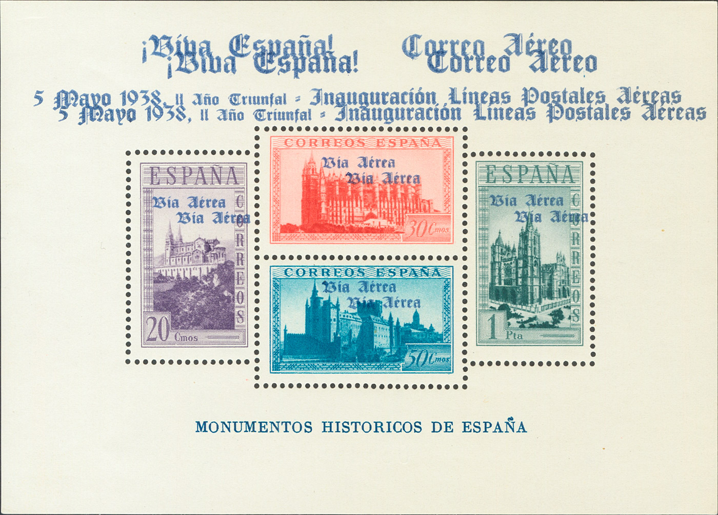 ★★ 95Ahh. 1938. Hoja bloque (Tipo II). SOBRECARGA DOBLE, en azul. MAGNIFICA Y RARISIMA. Cert. GRAUS.