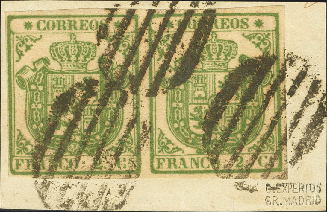 △ 32(2). 1854. 2 cuartos verde, pareja sobre fragmento. MAGNIFICA Y RARISIMOS LOS MULTIPLOS DE ESTE SELLO. Cert. EXFIMA.