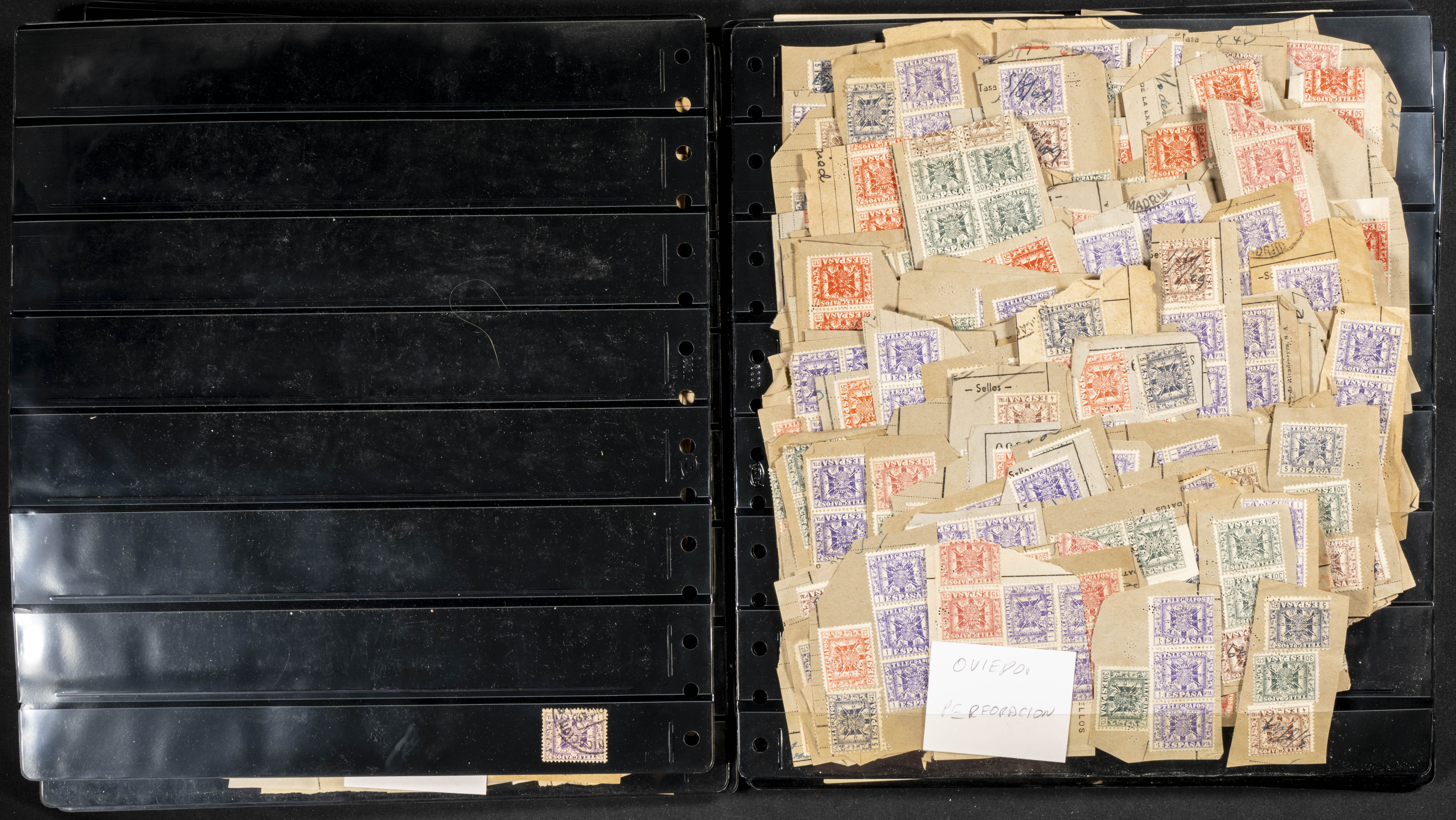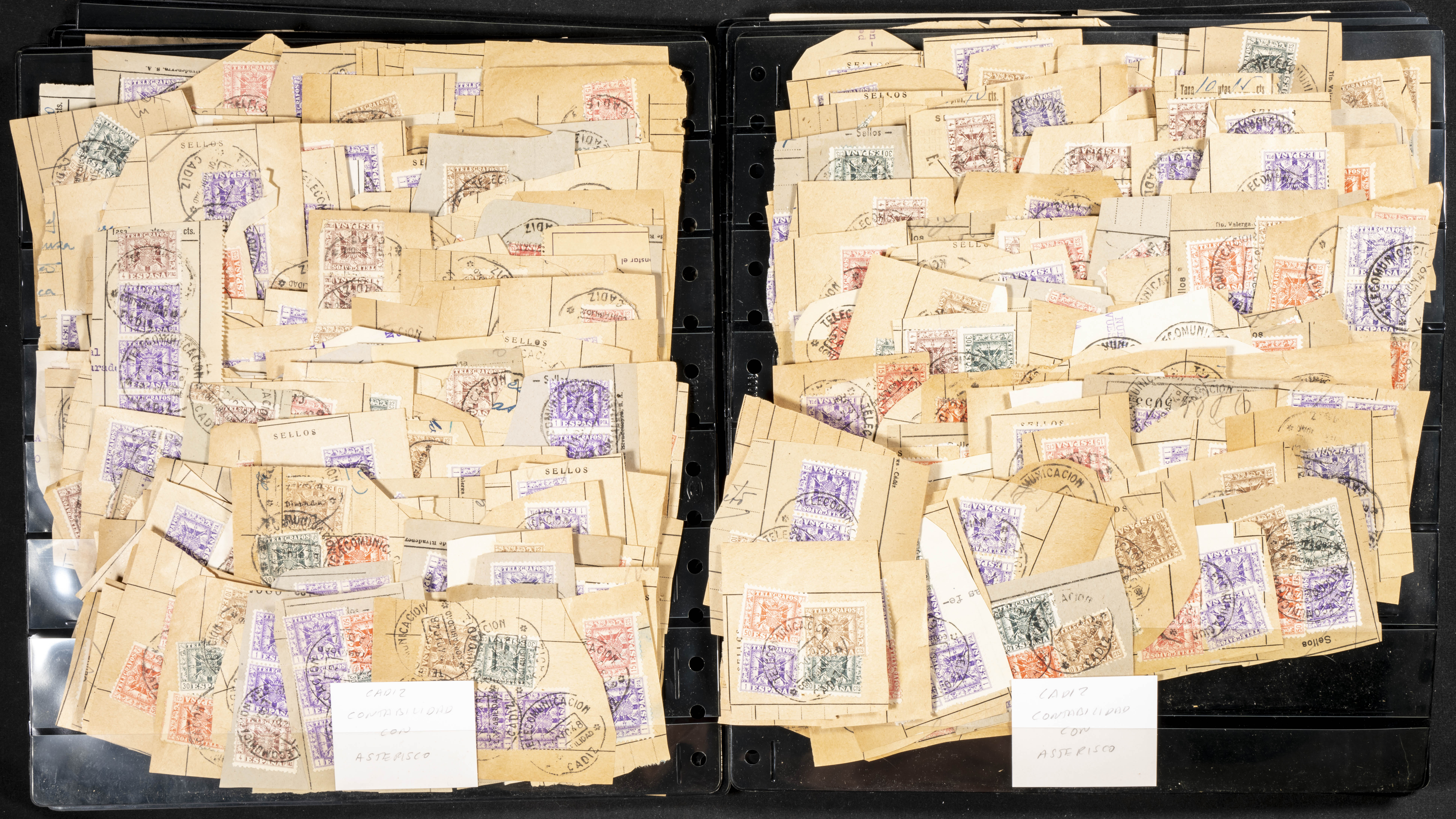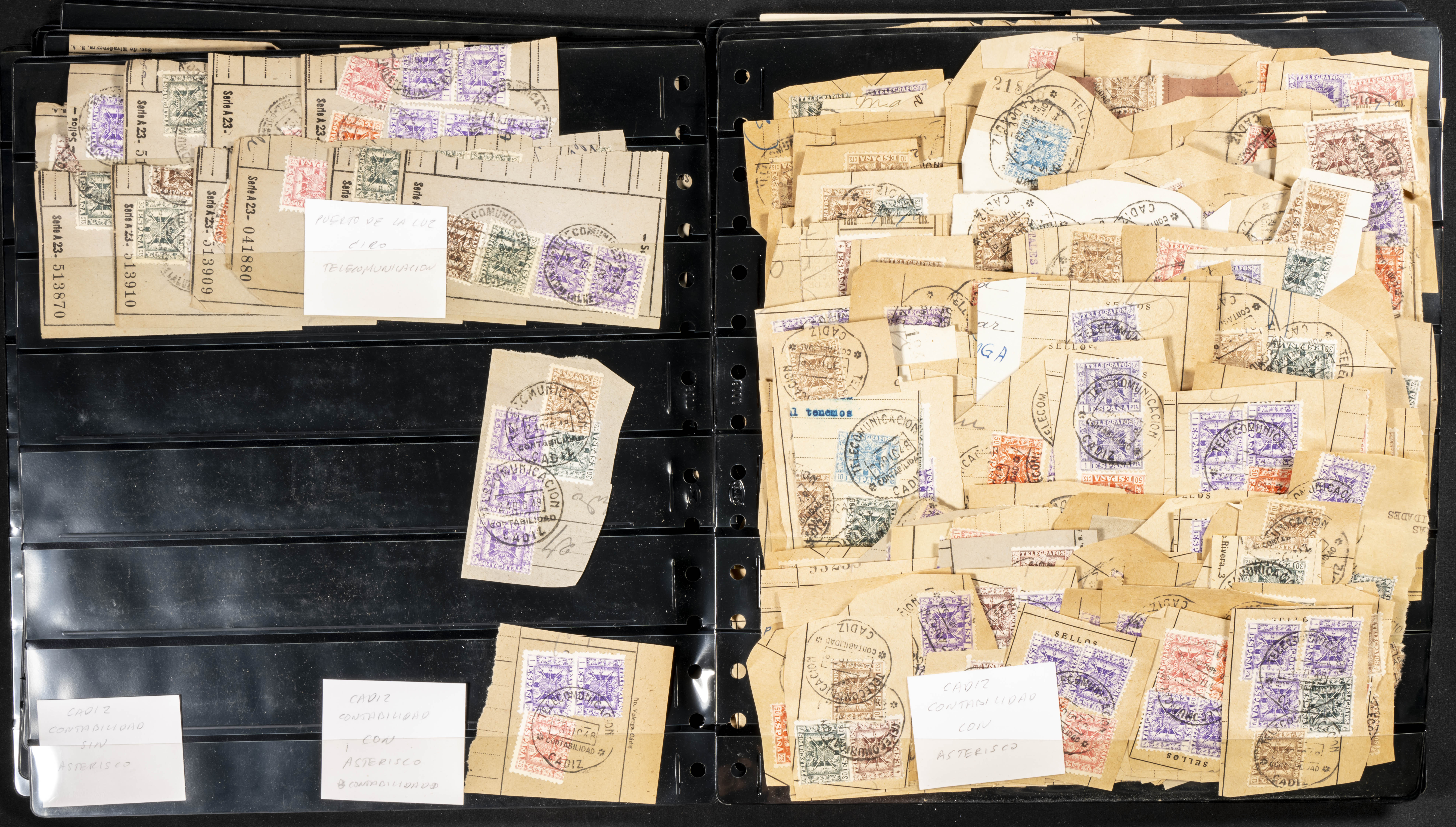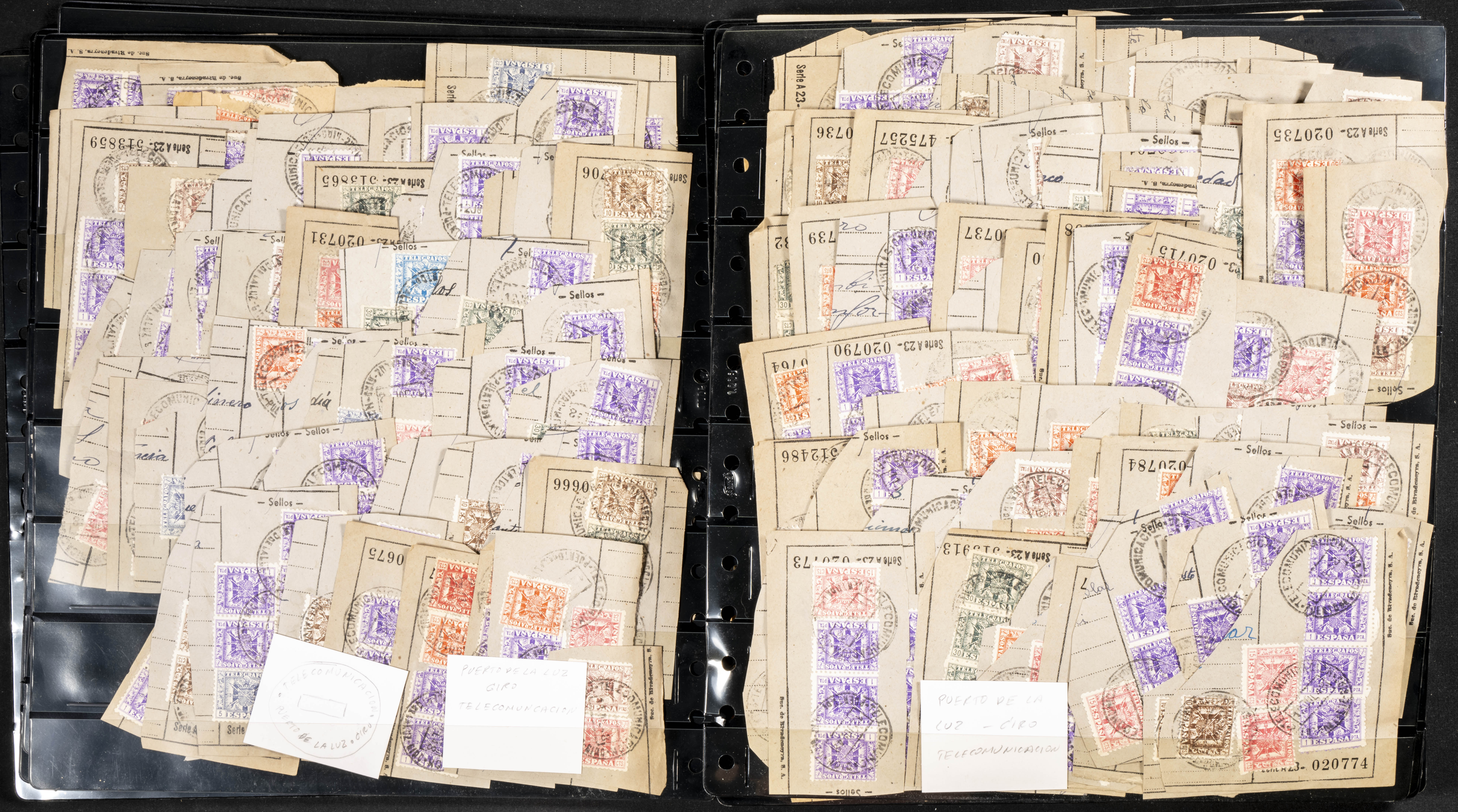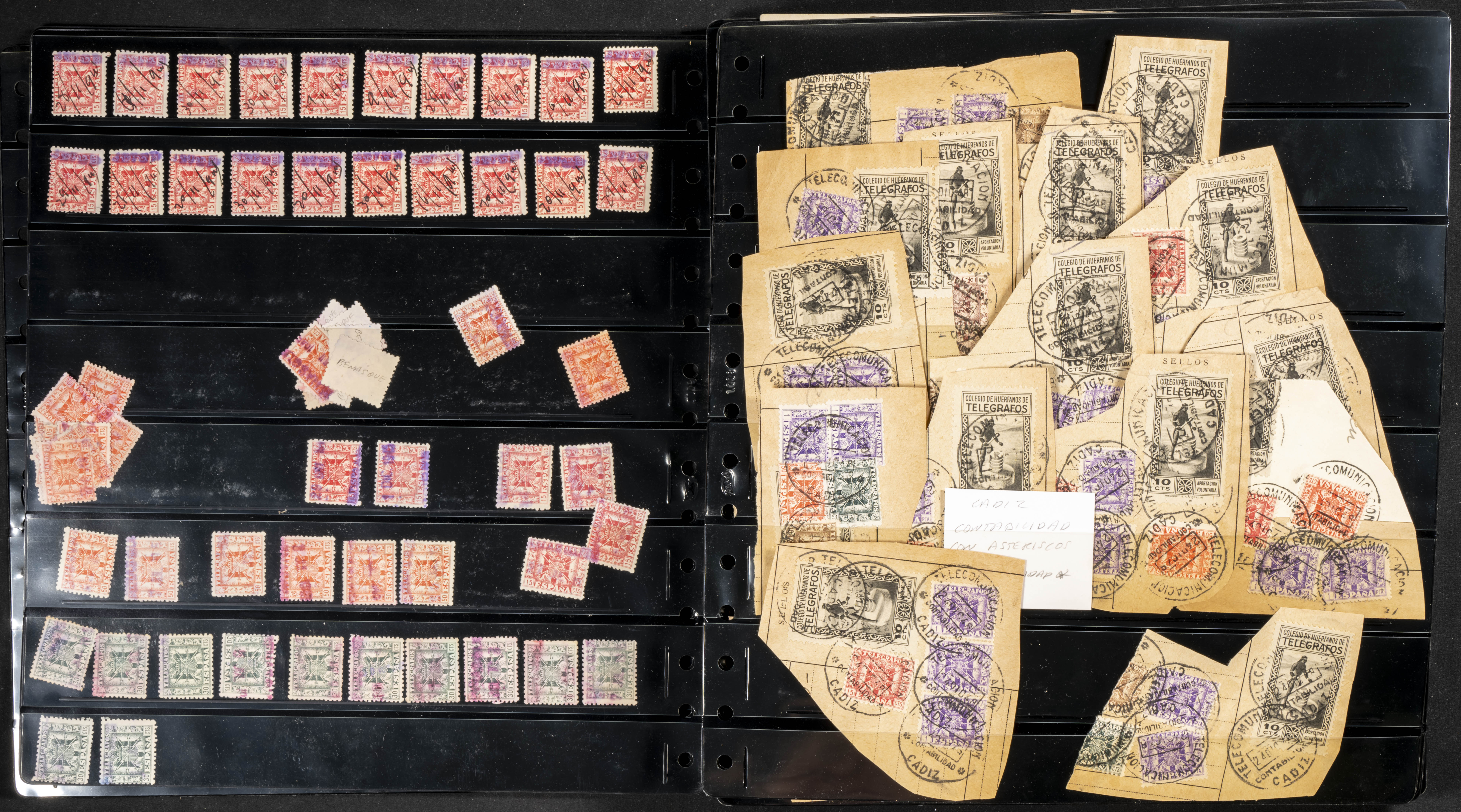 (1940ca). Interesante conjunto de miles de sellos de Telégrafos de la emisión de 1940 sobre fragmentos y algunos sueltos inutilizados a pluma, incluye decenas de hojas de reintegro con sellos de la misma emisión y fragmentos con grandes bloques de la emisión de 1932 con anulaciones de perforación. A EXAMINAR.