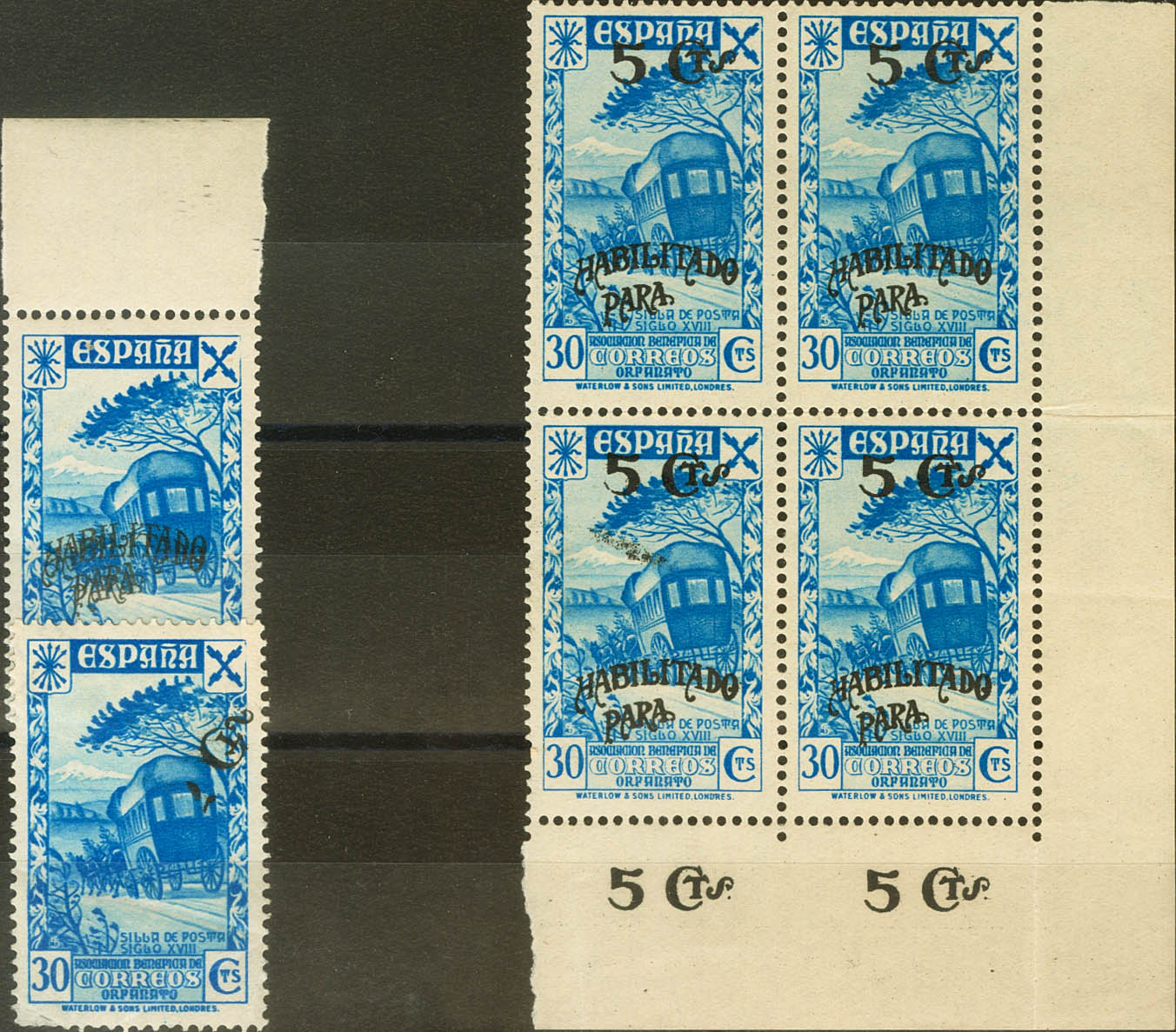 ★★/★ 36(6). 1940. 5 cts sobre 30 cts azul, seis sellos con variedades diversas de sobrecarga. MAGNIFICOS.