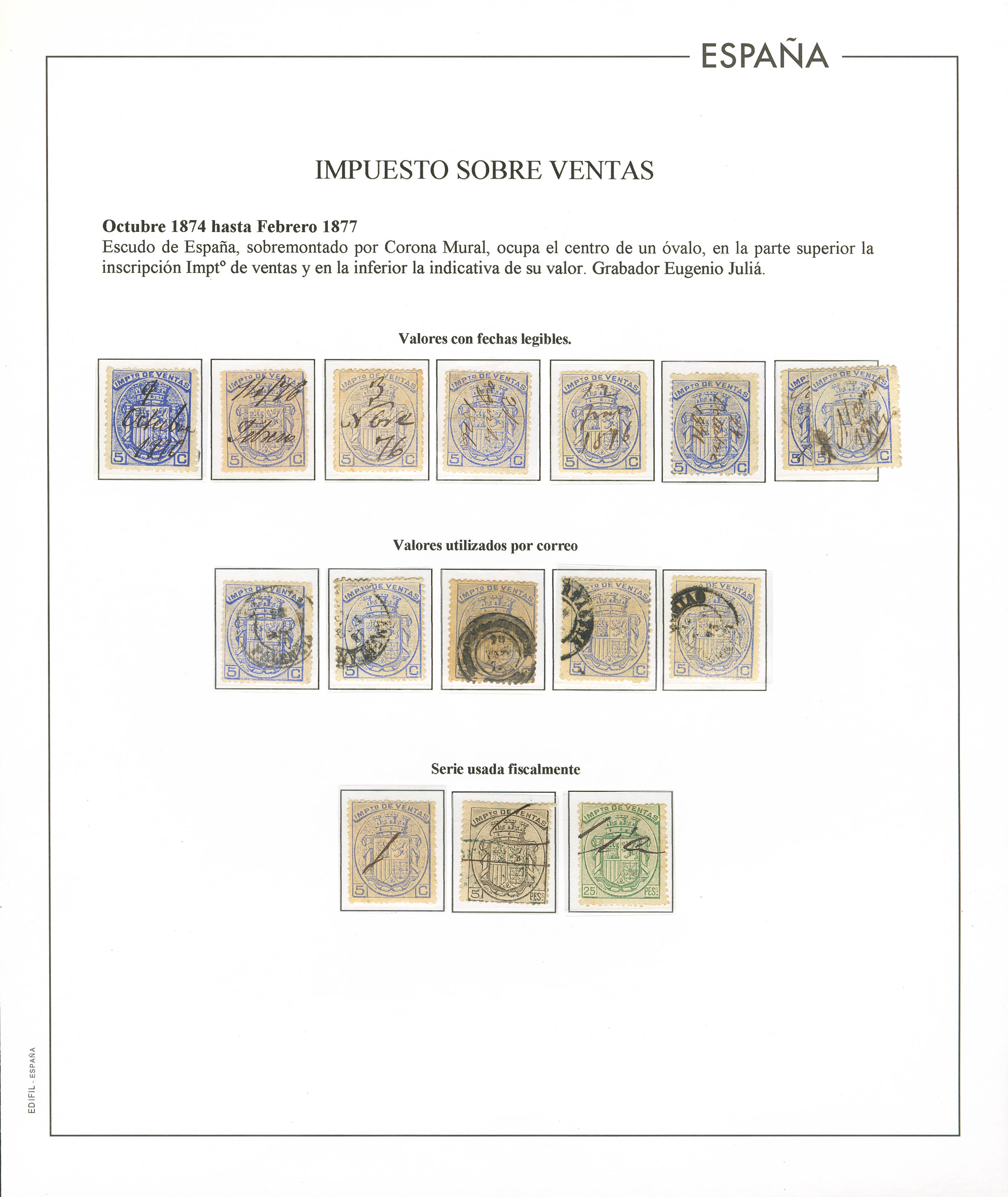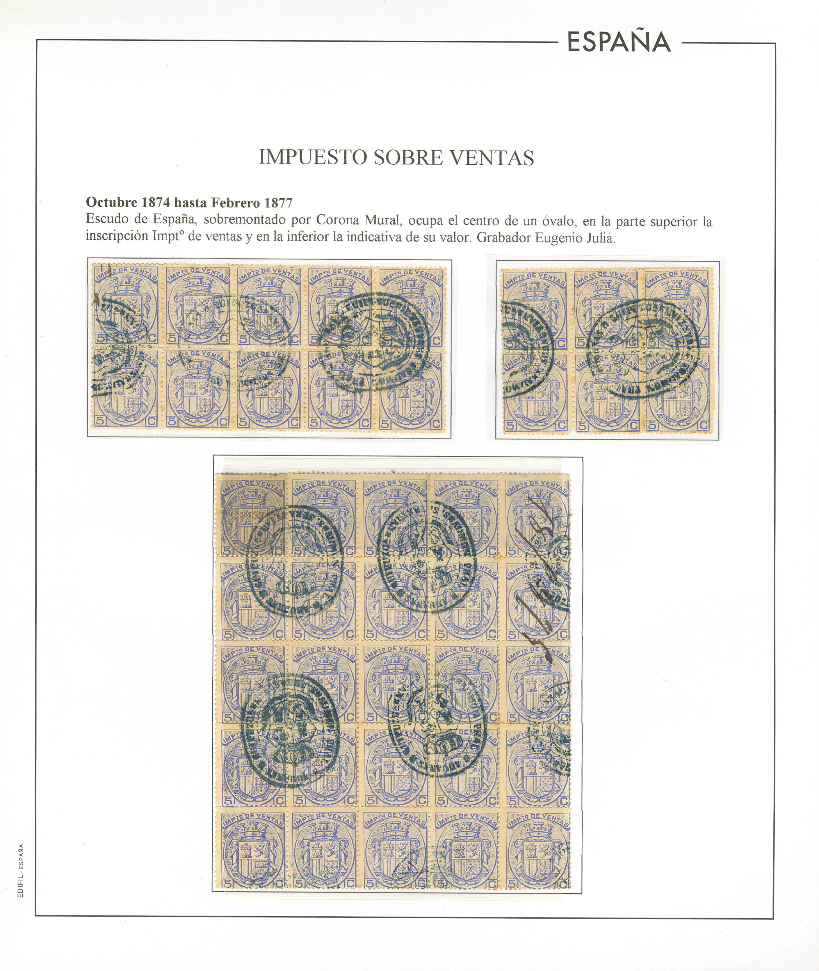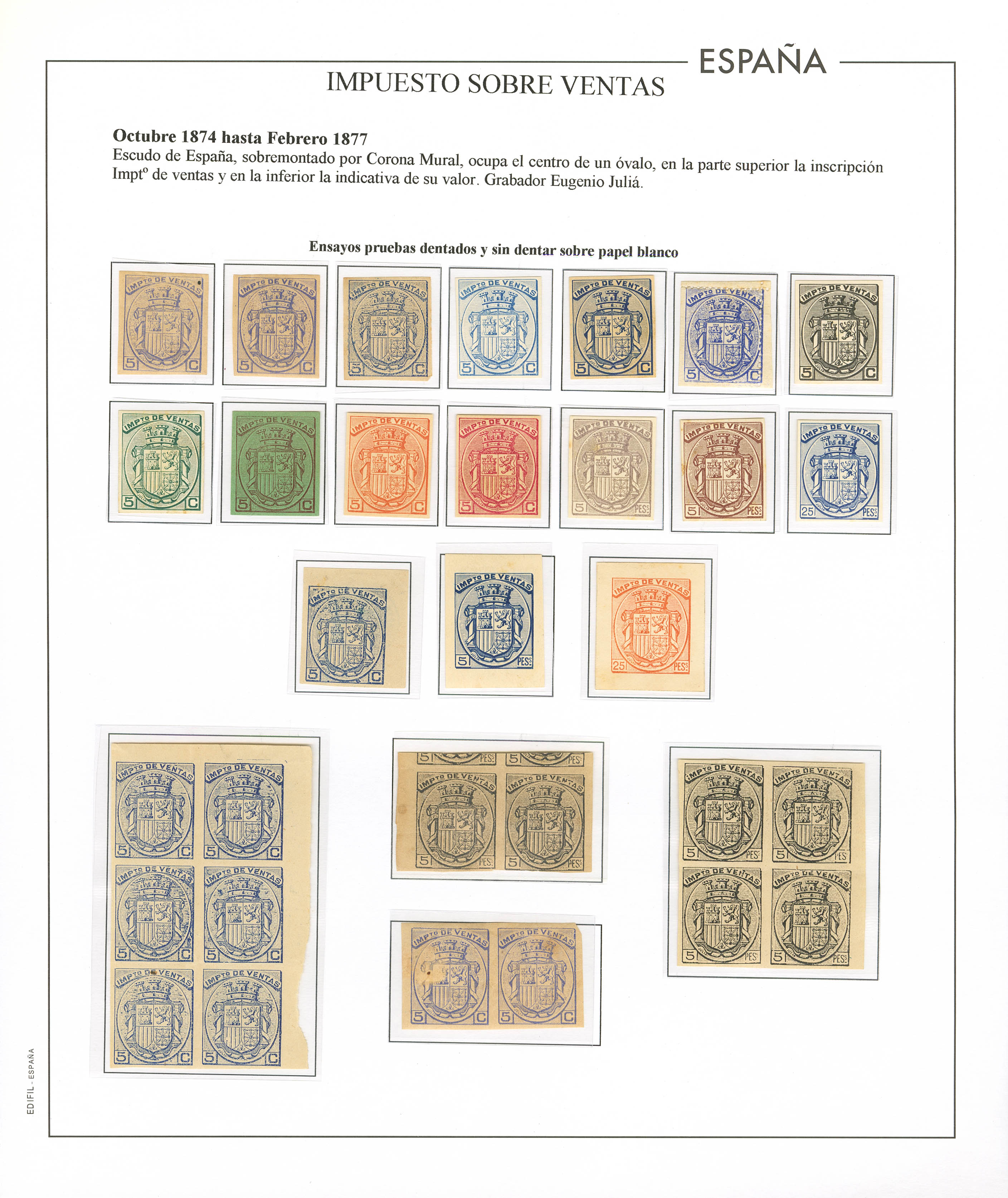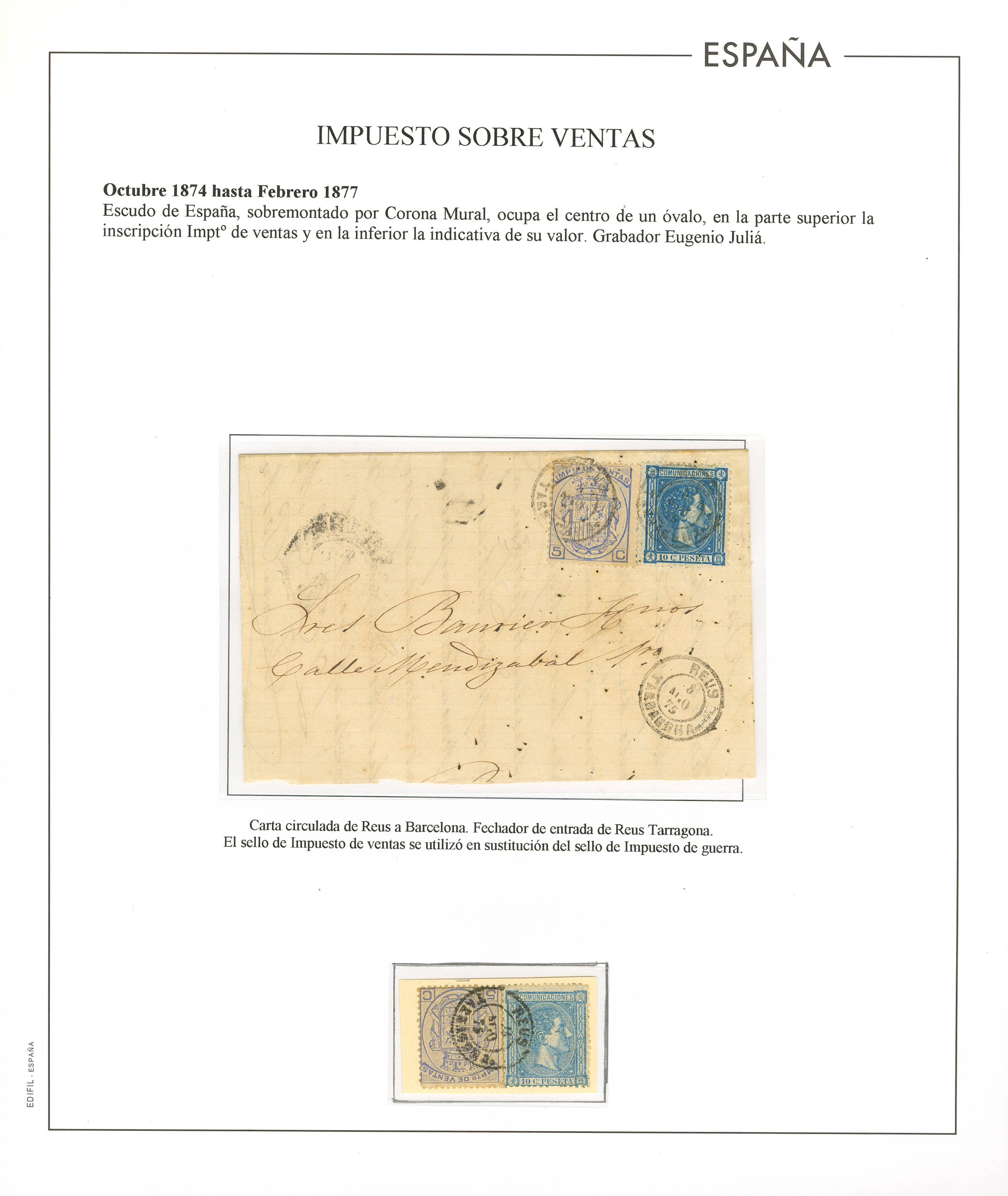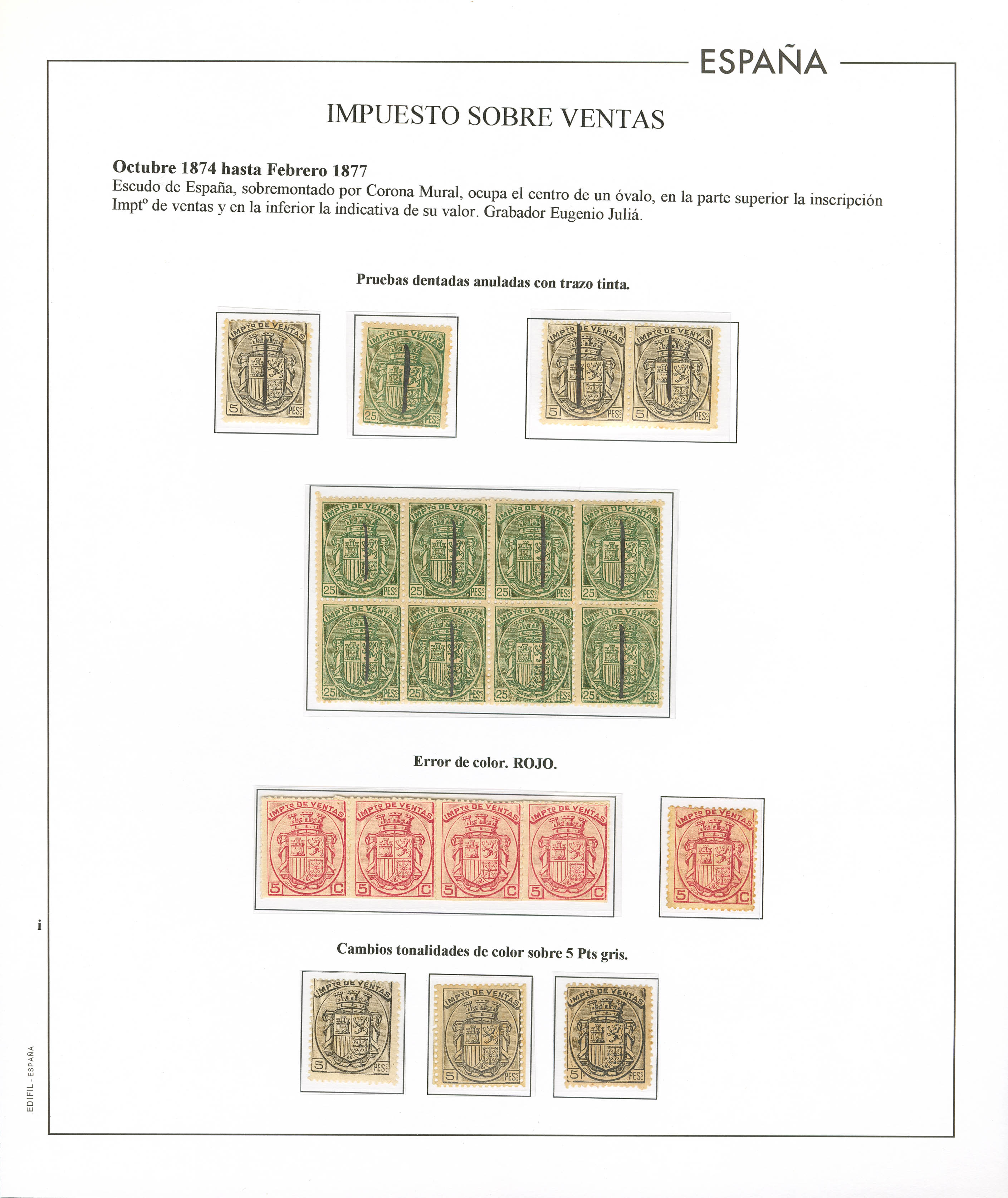 ★/(1874ca). Espectacular colección de Fiscales de IMPUESTO DE VENTAS entre 1874 y 1877, en nuevo y usado e incluyendo las series completas tipo, variedades de color, diferentes cancelaciones, una carta circulada junto a un 10 cts azul de Alfonso XII y numerosos ensayos de color y Pruebas de Punzón, algunos en bloques. MAGNIFICO Y MUY COMPLETO Y RARISIMO CONJUNTO.