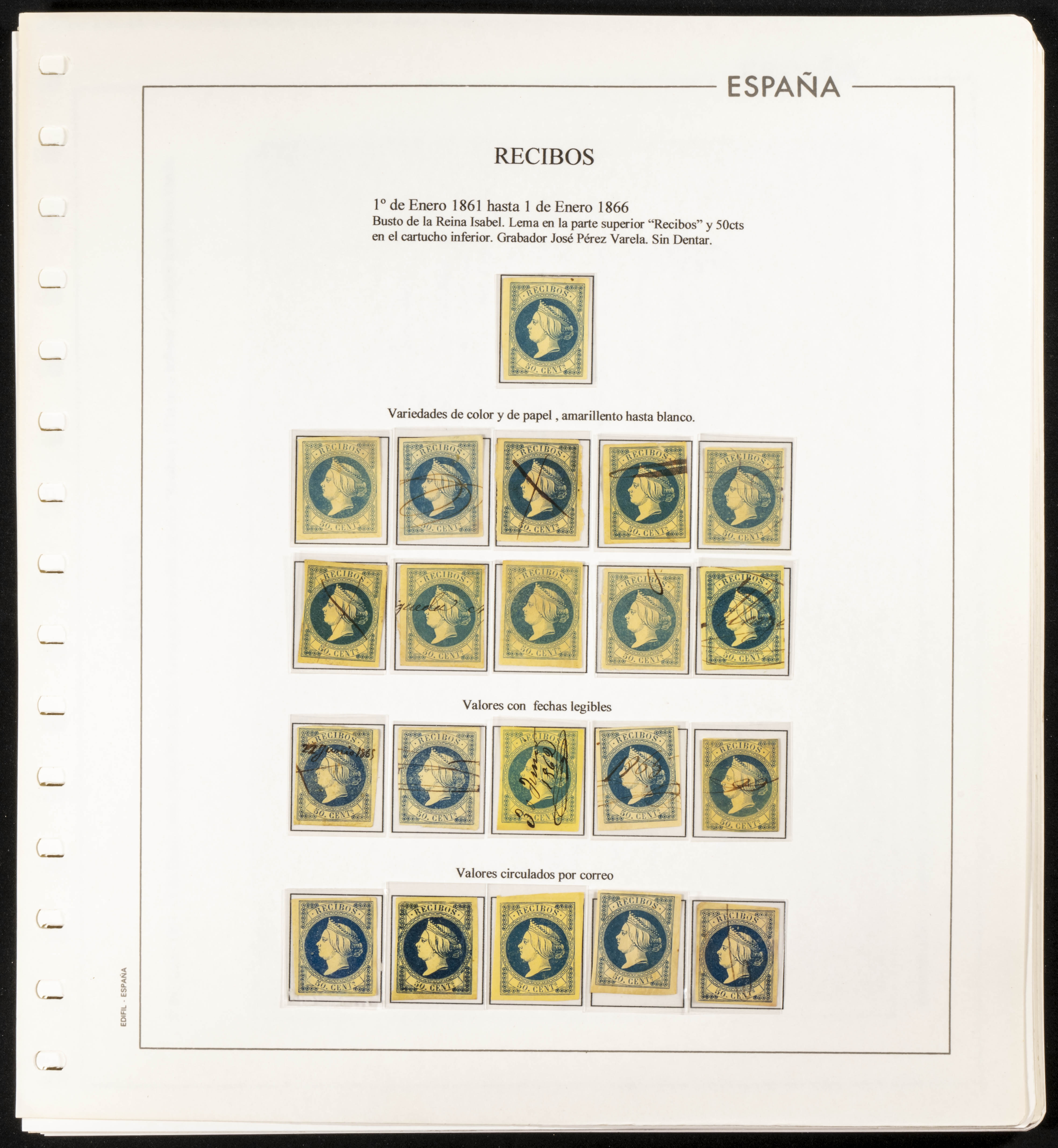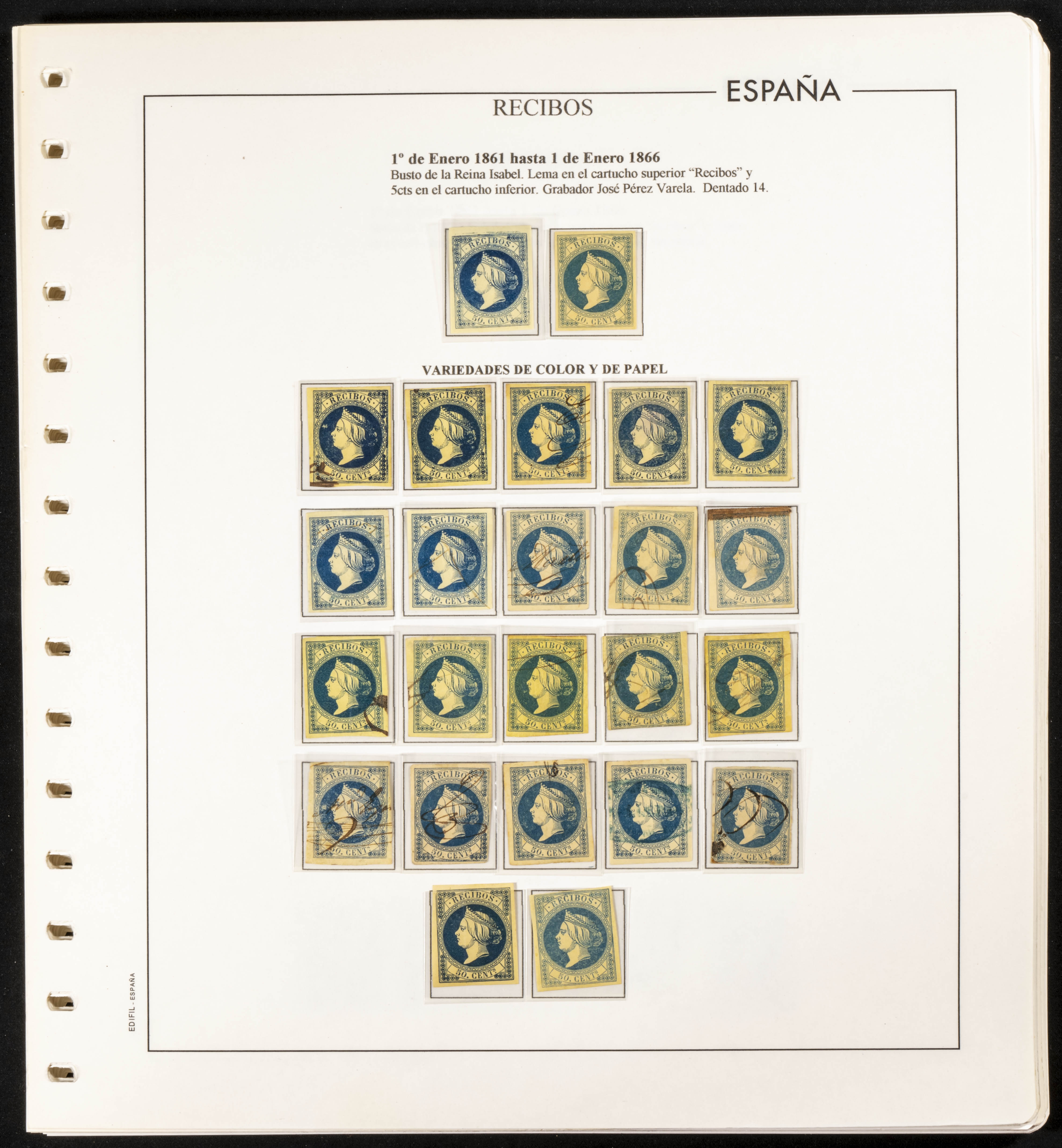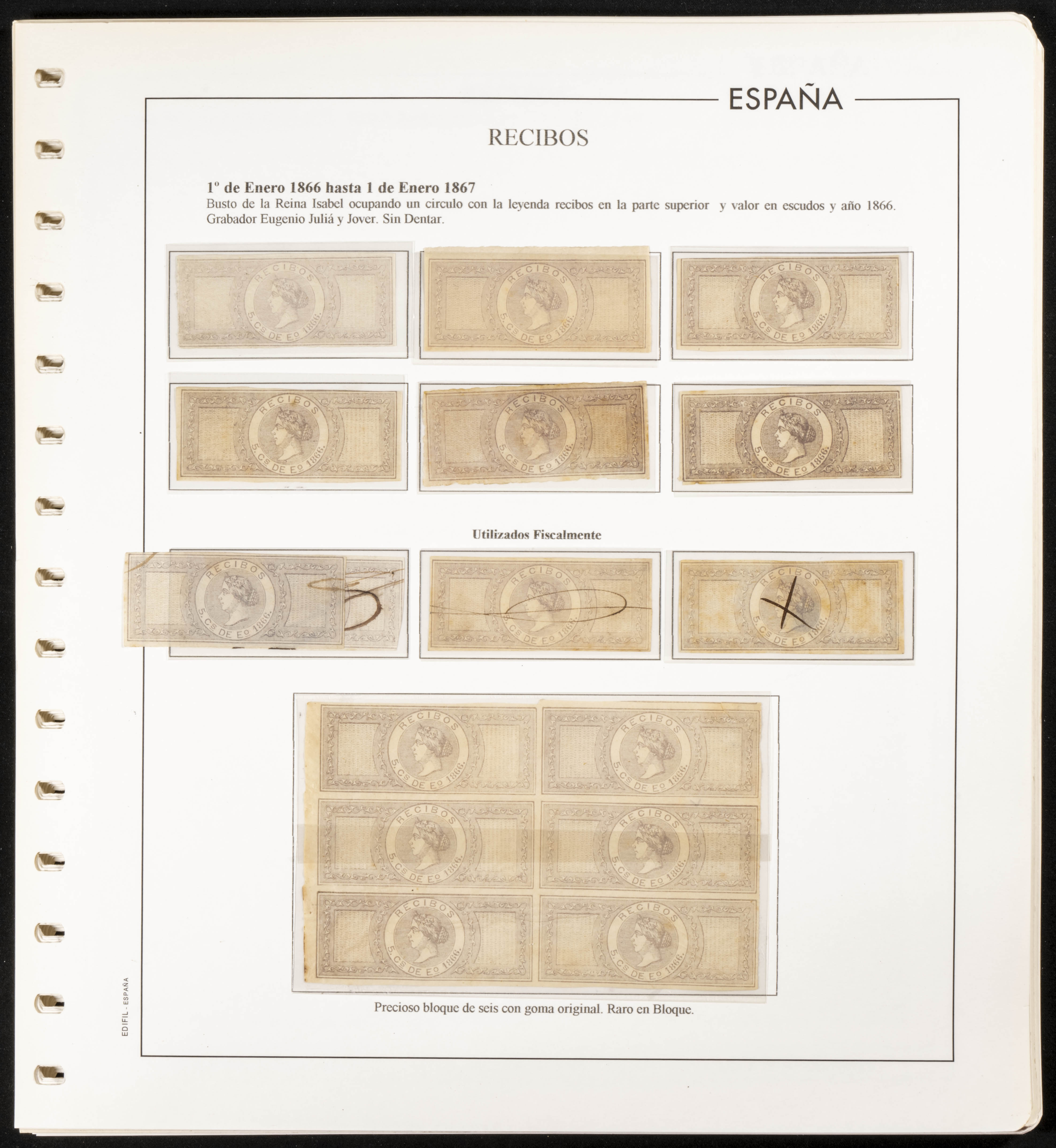 ★/(1861ca). Espectacular colección de Fiscales de RECIBOS entre 1861 y 1881, en nuevo y usado, aparte de los sellos tipo, incluye numerosas variedades de color, diferentes cancelaciones, siete documentos diversos, Ensayos de color, grandes bloques, Habilitados por la Nación, sobrecargas de Impuesto de Guerra, Maculaturas, etc. MAGNIFICO Y MUY COMPLETO Y RARO CONJUNTO.