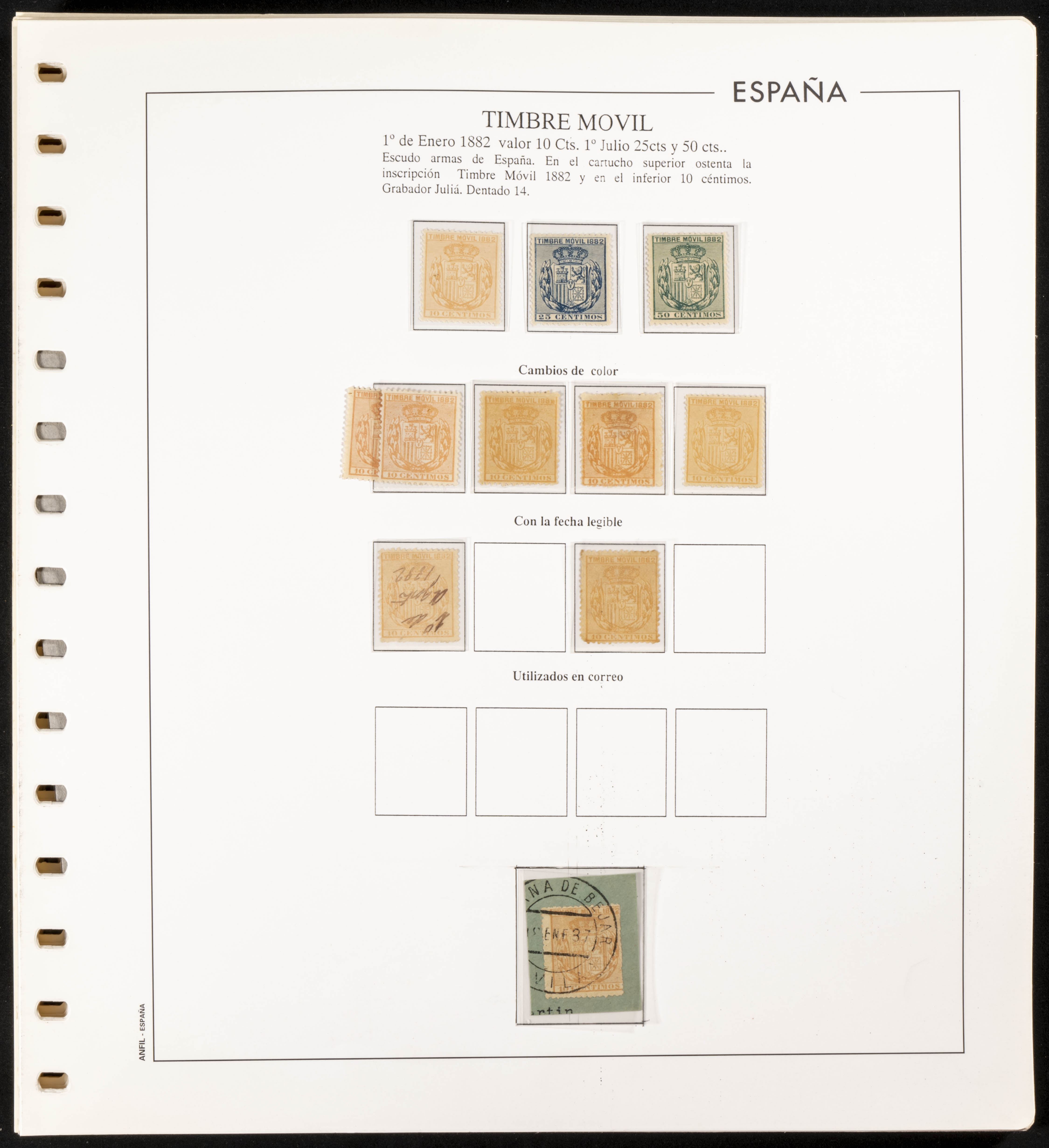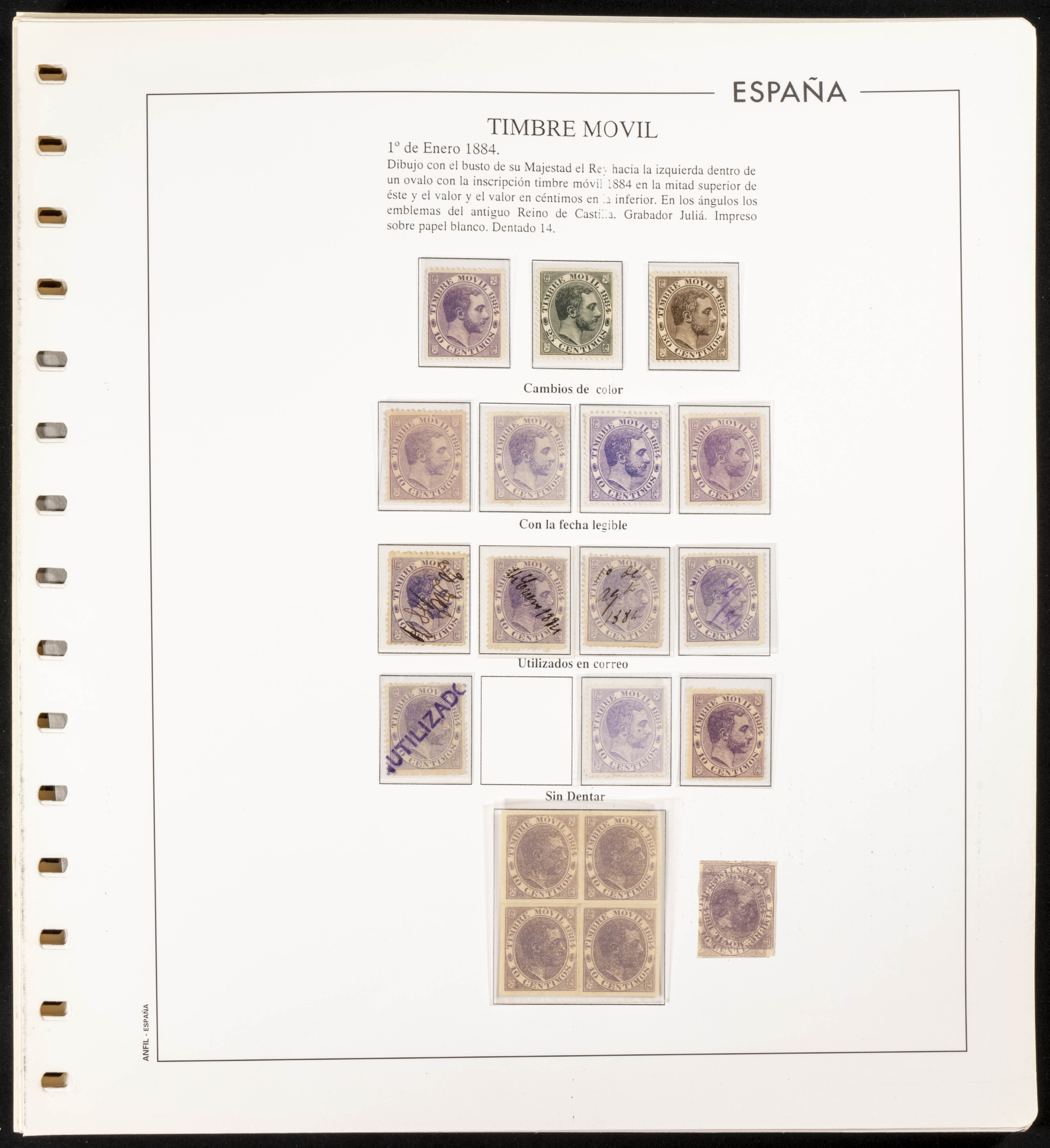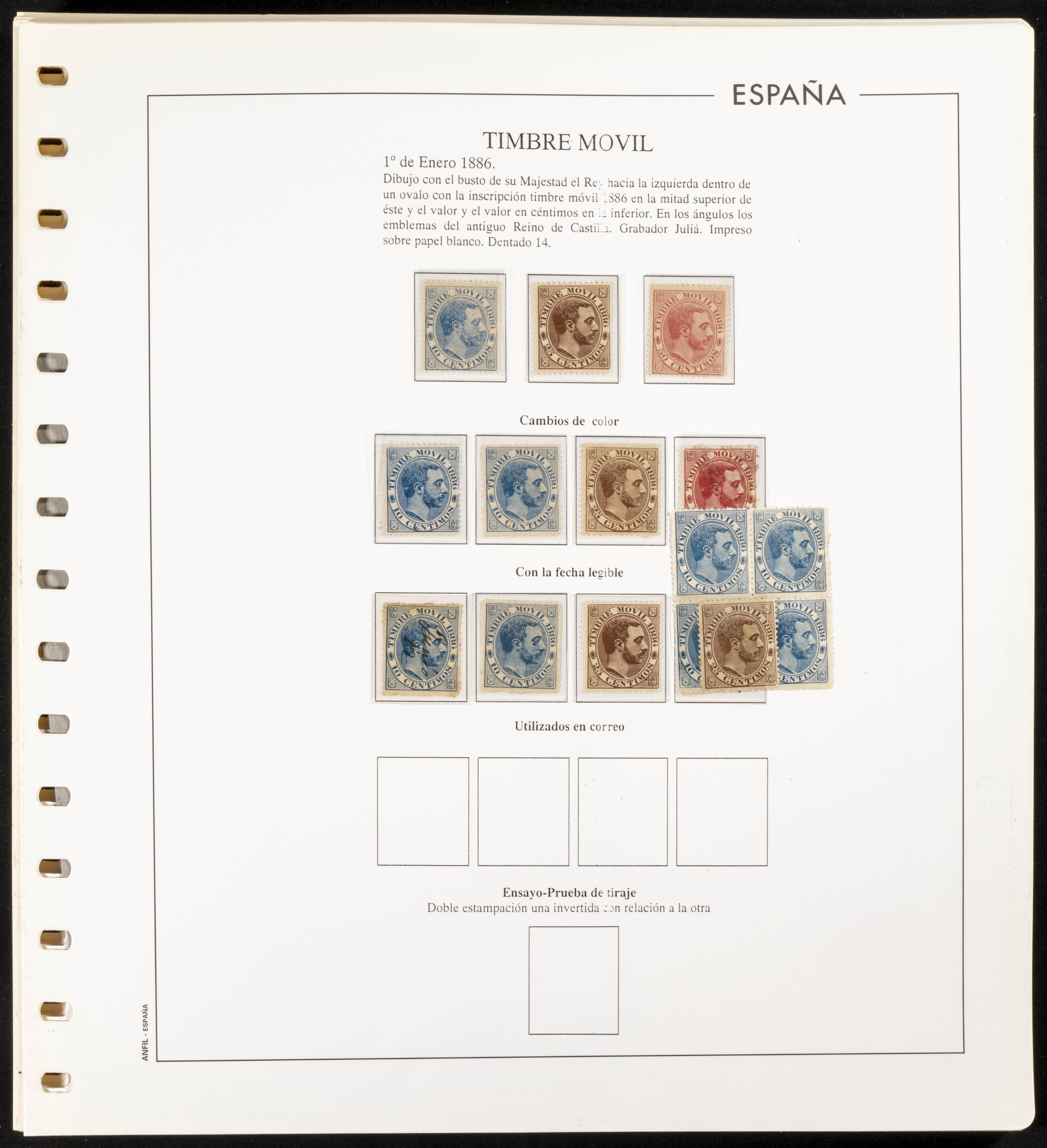 ★/(1882ca). Espectacular colección de Fiscales de TIMBRE MOVIL y ESPECIAL MOVIL entre 1882 y 1911, en nuevo y usado, aparte de los sellos tipo, incluye numerosas variedades (impresión sobre la goma, sin dentar, defectos de impresión, etc), diferentes tonalidades, matasellos diversos, algún Ensayo de color y documentos o cartas y fiscales publicitarios. MAGNIFICO Y MUY COMPLETO Y RARO CONJUNTO.