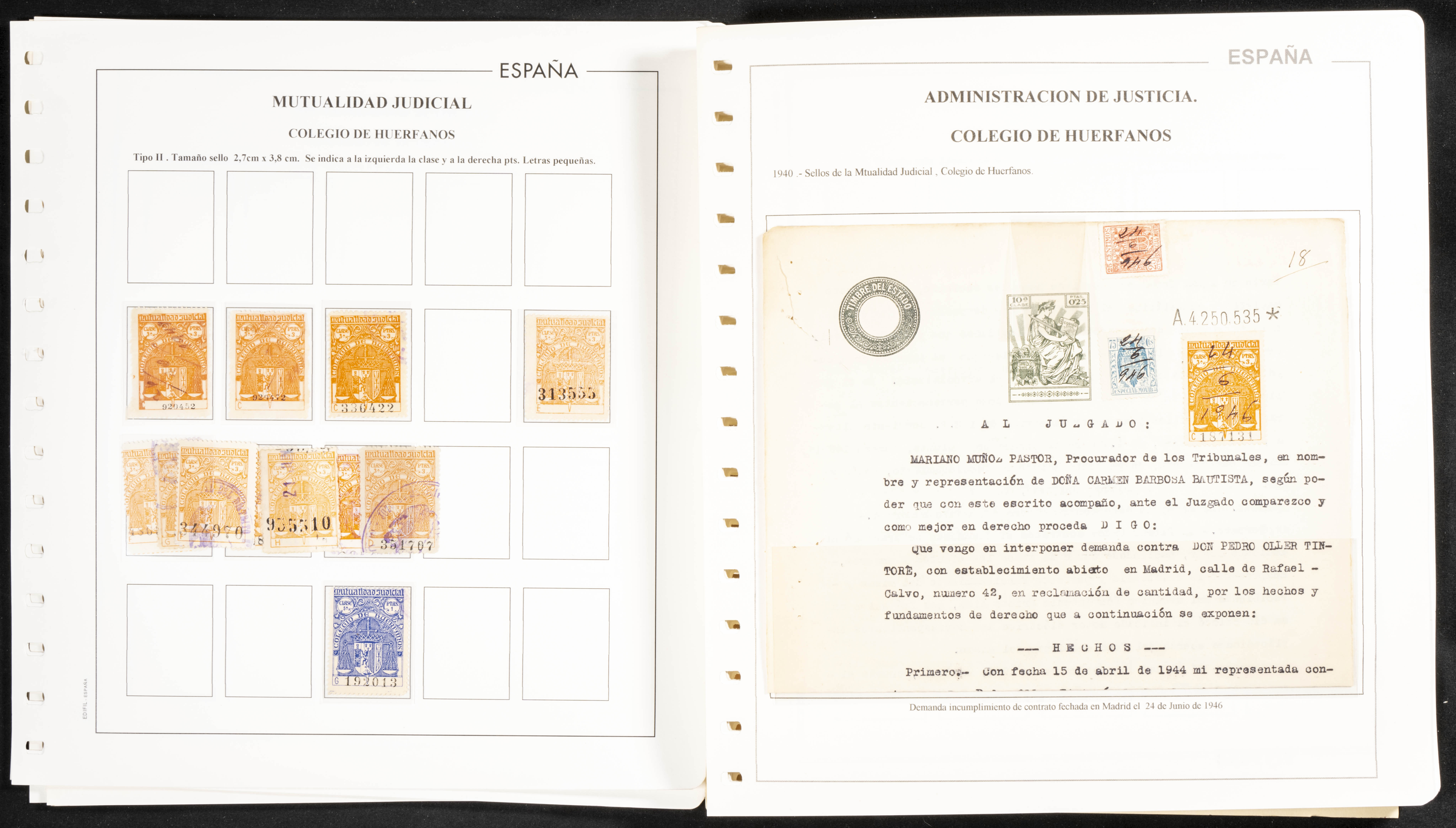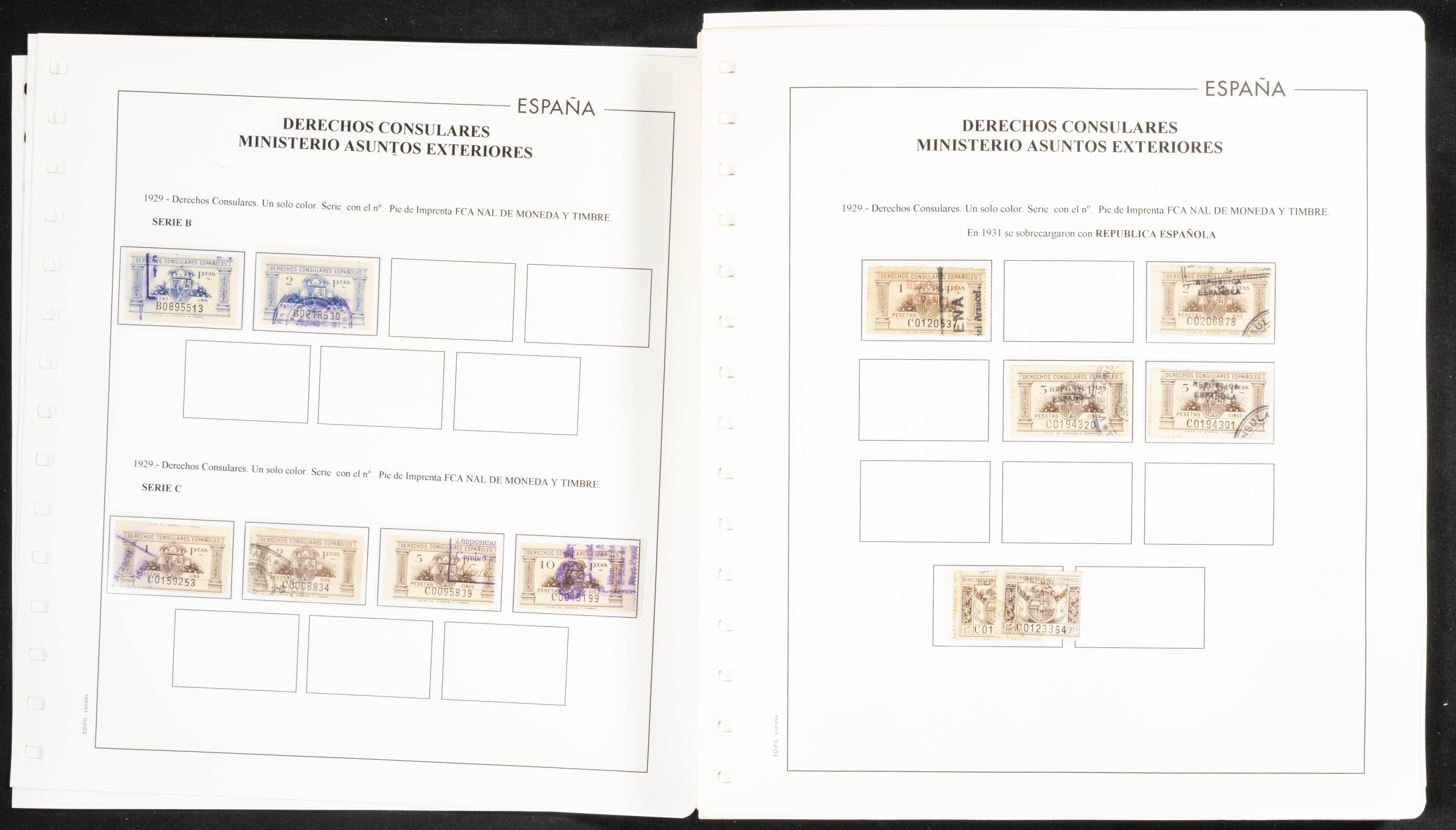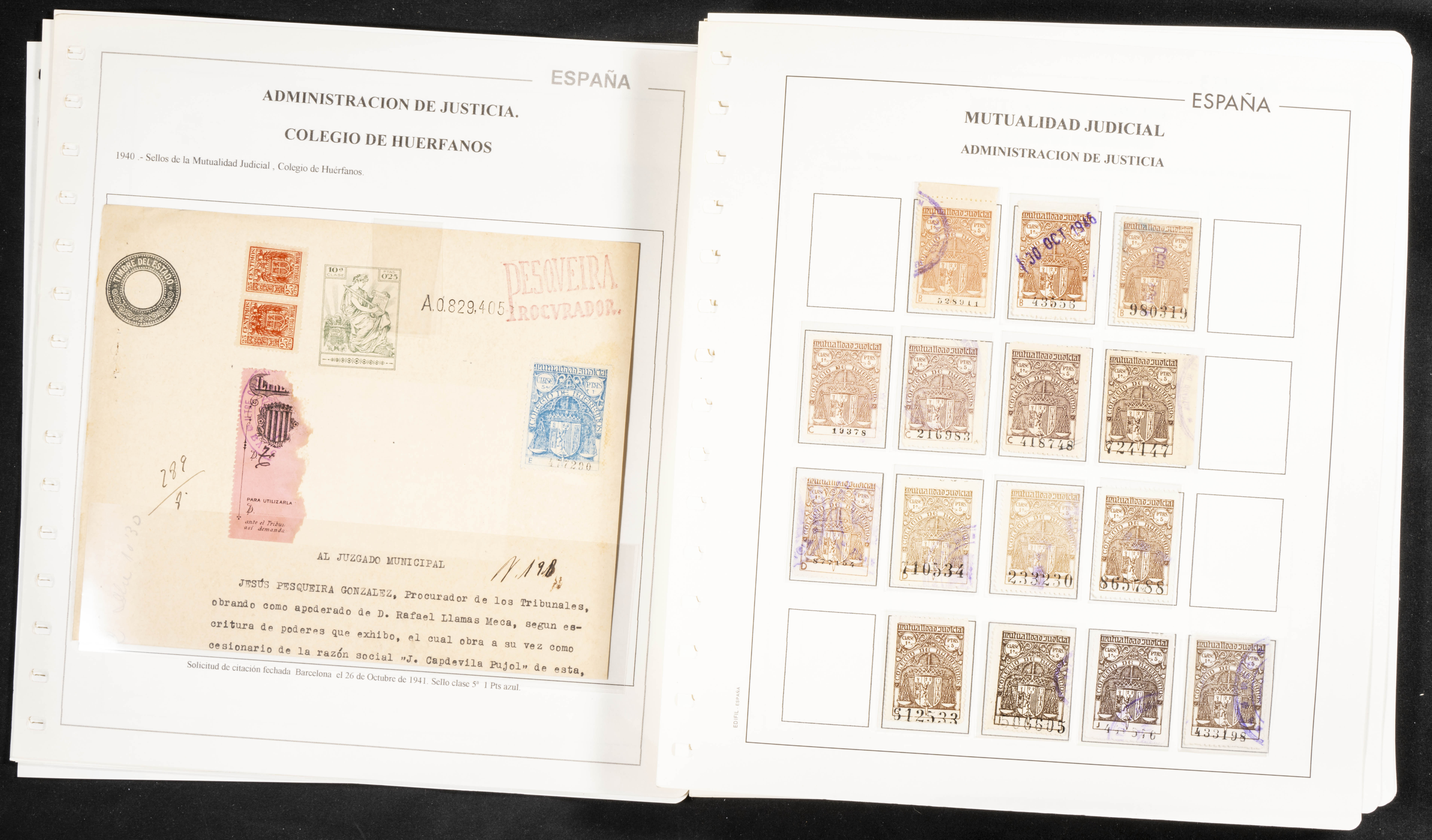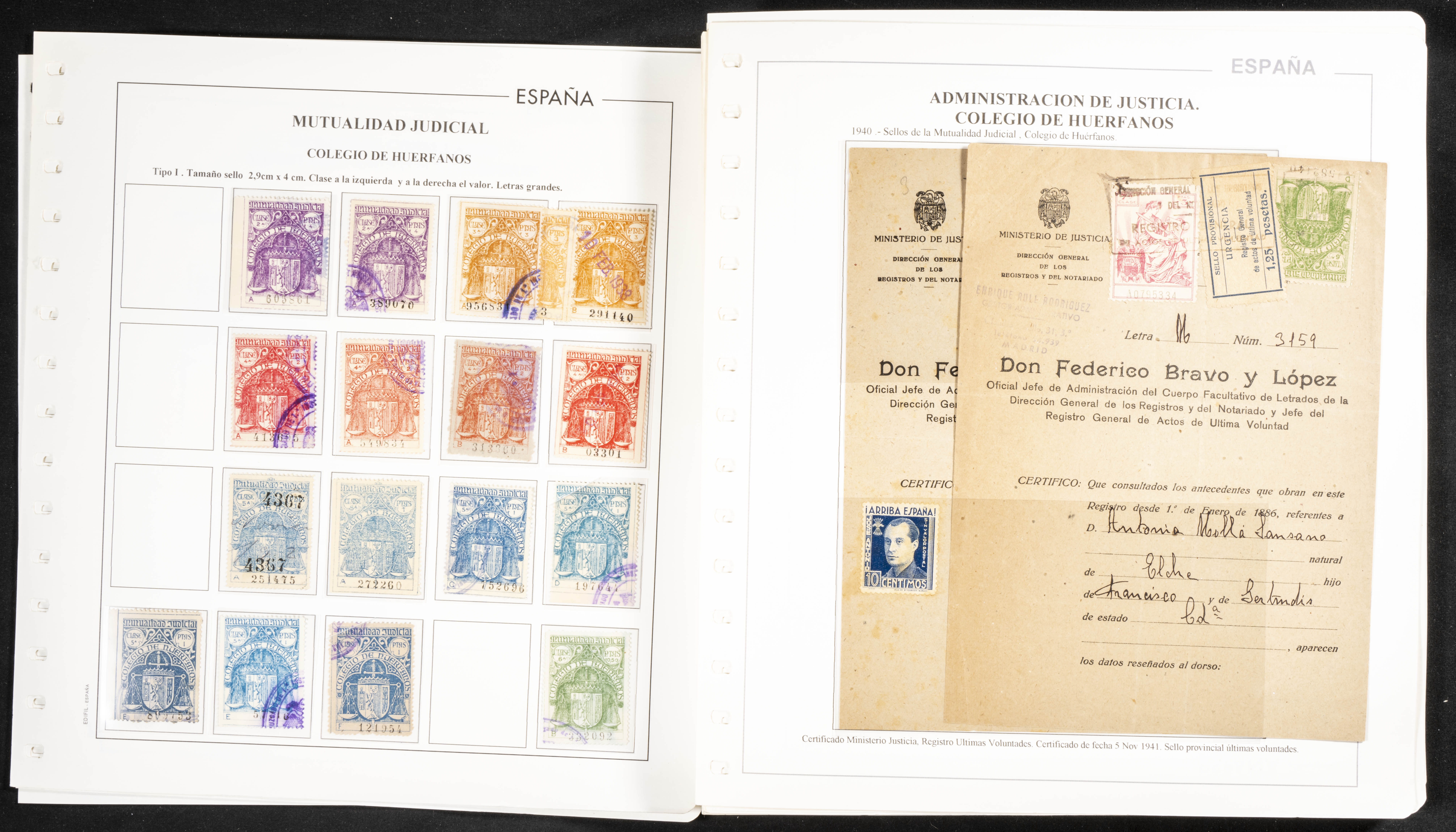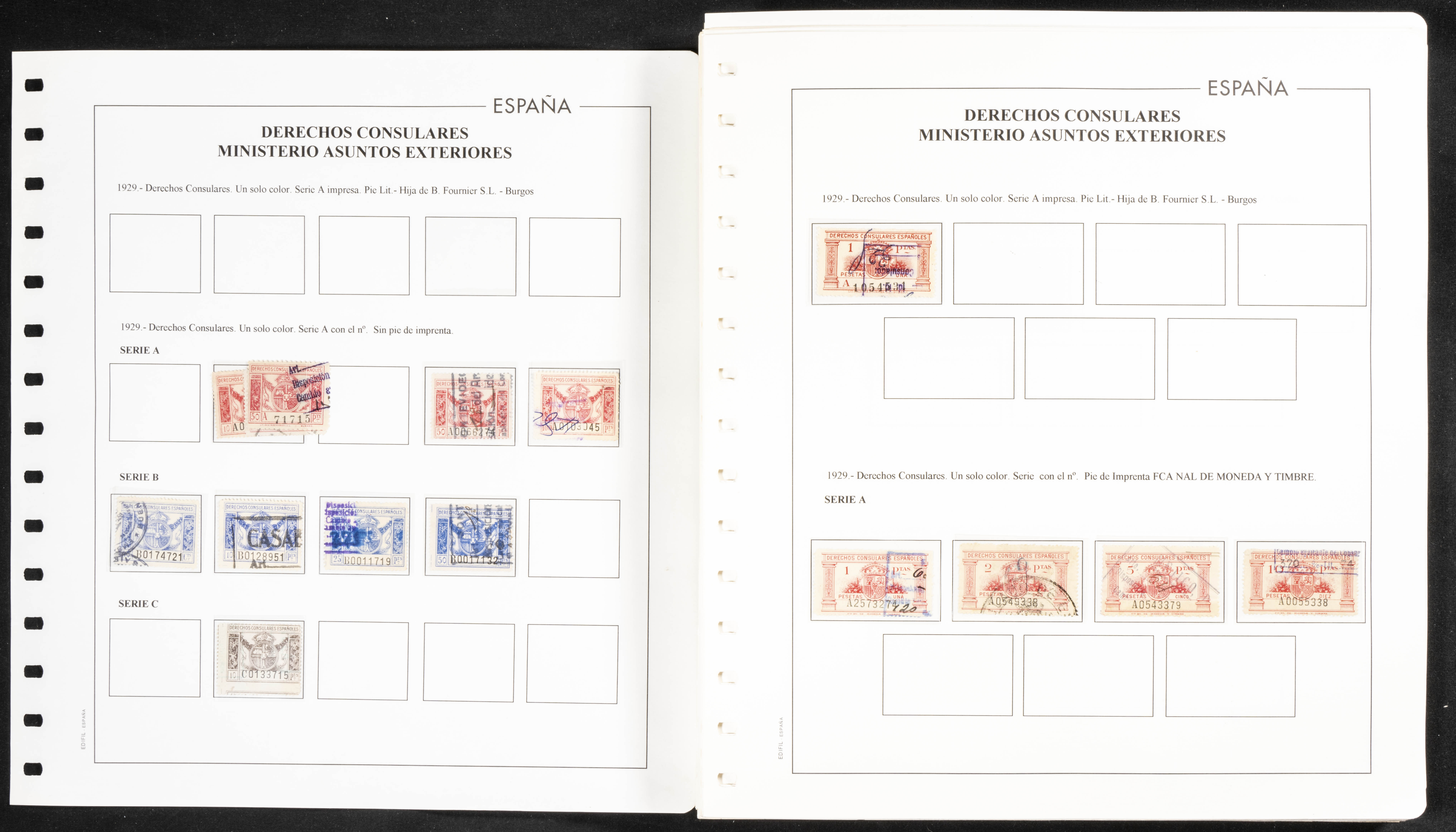 (★)/(1929ca). Interesante conjunto-colección de Fiscales de DERECHOS CONSULARES, MUTUALIDAD JUDICIAL, MINISTERIO DEL INTERIOR, DERECHOS DE ADUANAS, IMPUESTO DE ADUANAS PARA PERFUMERIA, DERECHO CONVENCIONAL DE ADUANAS y POLIZAS DE TURISMO entre 1929 y 1975, en nuevo y usado e incluyendo grandes bloques, fragmentos, documentos diversos y un libro de Aduanas para identificación de carruajes, además de alguna variedad. IMPRESCINDIBLE EXAMINAR.