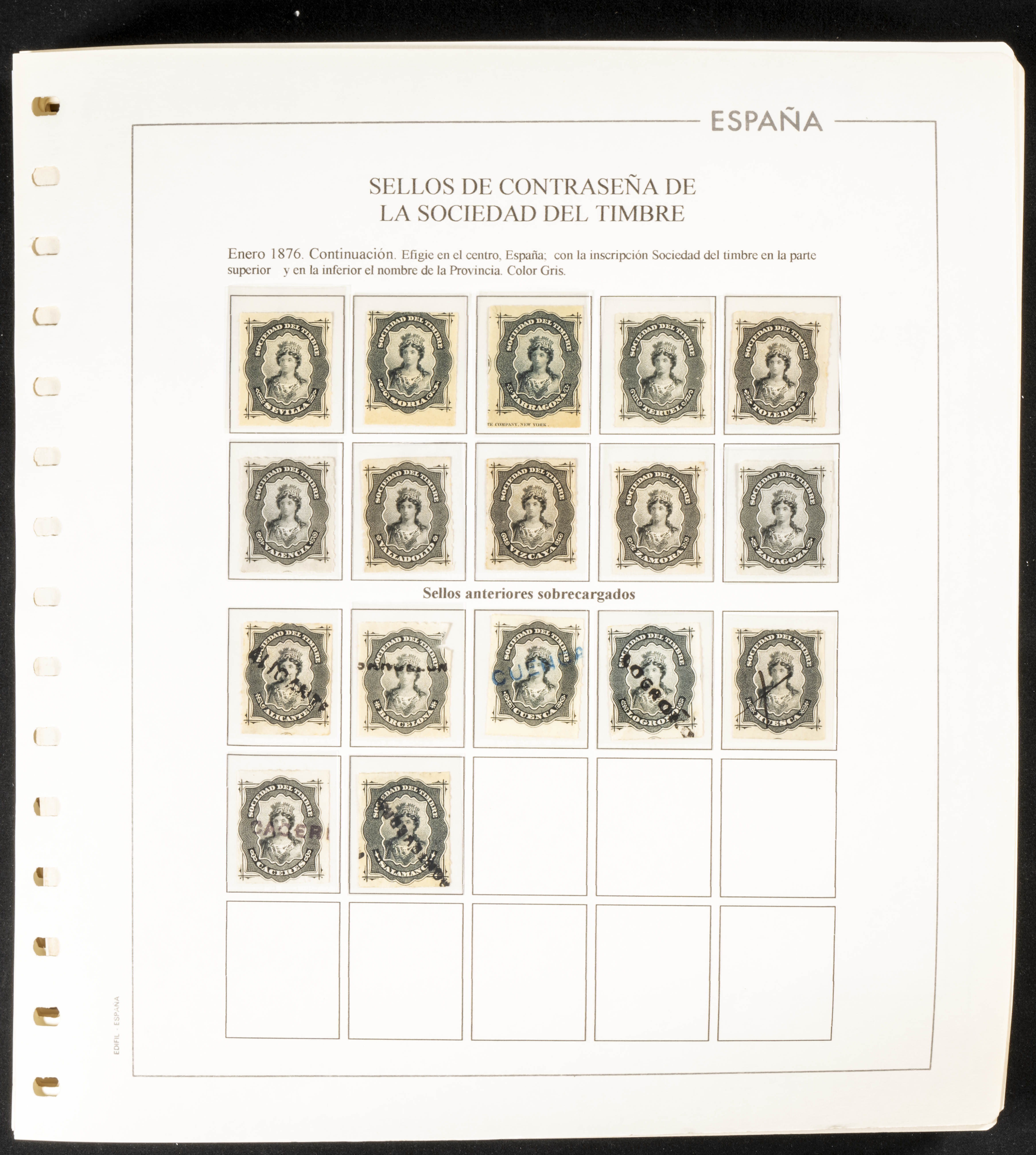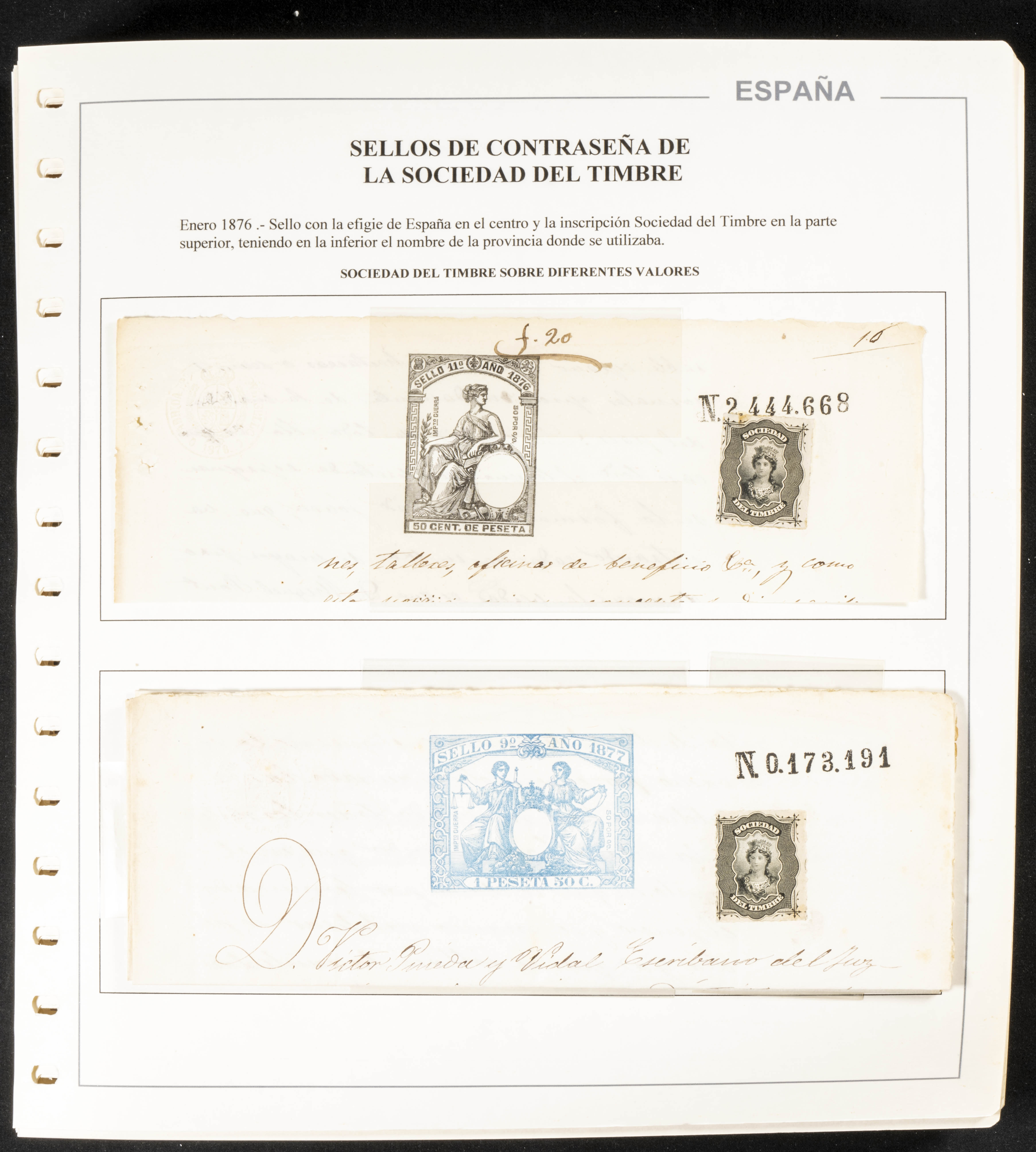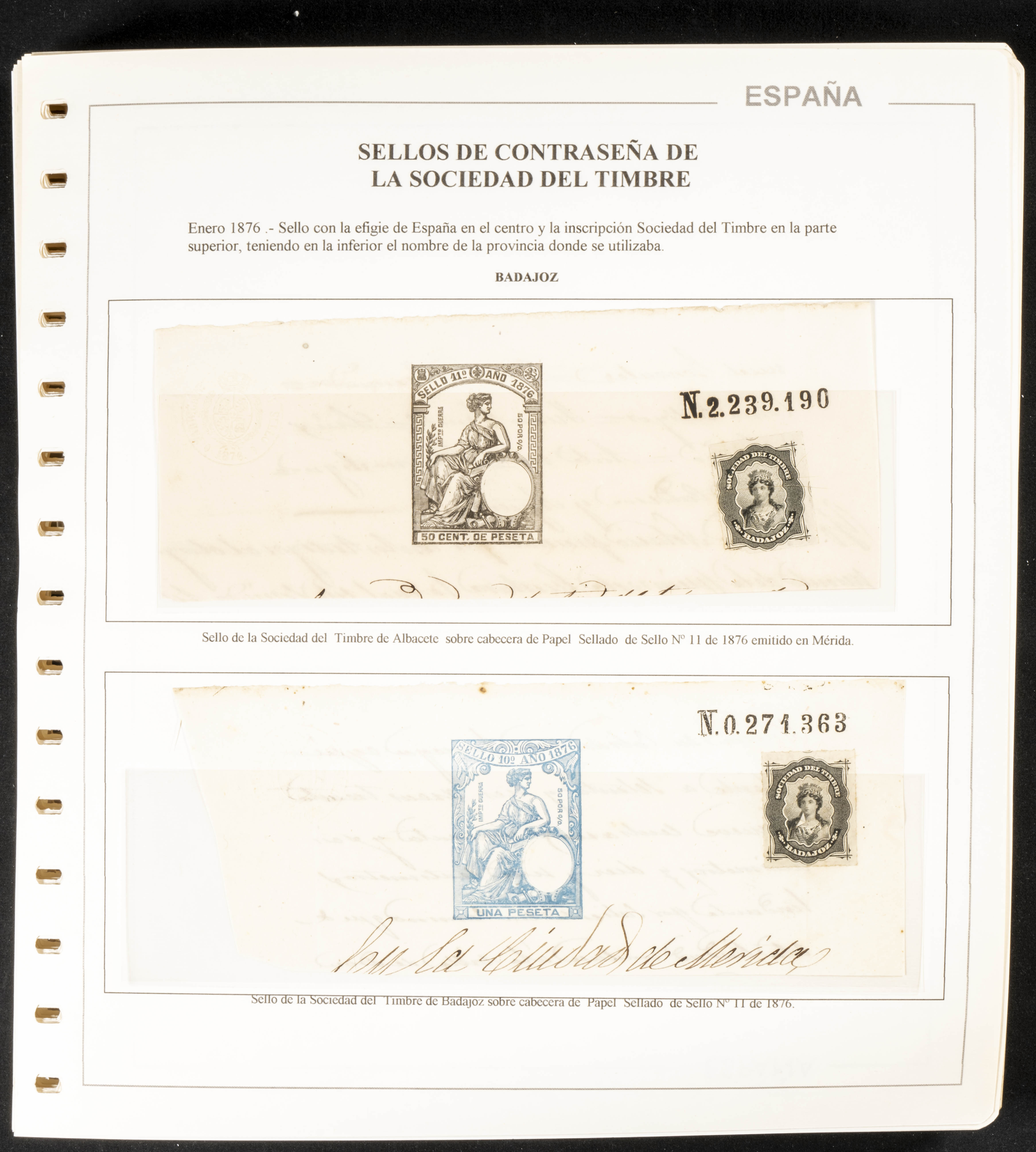 (★)/(1876ca). Interesante colección de sellos de contraseña SOCIEDAD DEL TIMBRE con series completas nuevas y usadas, así como sueltas con las cancelaciones provinciales, incluye numerosos documentos completos y fragmentos de Papel Sellado acompañados de este tipo de fiscales y muchos de los valores con sobrecarga HABILITADO PARA PAPEL SELLADO. IMPRESCINDIBLE EXAMINAR.