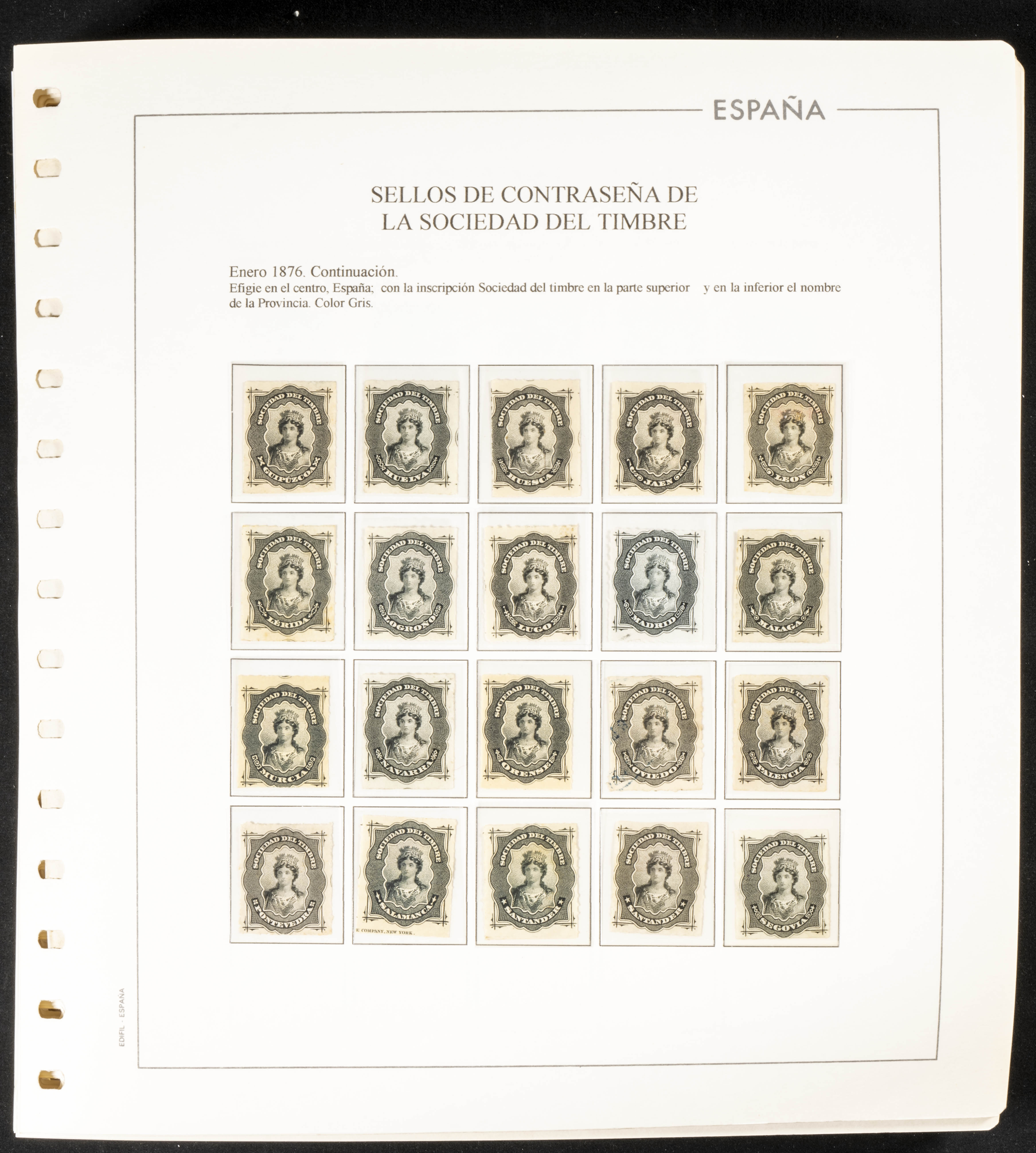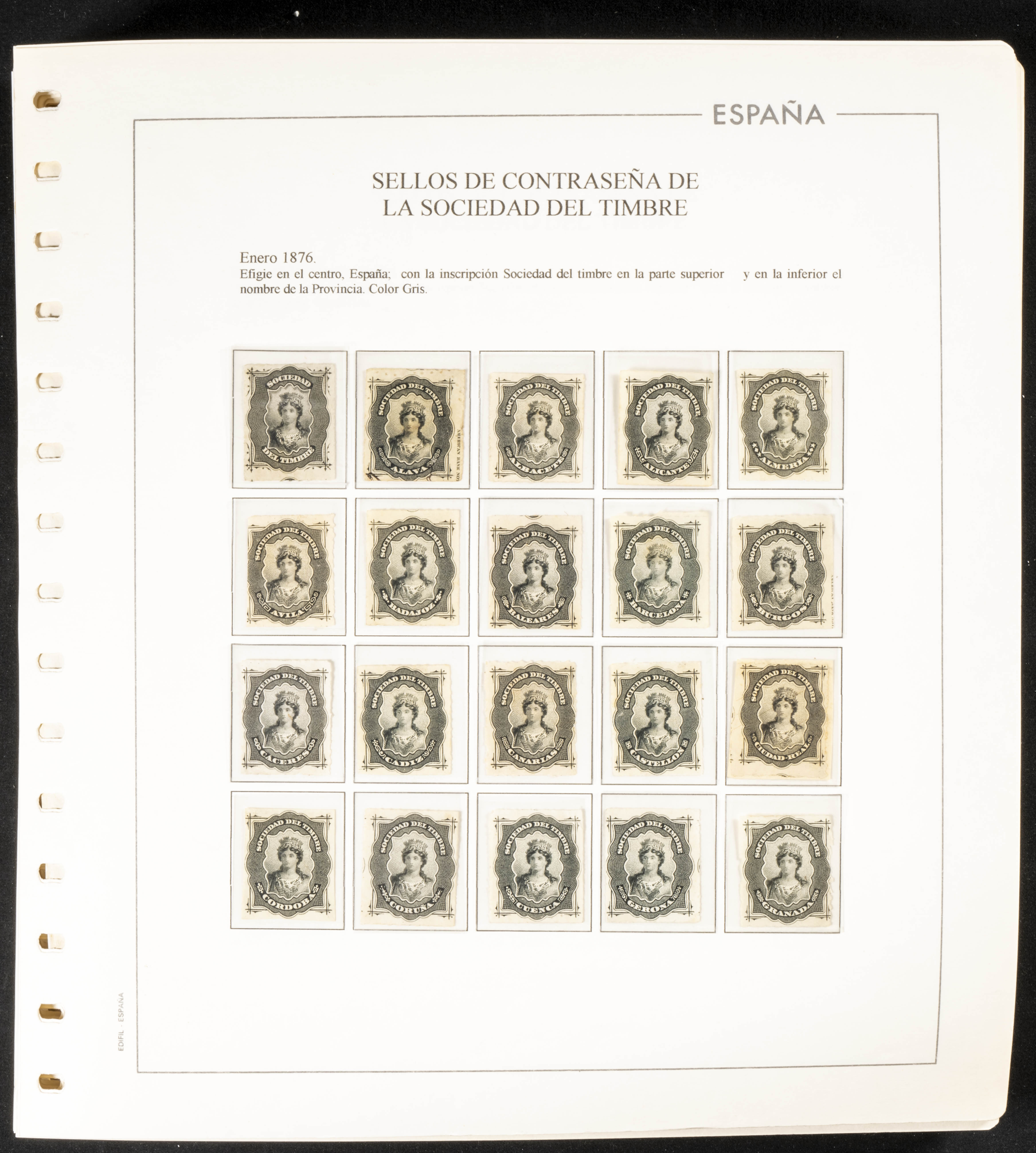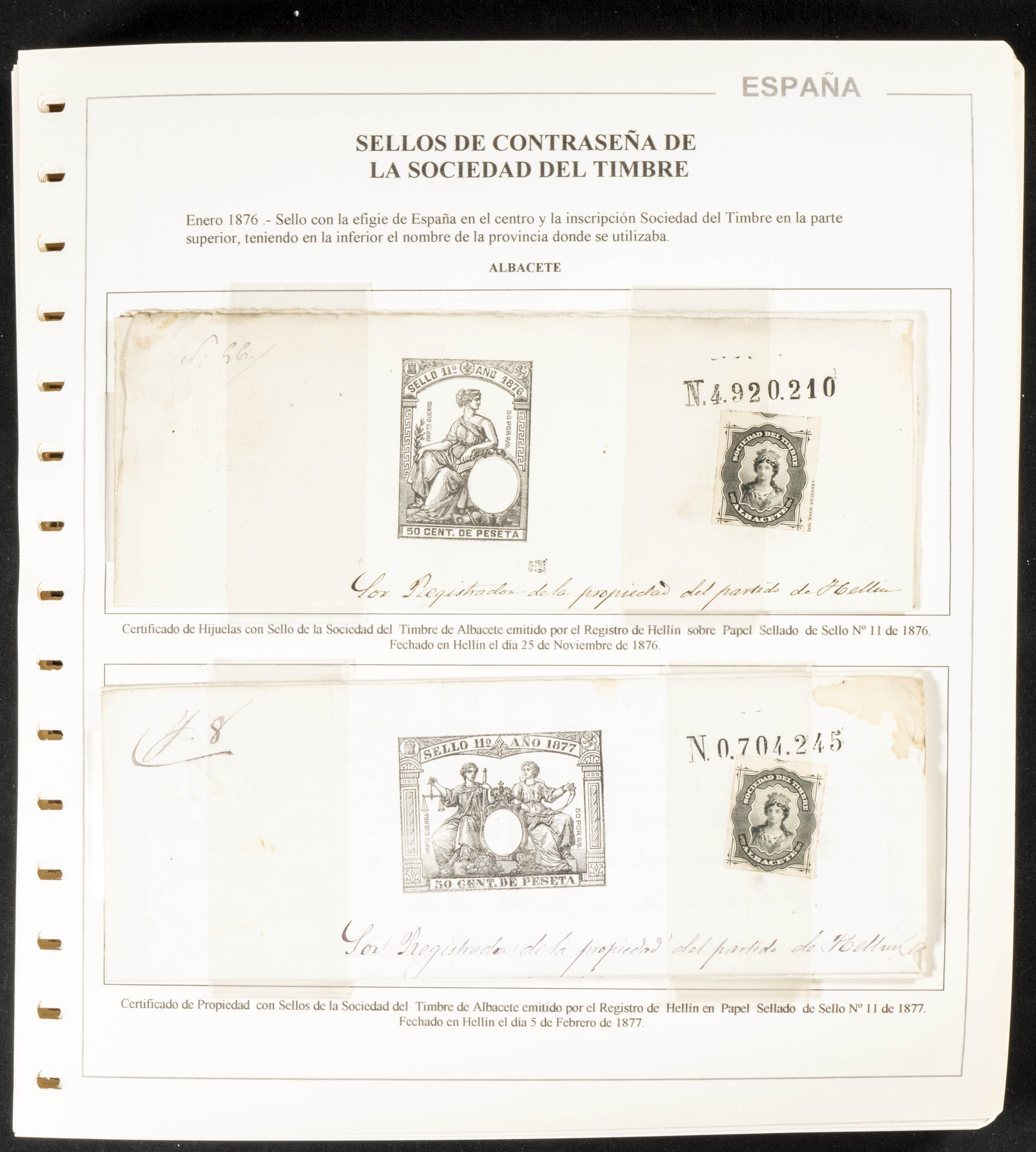 (★)/(1876ca). Interesante colección de sellos de contraseña SOCIEDAD DEL TIMBRE con series completas nuevas y usadas, así como sueltas con las cancelaciones provinciales, incluye numerosos documentos completos y fragmentos de Papel Sellado acompañados de este tipo de fiscales y muchos de los valores con sobrecarga HABILITADO PARA PAPEL SELLADO. IMPRESCINDIBLE EXAMINAR.