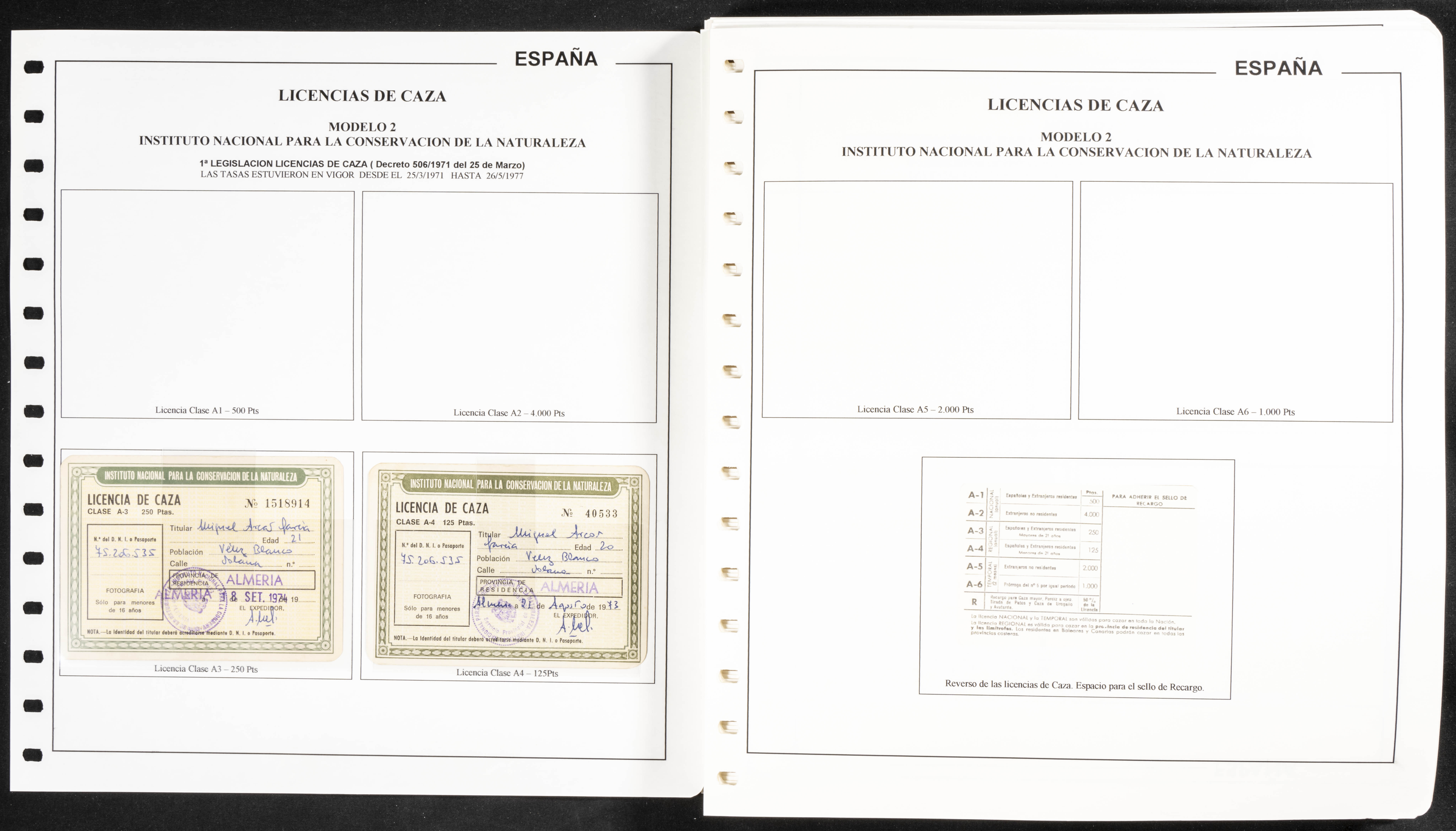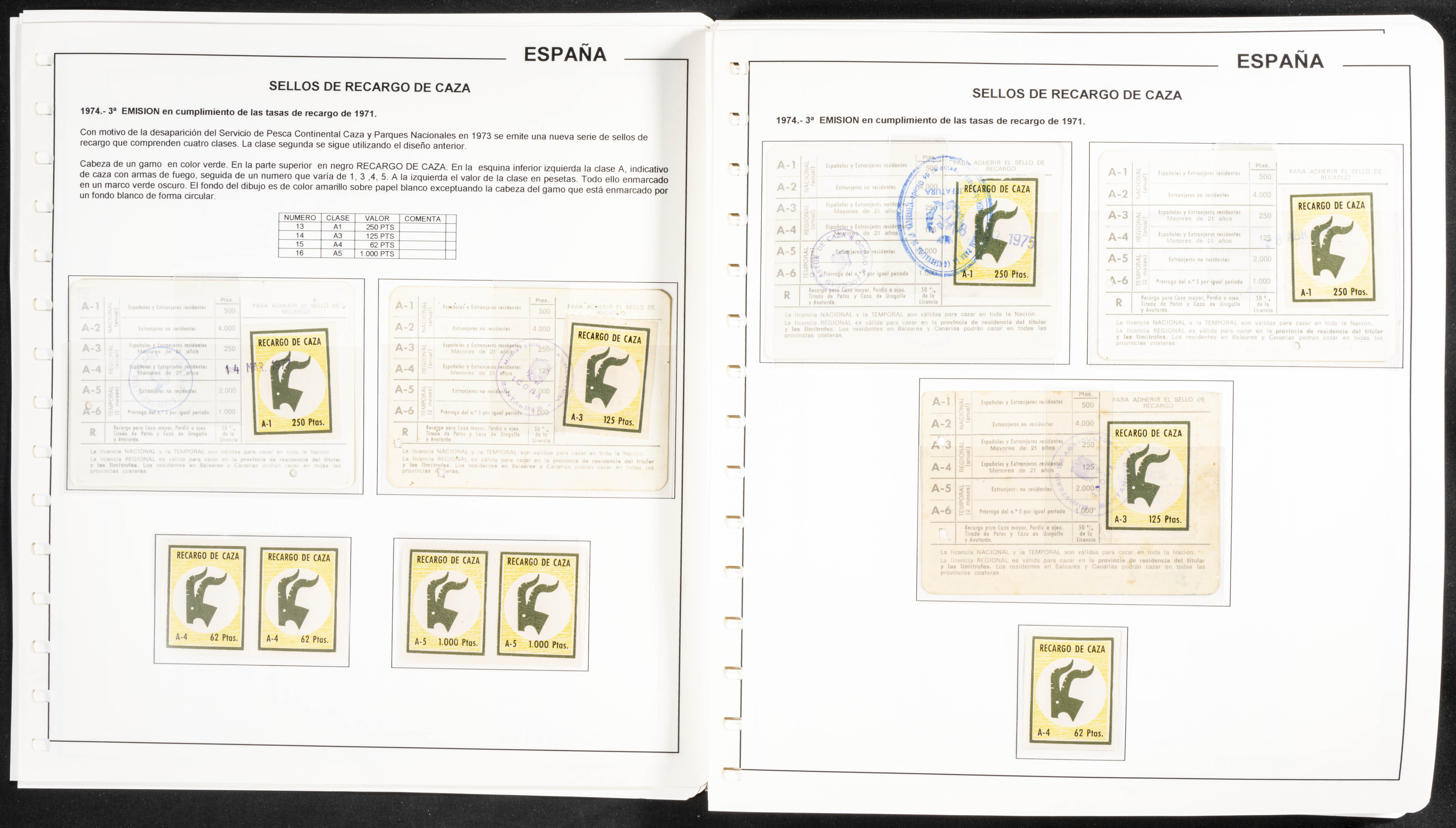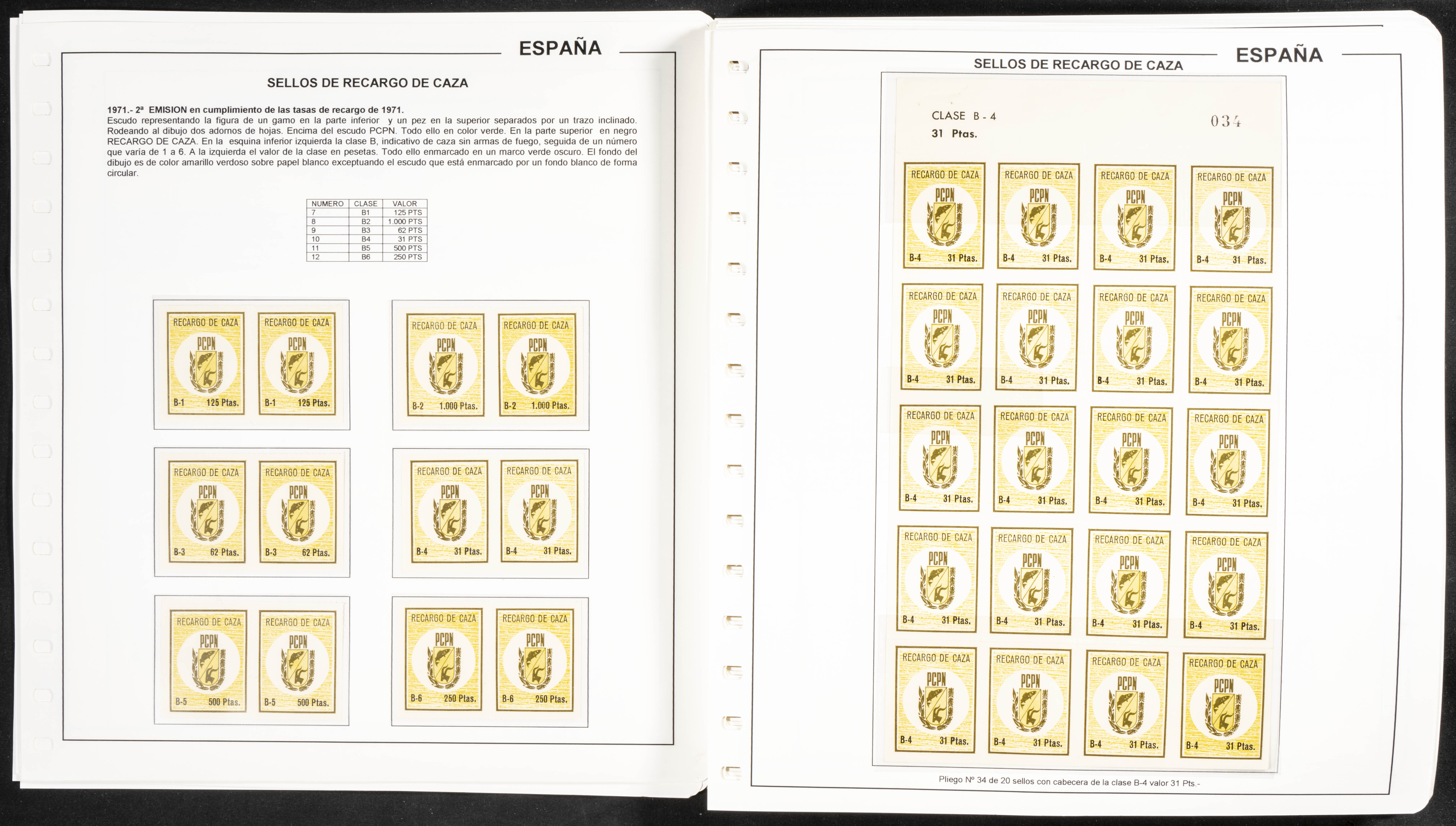 ★/(1971ca). Interesante colección de Fiscales de RECARGO DE CAZA y LICENCIAS DE CAZA entre 1971 y 1987, en nuevo y usado y con algunas series en pareja, pliegos nuevos y numerosas tarjetas de Licencias de Caza con su correspondiente sello especial, organizado por legislaciones o decretos. MAGNIFICO E INUSUAL CONJUNTO.