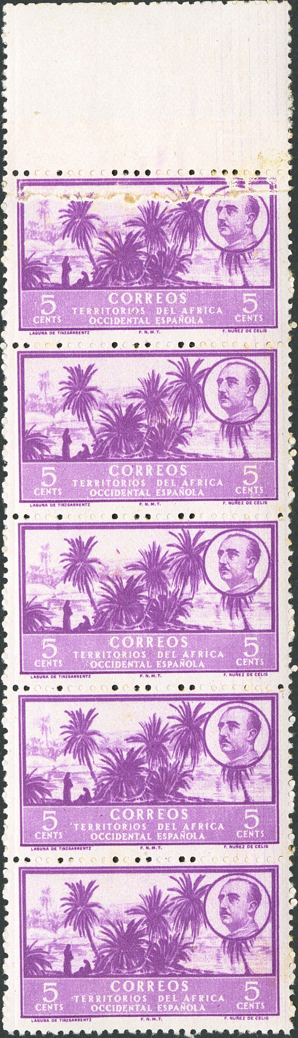 ★★ 4. 1950. 5 cts lila claro, tira vertical de cinco sellos (conservación habitual). Sello superior variedad EMPALME DEL PAPEL. MAGNIFICA Y RARA, NO RESEÑADA ESTA VARIEDAD.