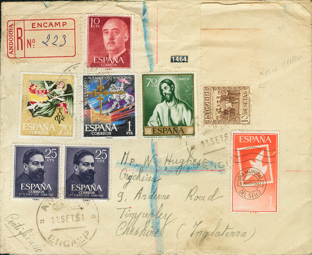 43. 1961. 10 pts castaño y diversos valores de España. Certificado de ENCAMP a TIMPERLEY (INGLATERRA). Al dorso llegada. MAGNIFICA Y RARO FRANQUEO.