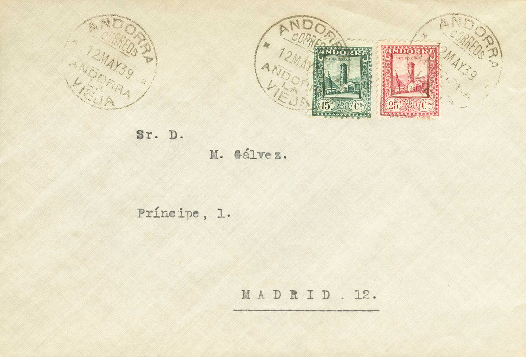 32, 35. 1939. 15 cts azul verdoso, 25 cts rosa carmín y 50 cts de Beneficencia (en el reverso). ANDORRA LA VIEJA a MADRID. MAGNIFICA.