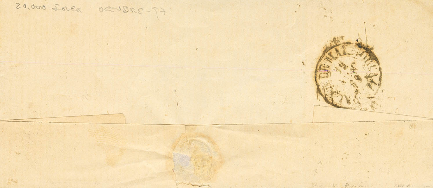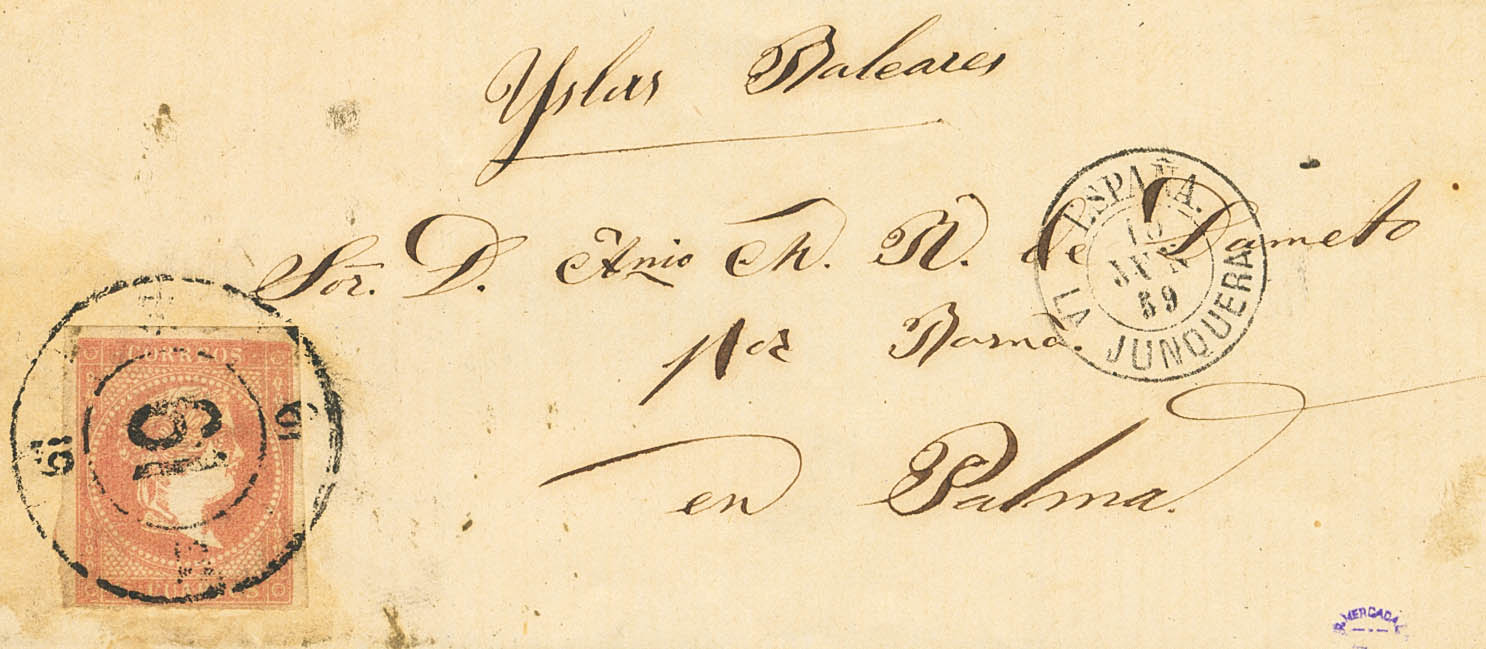 48. 1859. 4 cuartos rojo. LA JUNQUERA a PALMA. Matasello R.CARRETA Nº61. MAGNIFICA Y RARISIMA.