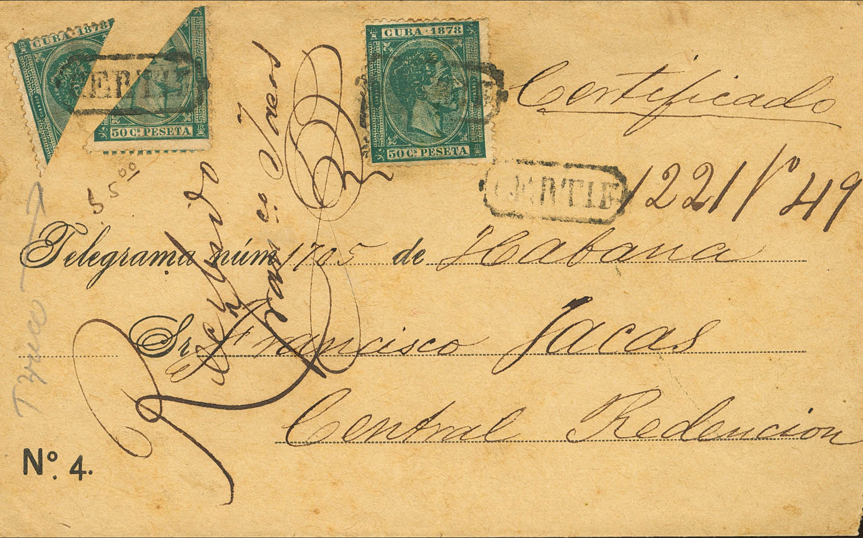 48(2). 1878. 50 cts verde, un sello y un sello BISECTADO (conserva las dos partes). Certificado de Telegrama de LA HABANA (CUBA) a REDENCION (CUBA). Matasello CERTIF, en negro, número de Telegrama y de certificado. MAGNIFICA Y EXTRAORDINARIAMENTE RARO TELEGRAMA CERTIFICADO, EL PROPIO CARLOS ECHENAGUSIA NO TIENE REGISTRADA UNA CARTA PARECIDA. Cert. ECHENAGUSIA (además esta carta nos permite observar el funcionamiento en las oficinas de correos en Cuba en las que tenían preparados sellos bisectados y que su uso estaba más normalizado que en la península, en este raro telegrama utilizaron dos mitades previamente cortadas para componer la tarifa correcta).