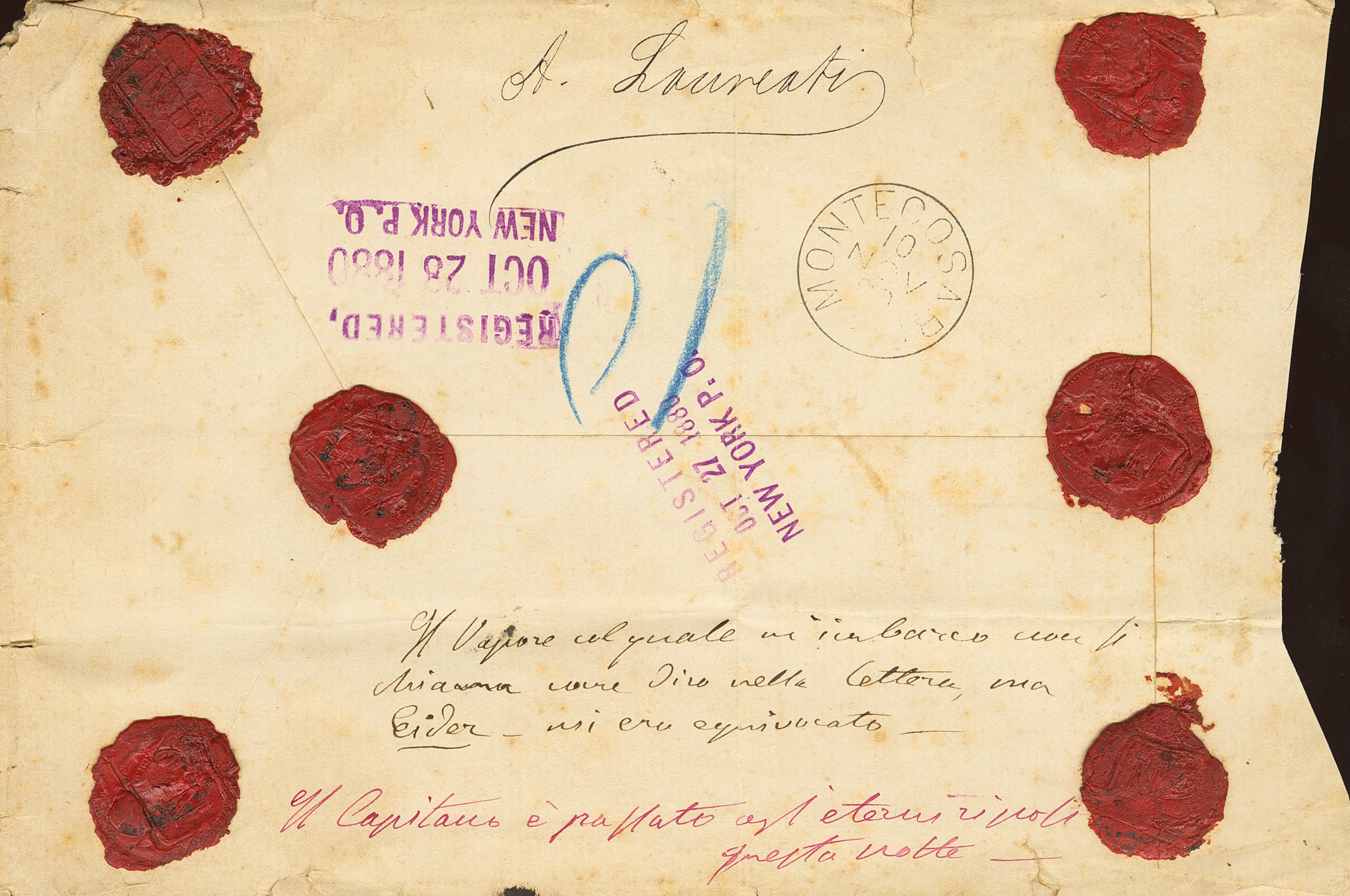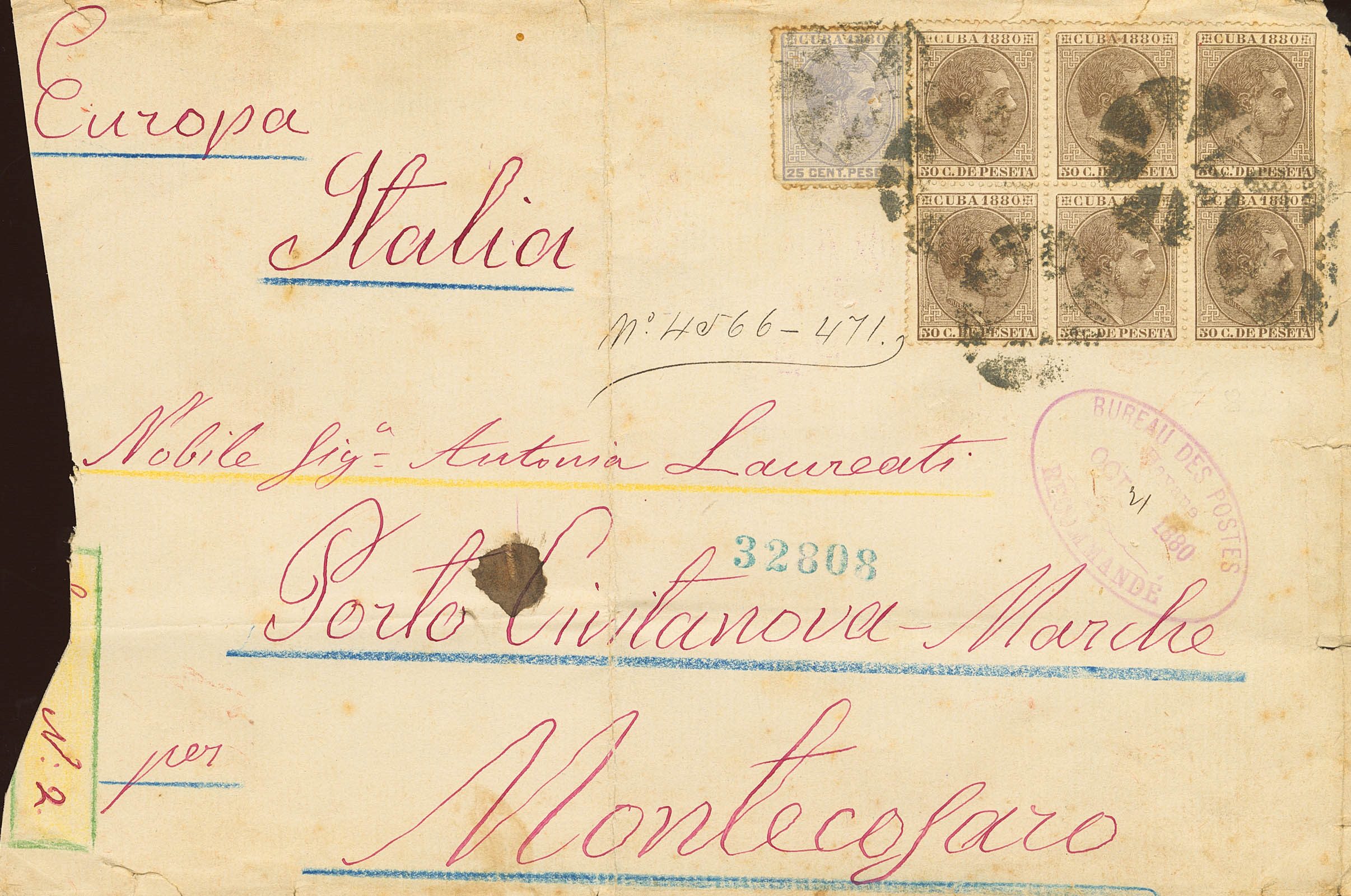 59, 60(6). 1880. 25 cts azul y 50 cts castaño, bloque de seis. Certificado de CUBA a MONTECOSARO (ITALIA), circulado vía Nueva York. MAGNIFICA Y PIEZA DE ENORME ESPECTACULARIDAD CON UN INUSUAL DESTINO, SIN DUDA ALGUNA SE TRATA DE UNO DE LOS CERTIFICADOS DE ALFONSO XII MAS IMPRESIONANTE DE TODOS LOS CONOCIDOS CIRCULADOS EN ULTRAMAR.