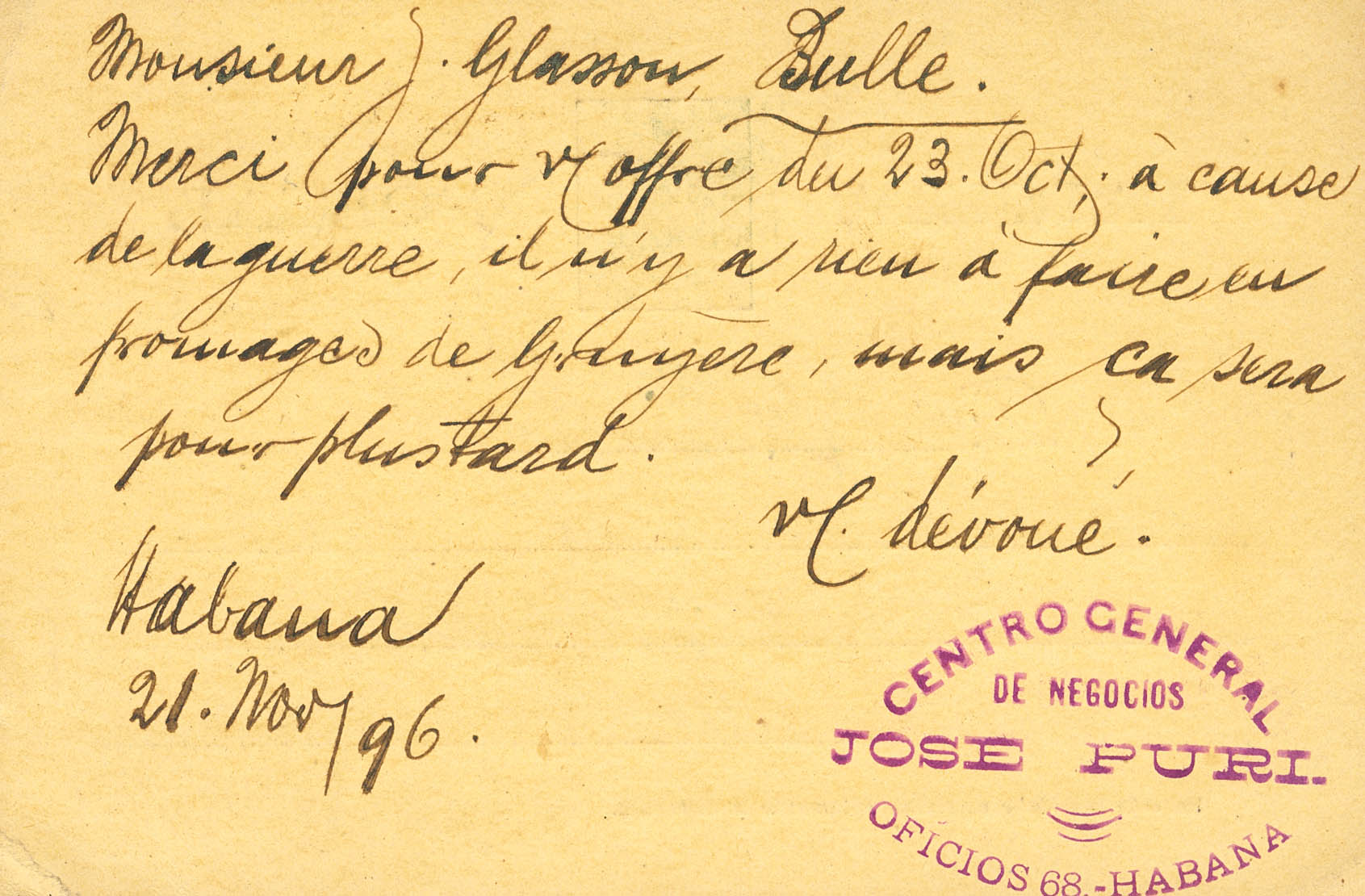 EP29. 1896. 2 cts verde sobre Tarjeta Entero Postal de LA HABANA a BULLE (SUIZA). En el frente llegada. MAGNIFICO Y RARO DESTINO.