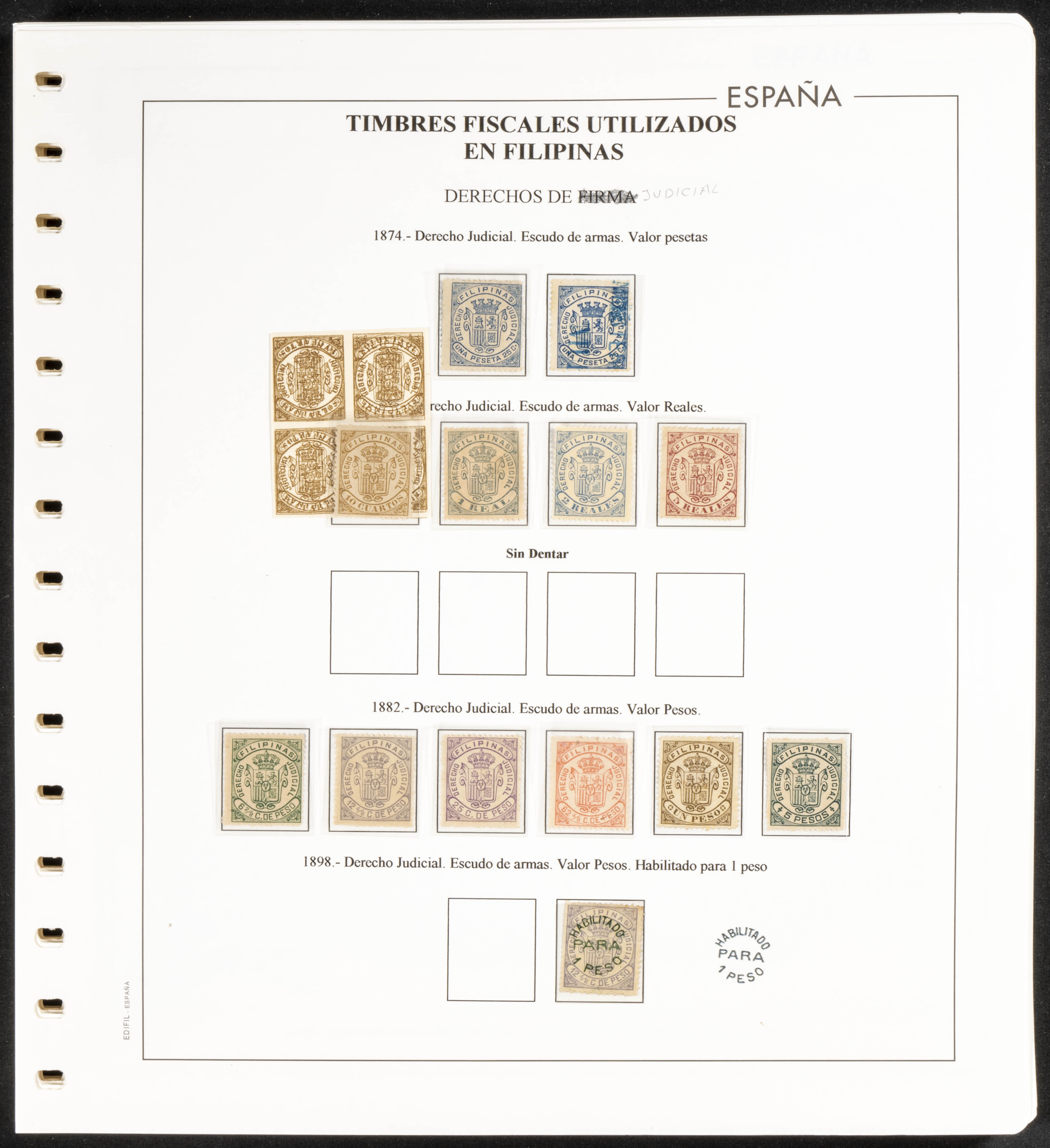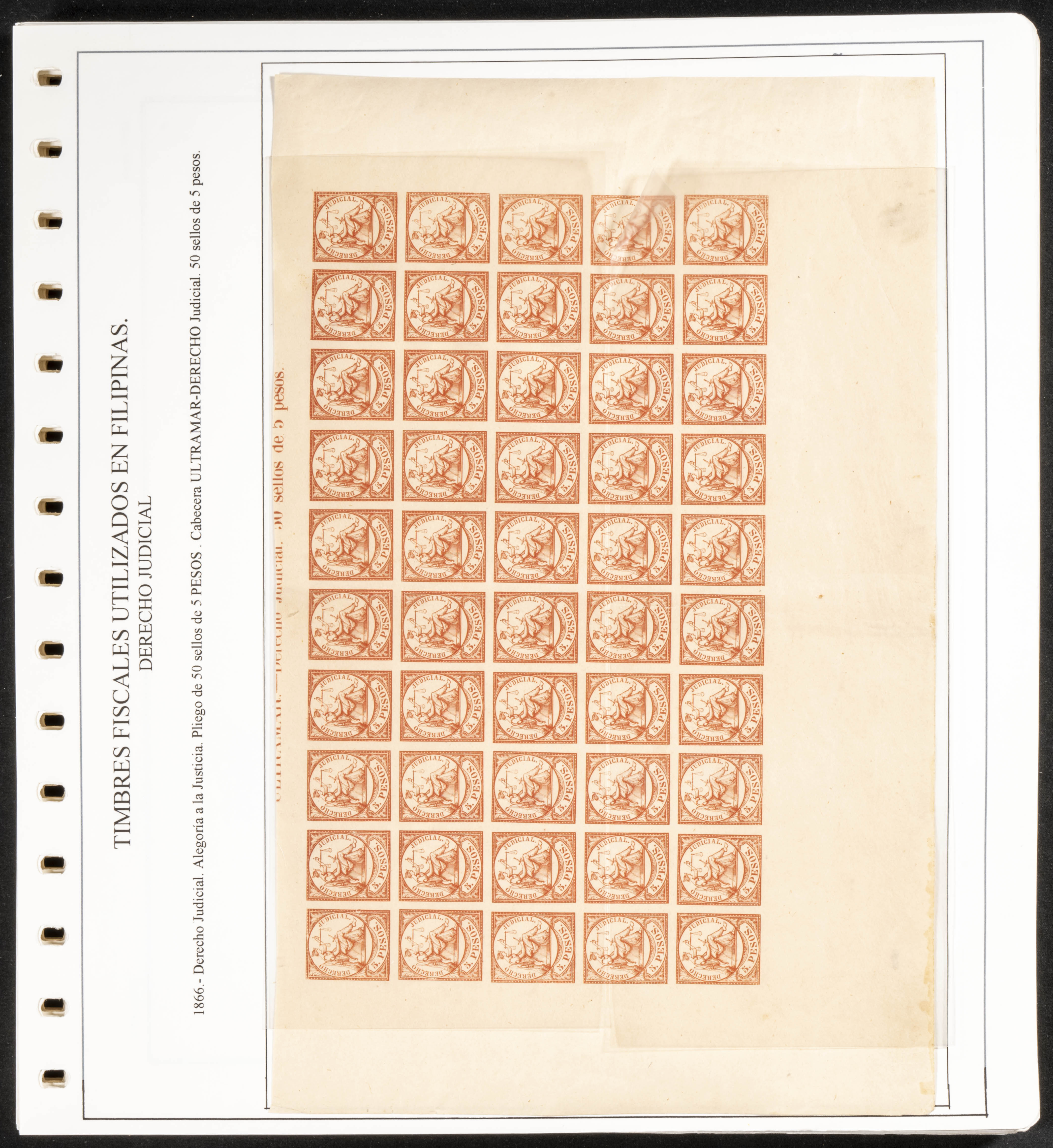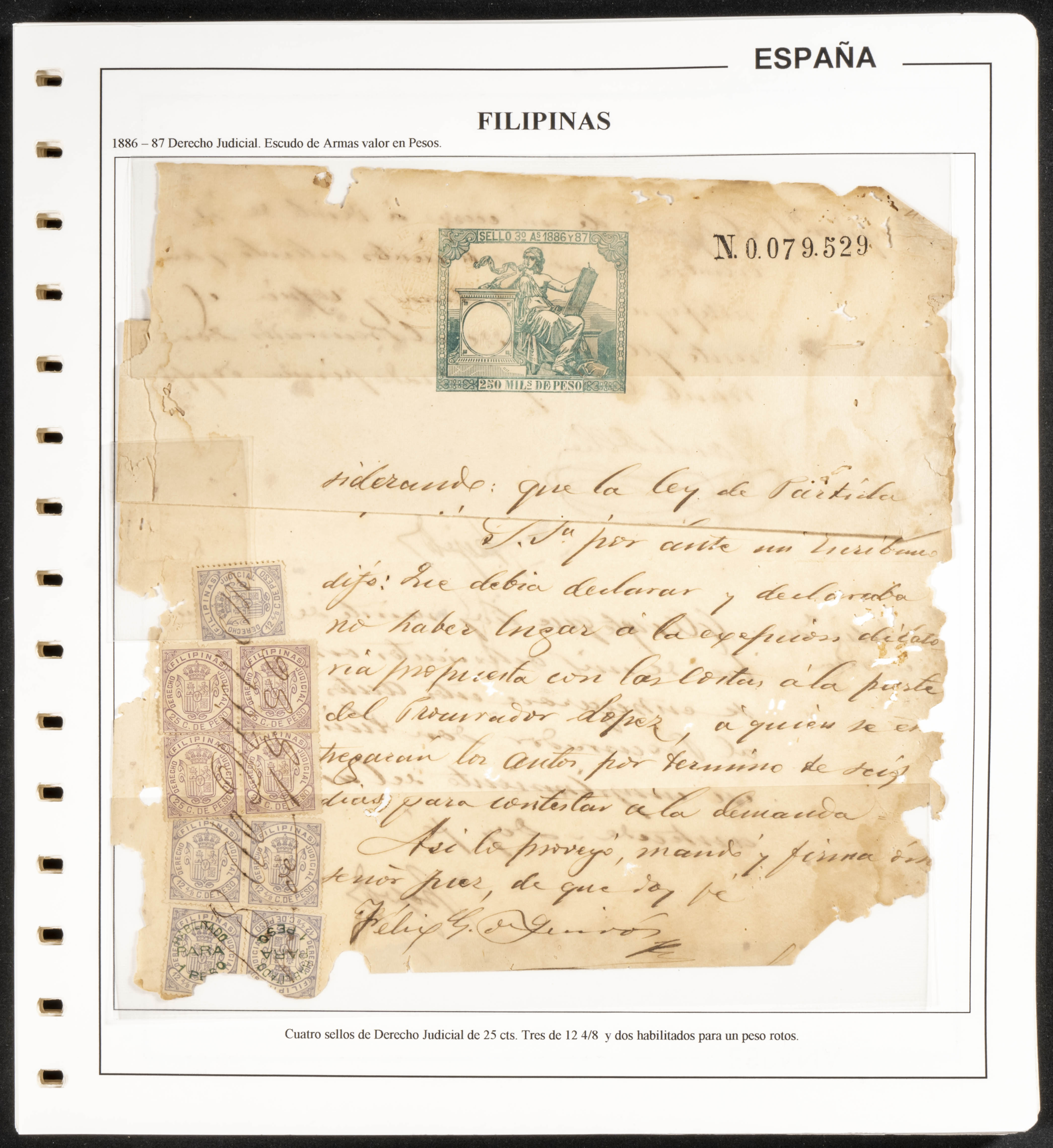 ★/(1866ca). Espectacular colección de Fiscales de Filipinas ente 1866 y 1898, en nuevo y usado e incluyendo pliegos completos de Derecho Judicial y Derechos de Firma, grandes bloques de diferentes apartados, varios documentos con sellos de Derecho Judicial y Giro, sellos de Giro y Pólizas con sobrecarga MUESTRA y alguna variedad sin dentar. MAGNIFICO Y RARISIMO CONJUNTO. A EXAMINAR.