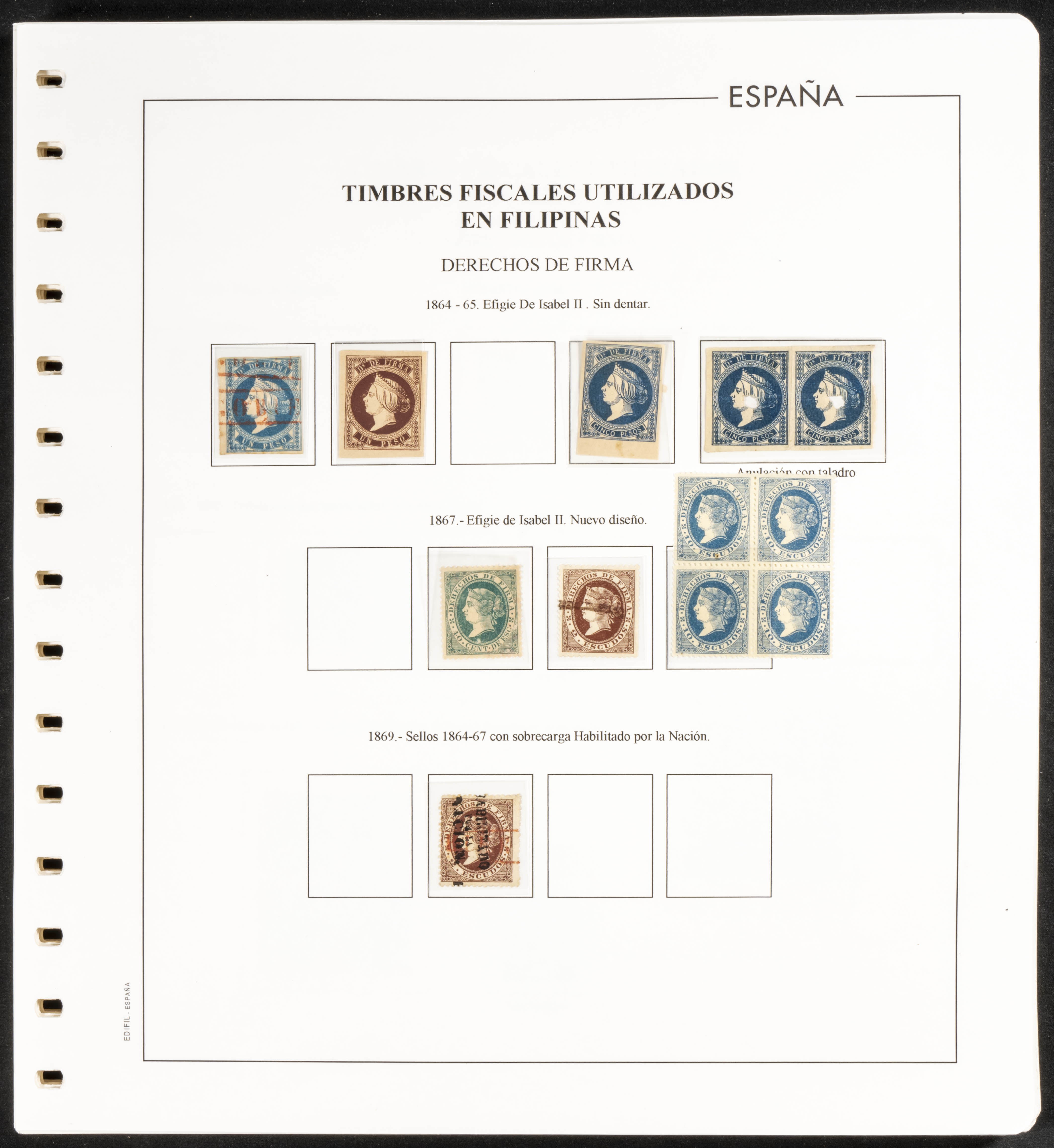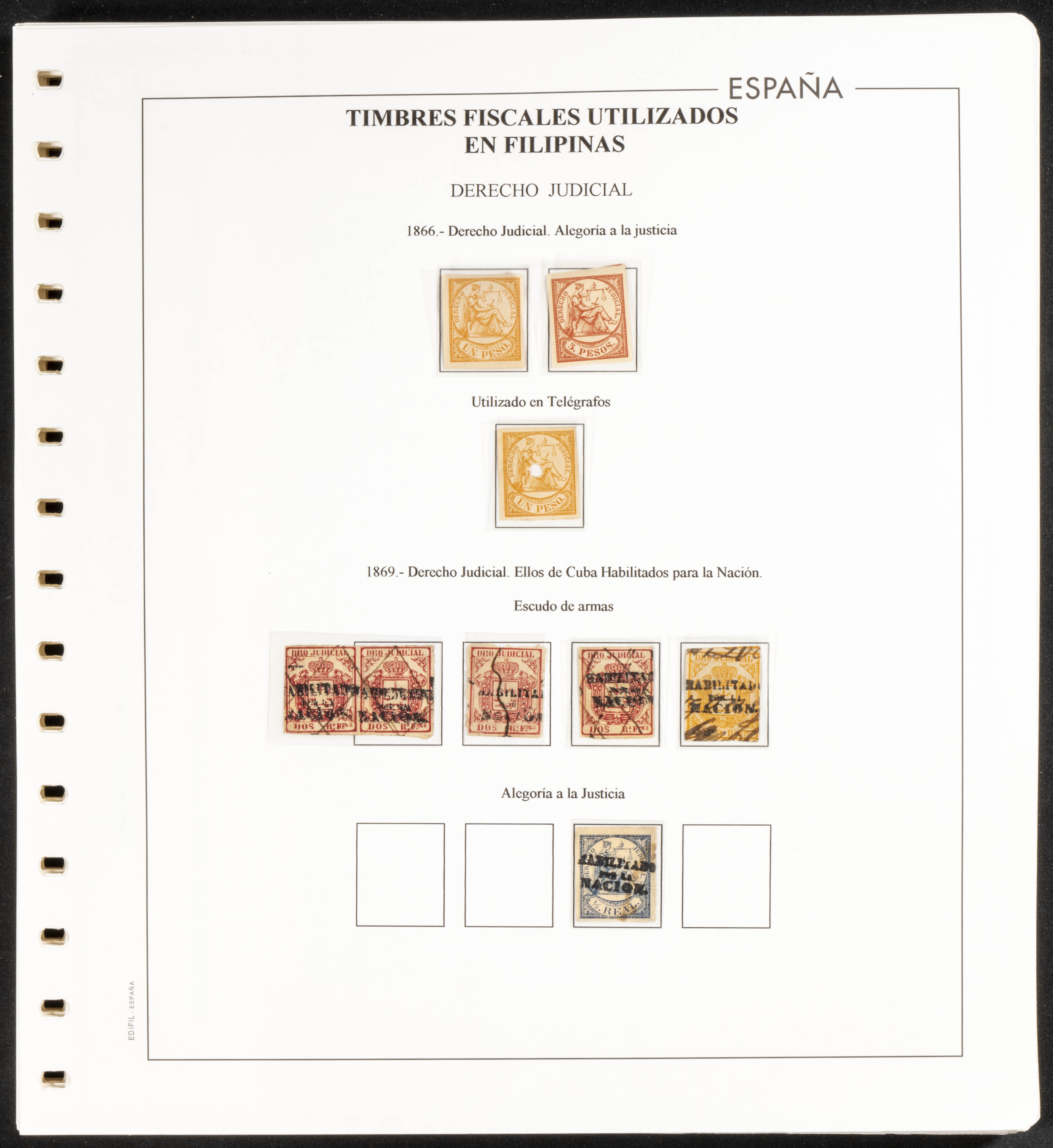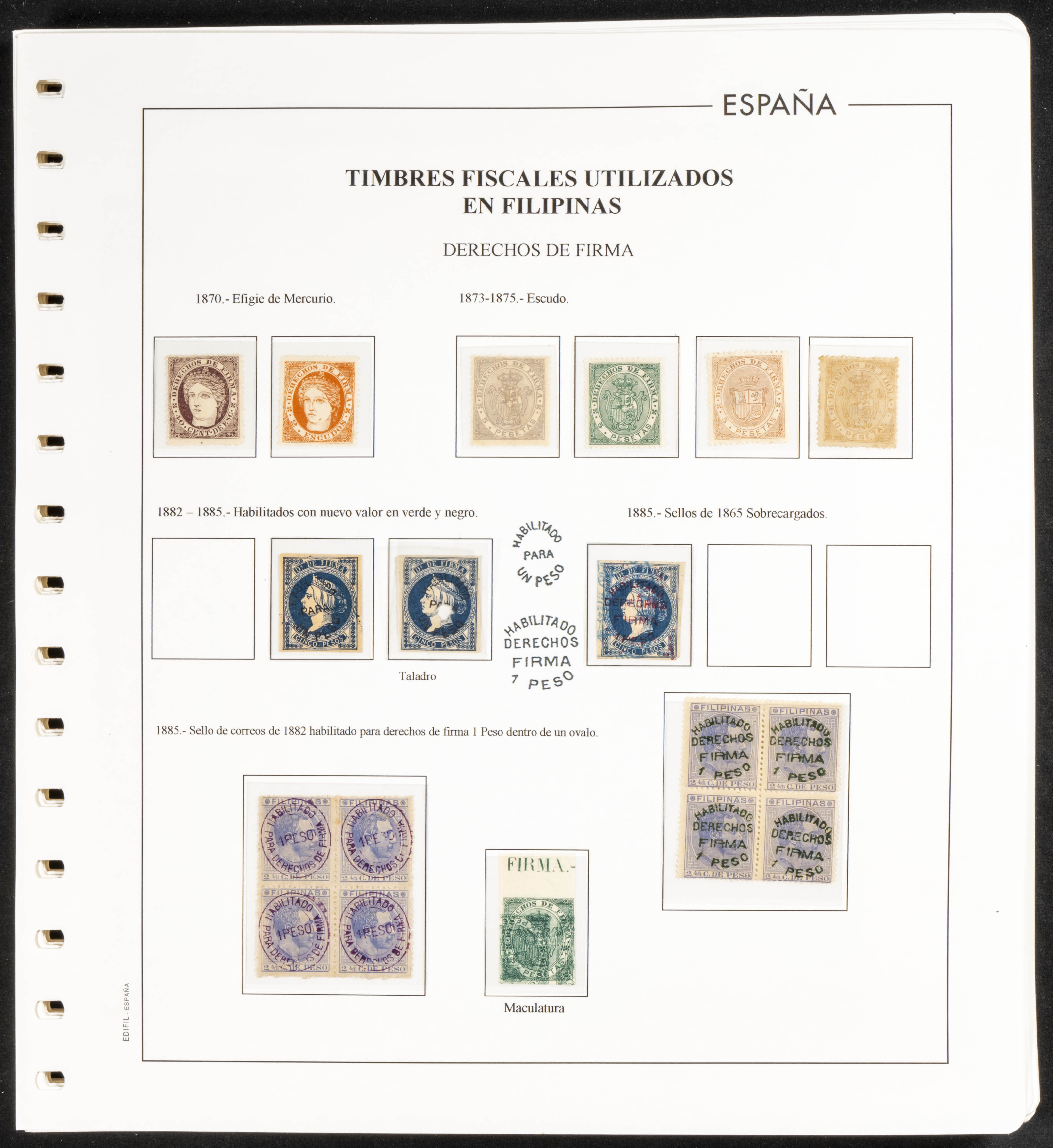 ★/(1866ca). Espectacular colección de Fiscales de Filipinas ente 1866 y 1898, en nuevo y usado e incluyendo pliegos completos de Derecho Judicial y Derechos de Firma, grandes bloques de diferentes apartados, varios documentos con sellos de Derecho Judicial y Giro, sellos de Giro y Pólizas con sobrecarga MUESTRA y alguna variedad sin dentar. MAGNIFICO Y RARISIMO CONJUNTO. A EXAMINAR.