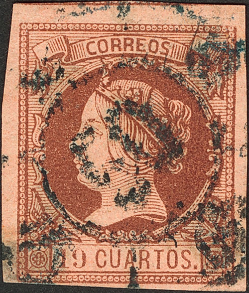 54. 1860. 19 cuartos castaño. Matasello R. CARRETA Nº50, de Irún. MAGNIFICO Y RARO.