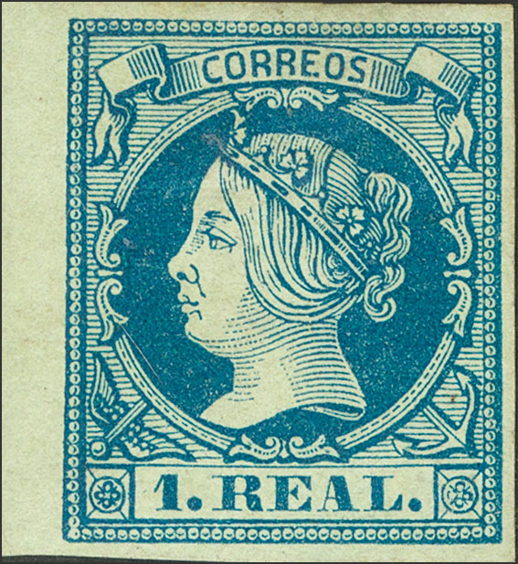 ★ 55. 1860. 1 real azul, borde de hoja. Color muy intenso. PIEZA DE LUJO. Cert. GRAUS.