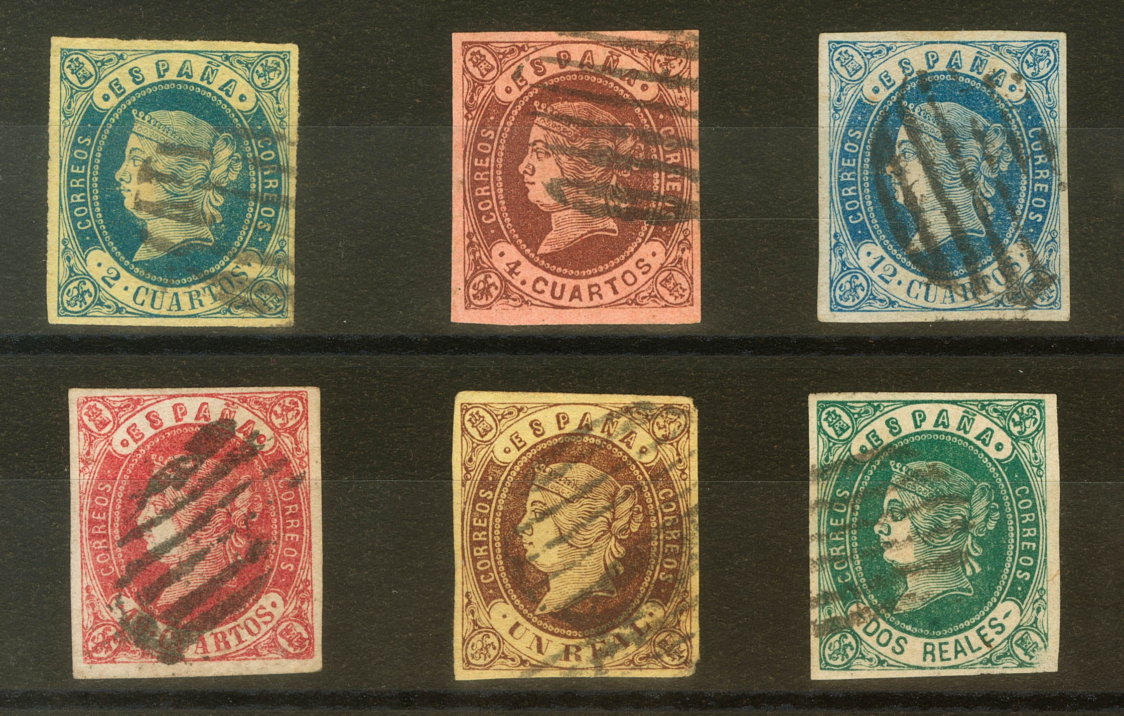 57/62. 1862. Serie completa. Amplios márgenes y todos los valores inutilizados con matasello (muy limpios) PARRILLA. MAGNIFICA Y MUY RARA. Edifil 2020: 689 Euros
