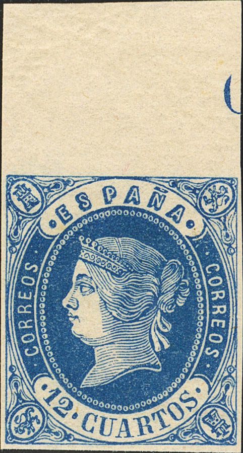 ★★ 59. 1862. 12 cuartos azul, borde de hoja. Color intenso. PIEZA DE LUJO.