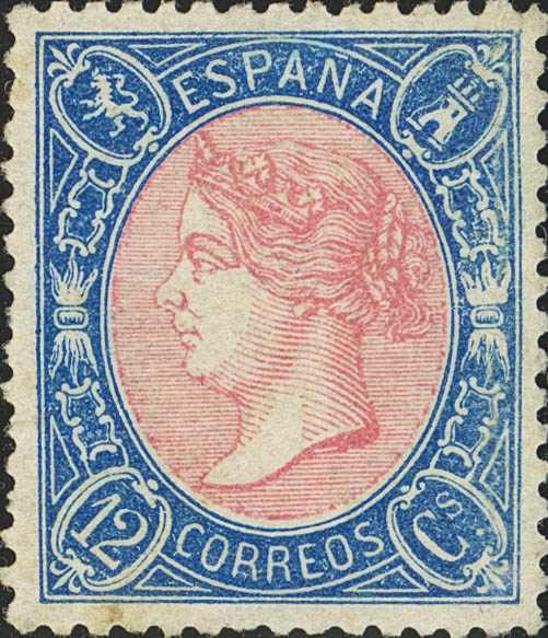 (★) 76. 1865. 12 cuartos azul y rosa (margen derecho reparado). Color intenso y muy bien centrado. MAGNIFICO Y RARO SELLO EN NUEVO. Cert. COMEX.