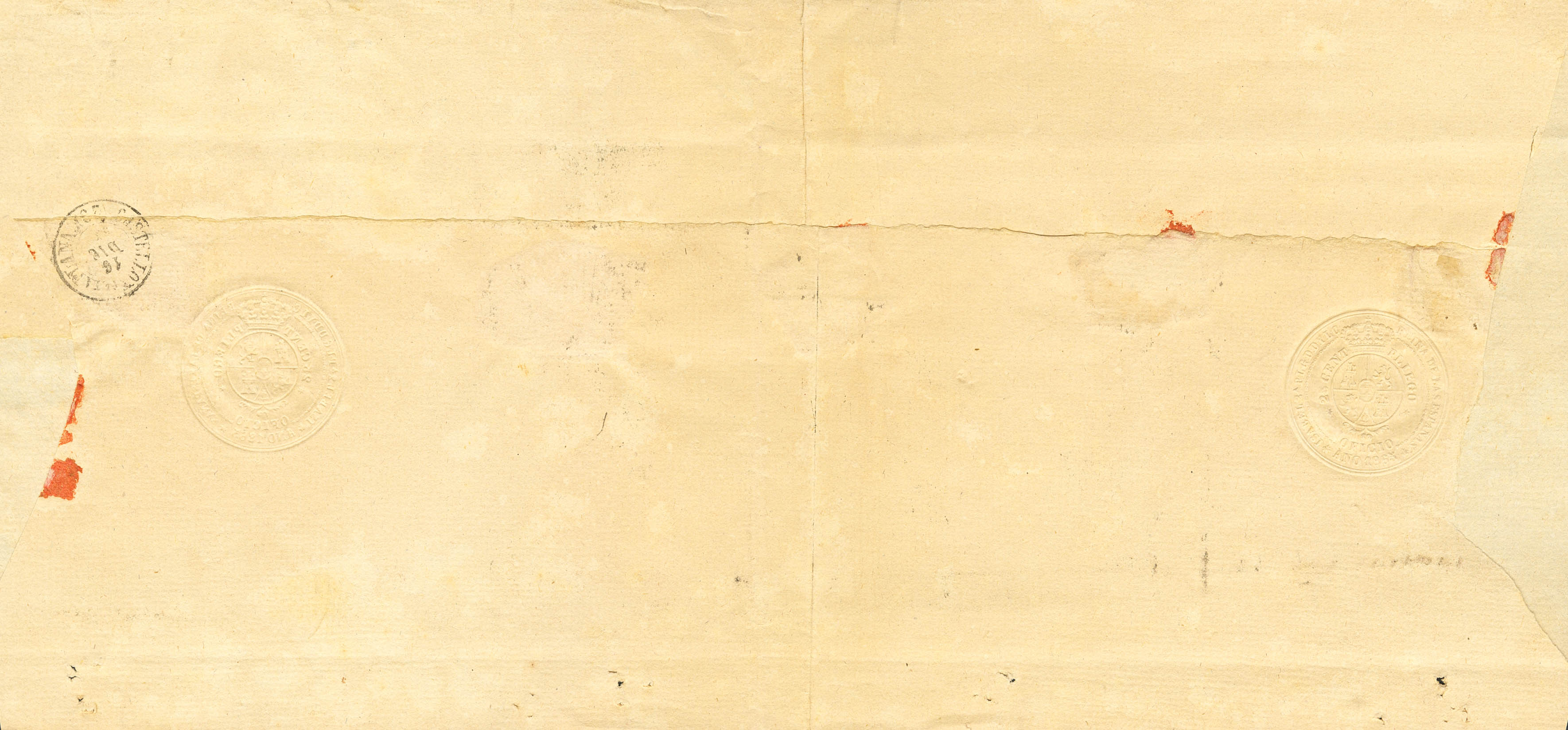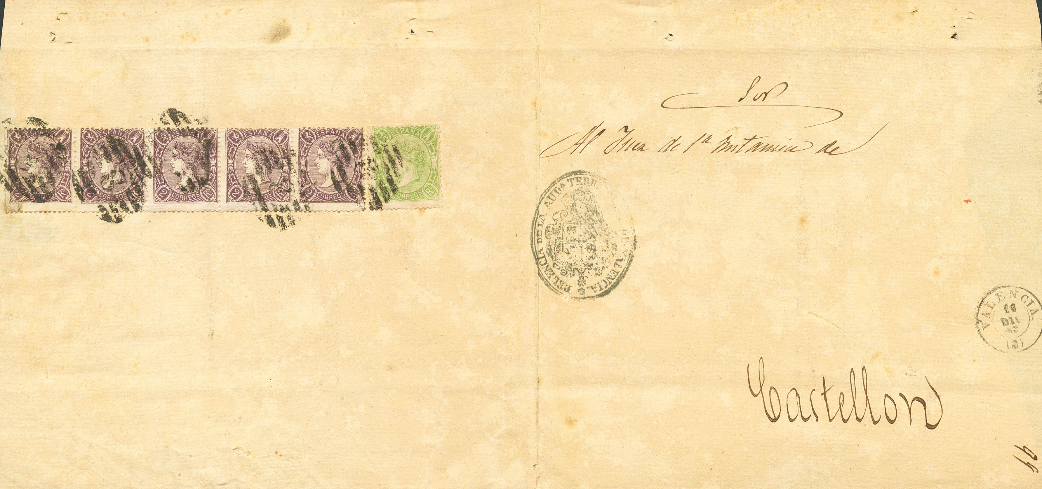 78, 79(5). 1867. 1 real verde y 2 reales violeta, tira de cinco. Plica Judicial (completa) de VALENCIA a CASTELLON. MAGNIFICA Y EXTRAORIDINARIAMENTE RARA, CIRCULADA CON SELLOS QUE SOLO ESTUVIERON EN CIRCULACION DESDE EL 11 DE ABRIL HASTA EL 31 DE DICIEMBRE DE 1865, PARA EL FRANQUEO DE 23 PORTES CON UN EXCESO DE 1½ CUARTOS. Cert. GRAUS.
