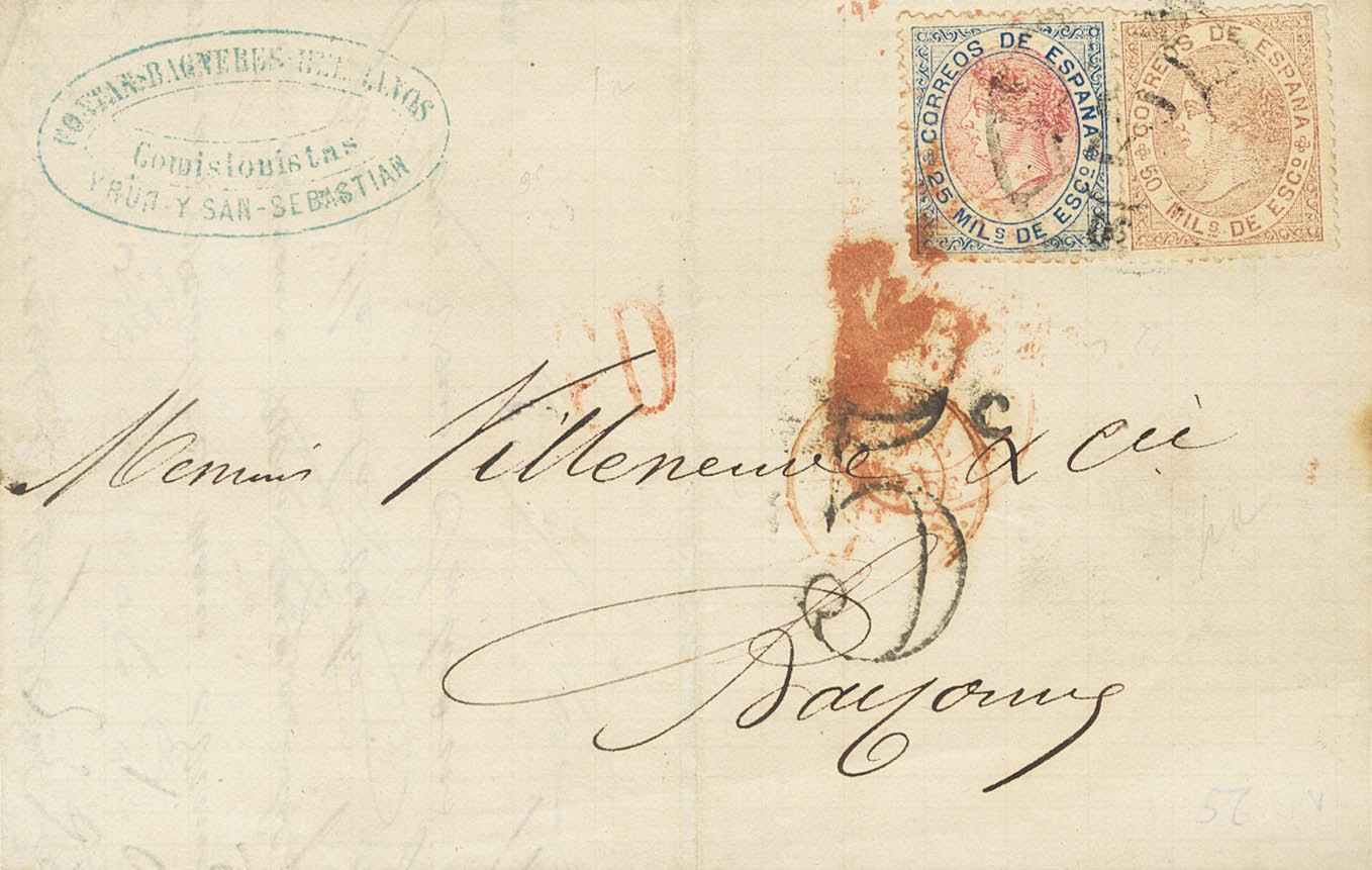 95, 96. 1867. 25 mils y 50 mils. IRUN a BAYONA (FRANCIA). MAGNIFICA Y RARO FRANQUEO FRONTERIZO DE 75 MILS.