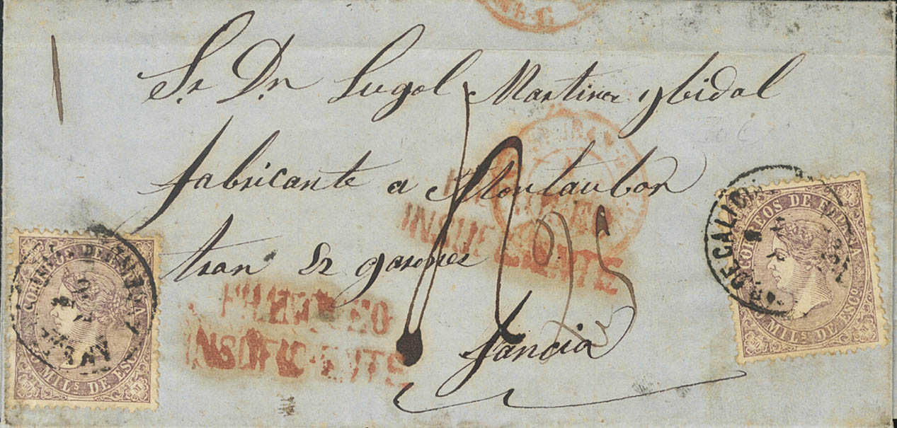 98(2). 1869. 50 mils violeta, dos sellos. GRIJOTA (PALENCIA) a MONTAUBAN (FRANCIA). Matasello ambulante y en el frente marca FRANQUEO / INSUFICIENTE, en rojo estampada dos veces e indicación manuscrita "1" para indicar que se trata de un porte simple. MAGNIFICA Y MUY RARA.