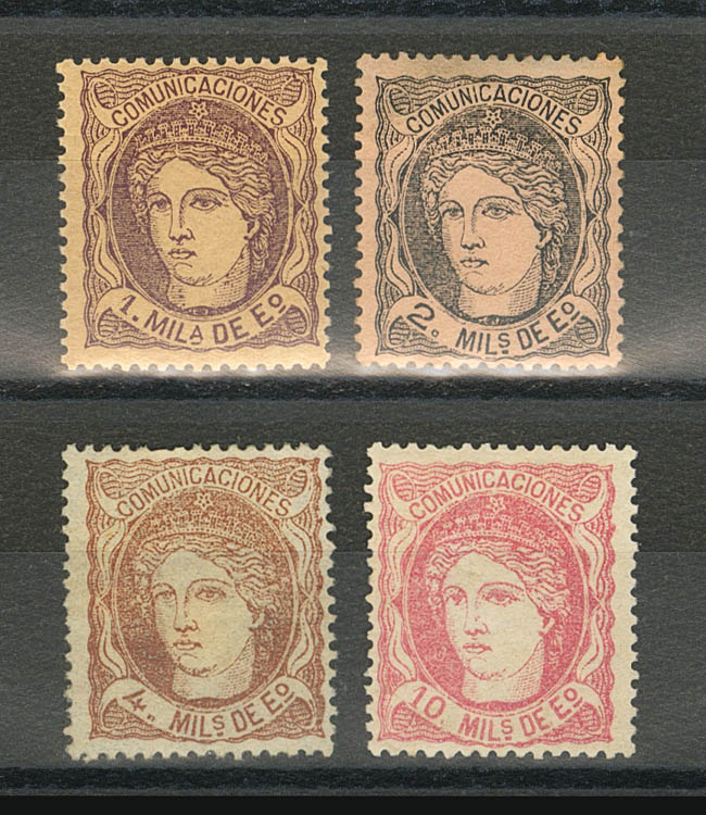 ★★/(★) 102/05. 1870. 1 mils violeta, 2 mils negro, 4 mils sepia, 10 mils rosa. MAGNIFICOS.