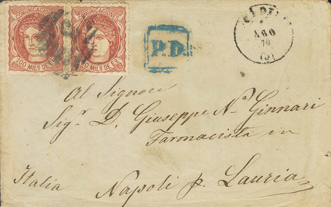 108(2). 1870. 100 mils rojo castaño, pareja. CADIZ a NAPOLES. MAGNIFICA.