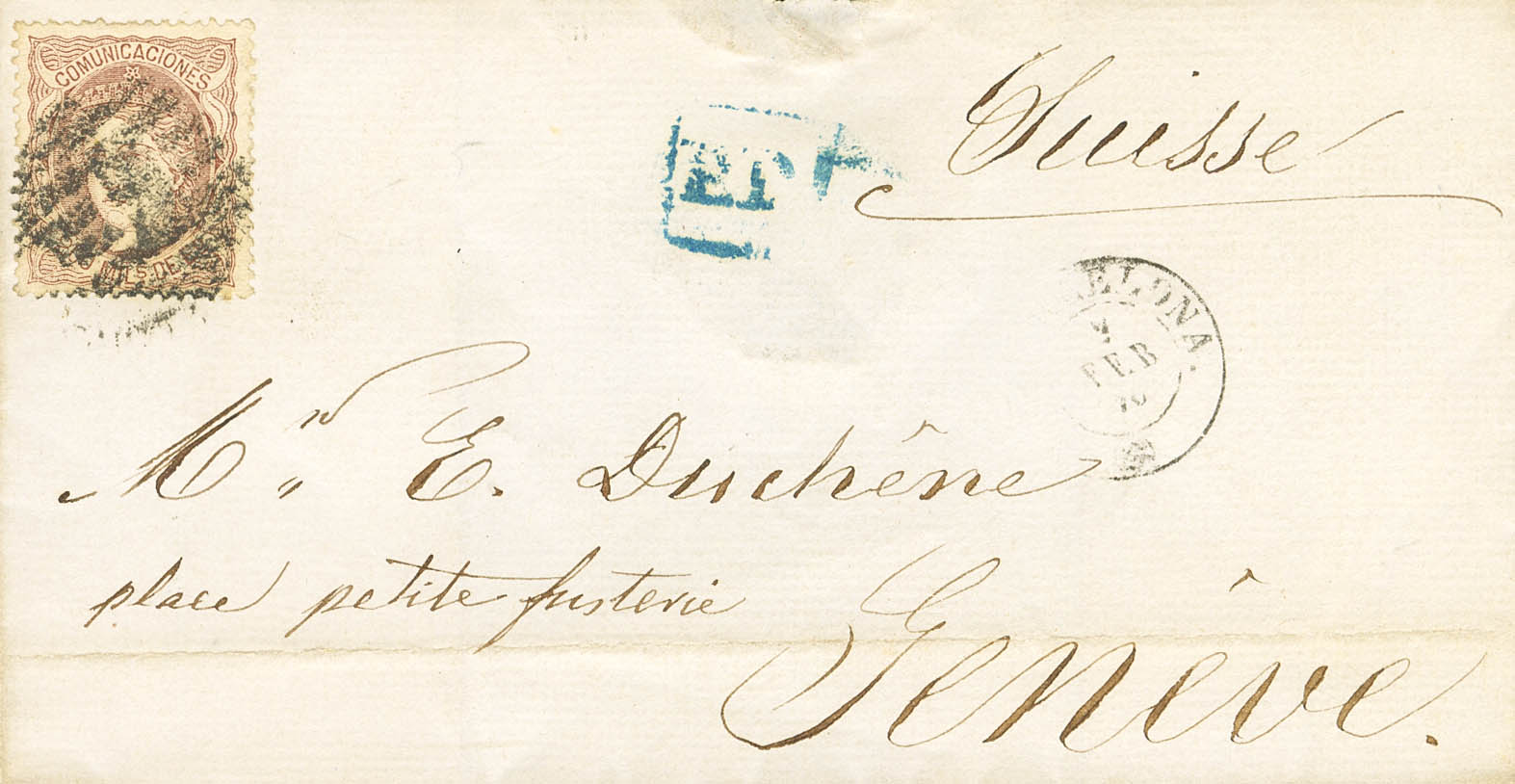 109. 1870. 200 mils castaño. BARCELONA a GINEBRA (SUIZA). MAGNIFICA.