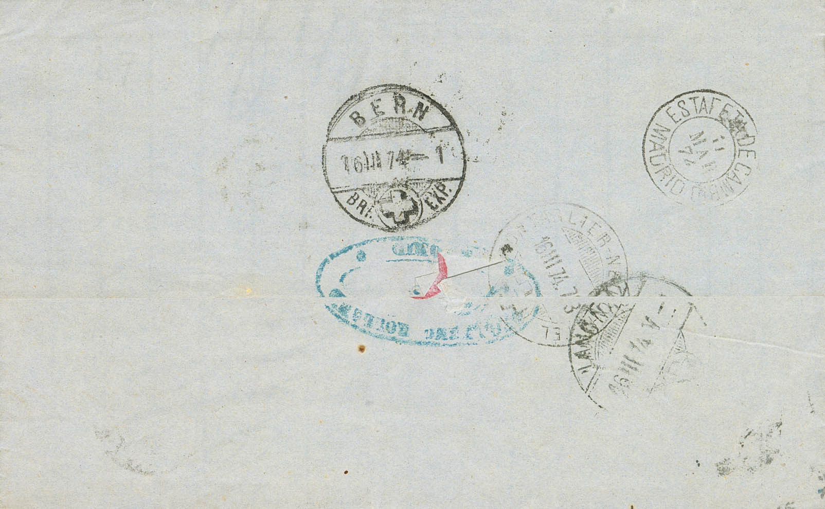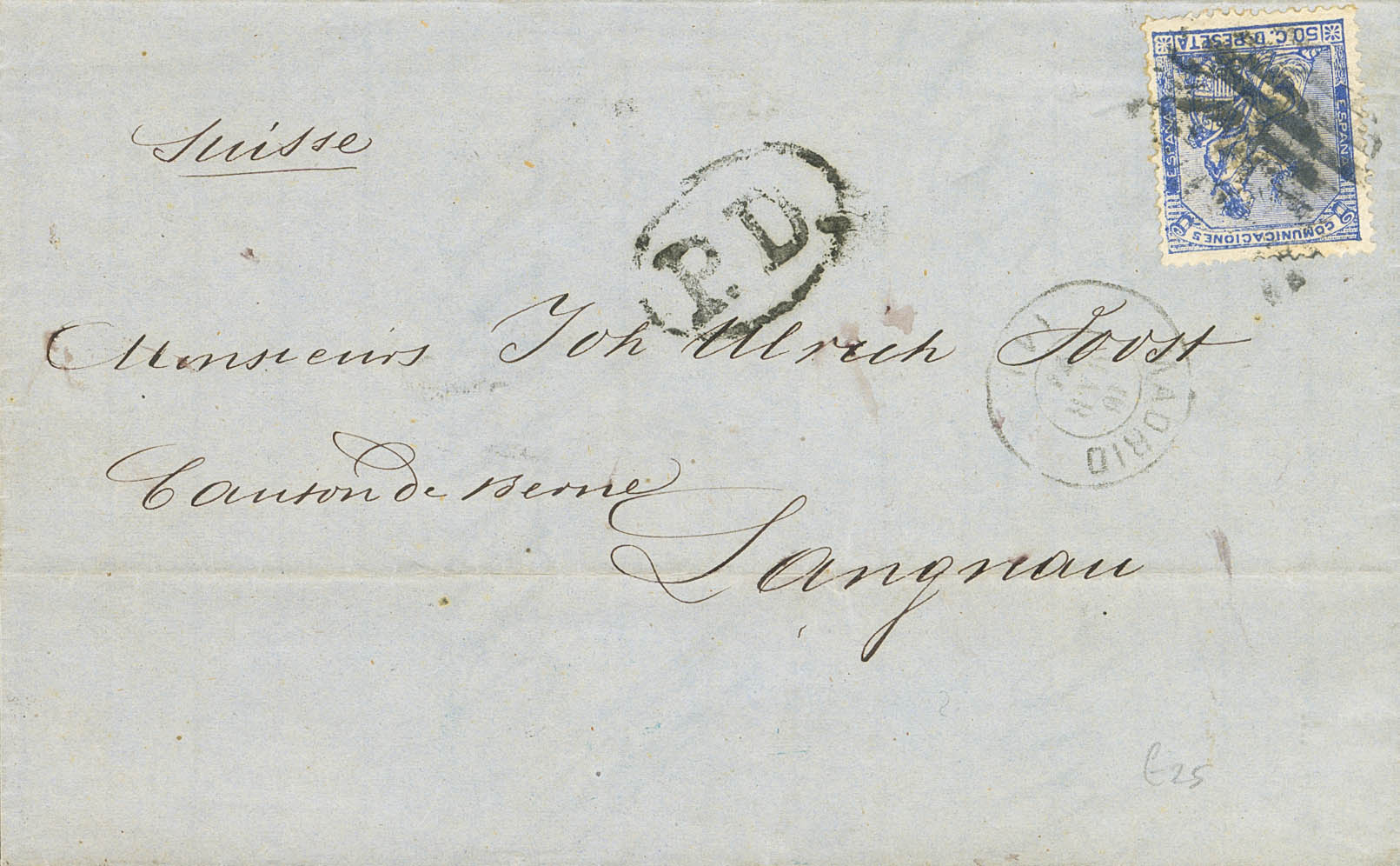 137. 1874. 50 cts ultramar. MADRID a LANGNAU (SUIZA). Franqueo según tarifa de Noviembre de 1867 de 200 mils ó 50 cts. MAGNIFICA.