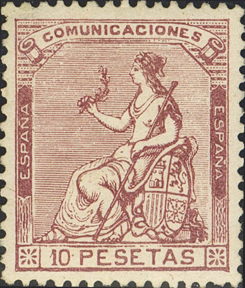 ★ 140. 1873. 10 pts castaño violeta. Excepcional centraje y color intenso. PIEZA DE LUJO. Cert. CEM.