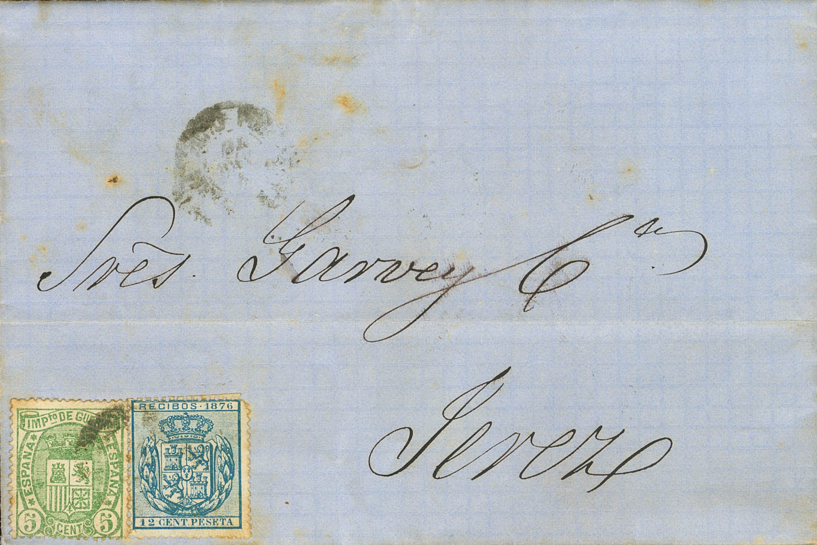 154. 1876. 5 cts verde y fiscal de 12 cts azul RECIBOS. PUERTO DE SANTA MARIA a JEREZ DE LA FRONTERA. BONITA Y RARO FRANQUEO CON UN SELLO FISCAL.