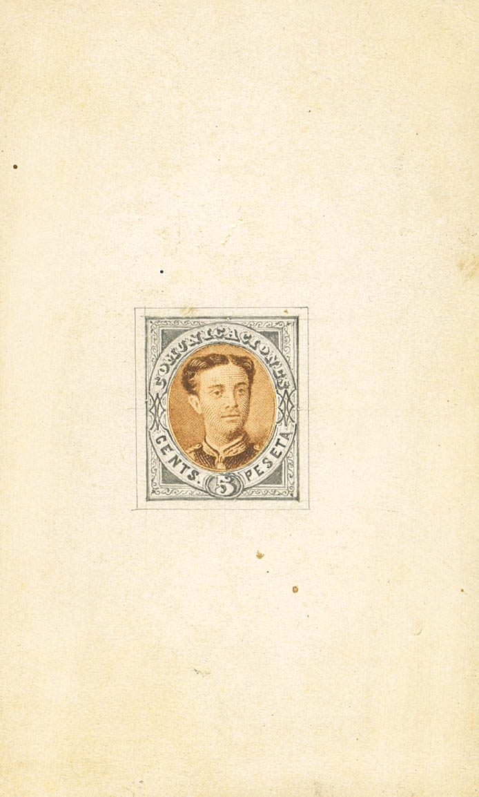 (★)1876. 5 cts gris y castaño. PROYECTO DE BRADBURY AND WILKINSON, realizada a "carboncillo" a mano (en lugar de tinta china), con el centro de un sello de la emisión de 1876 (impreso en dicha imprenta) y del mismo arte que las reseñadas por Gálvez en la página 32 en su obra de Pruebas y Ensayos. MAGNIFICA Y MUY RARA.