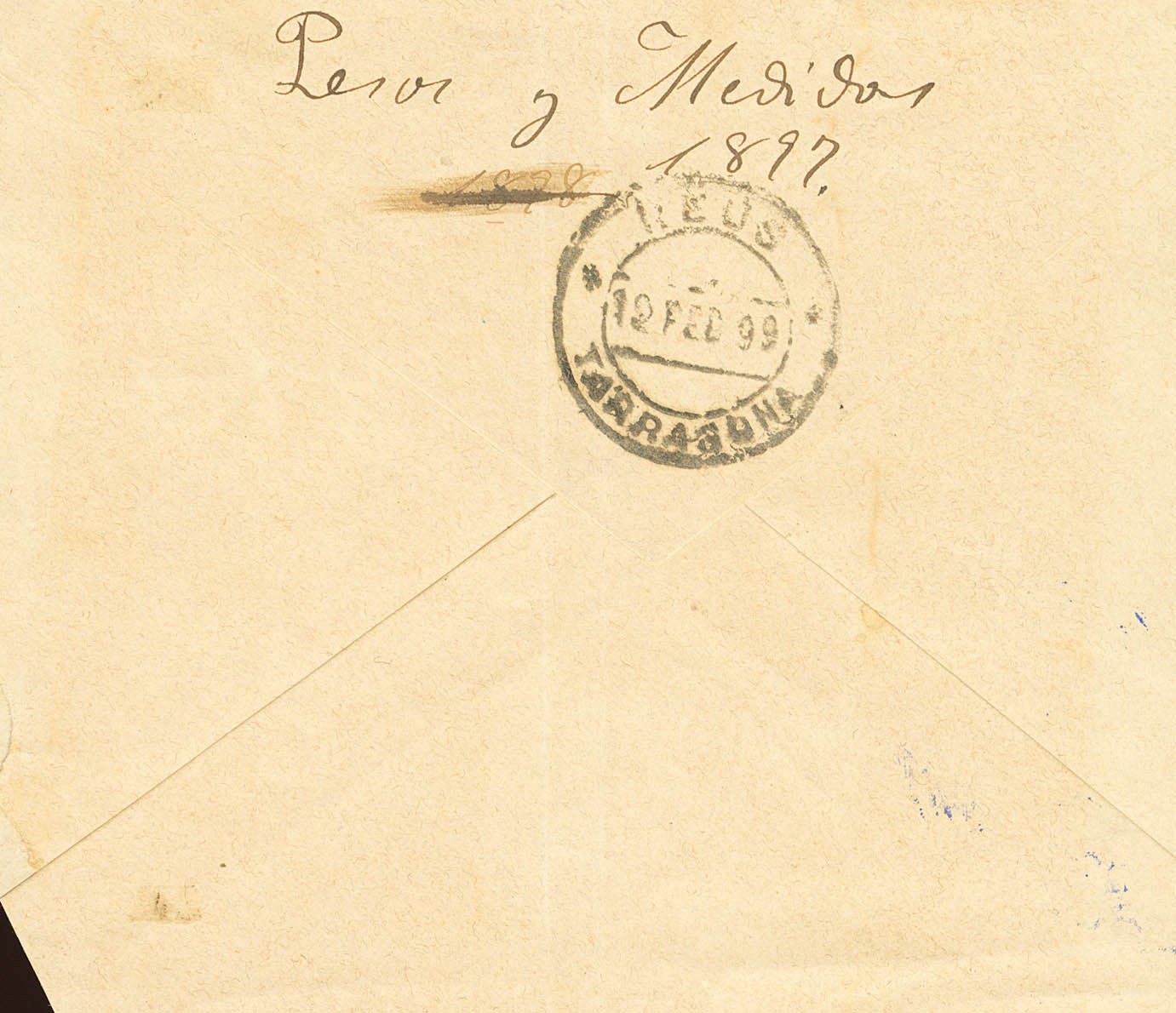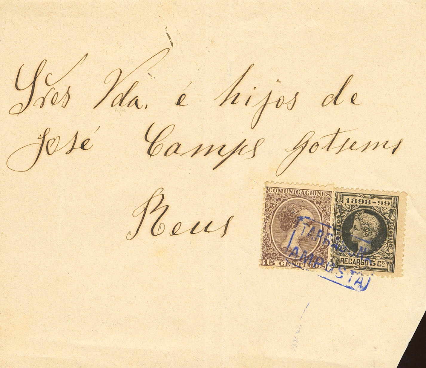 219, 240. 1899. 15 cts castaño y 5 cts negro. AMPOSTA a REUS (TARRAGONA). Matasello cartería TARRAGONA / AMPOSTA. MAGNIFICA.