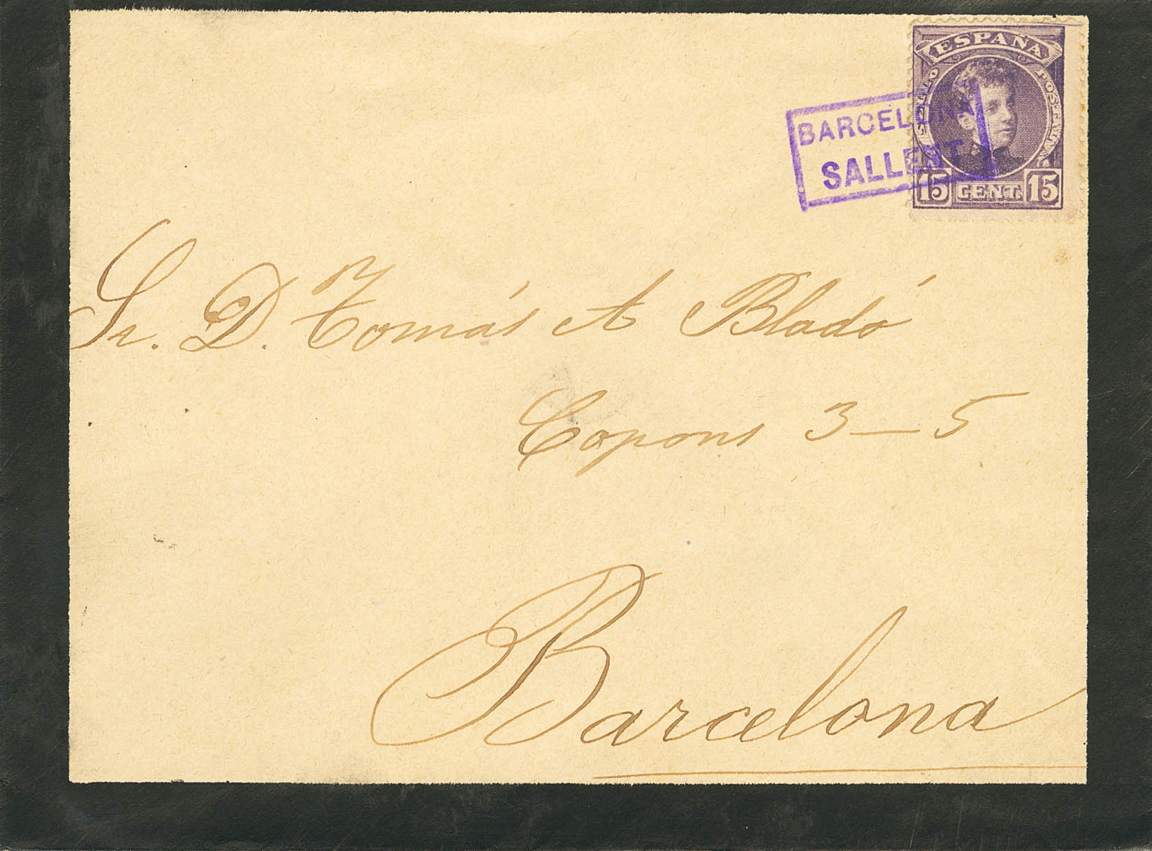 245. 1901. 15 cts castaño lila. SALLENT a BARCELONA. Matasello cartería especial BARCELONA / SALLENT. MAGNIFICA E INUSUAL.