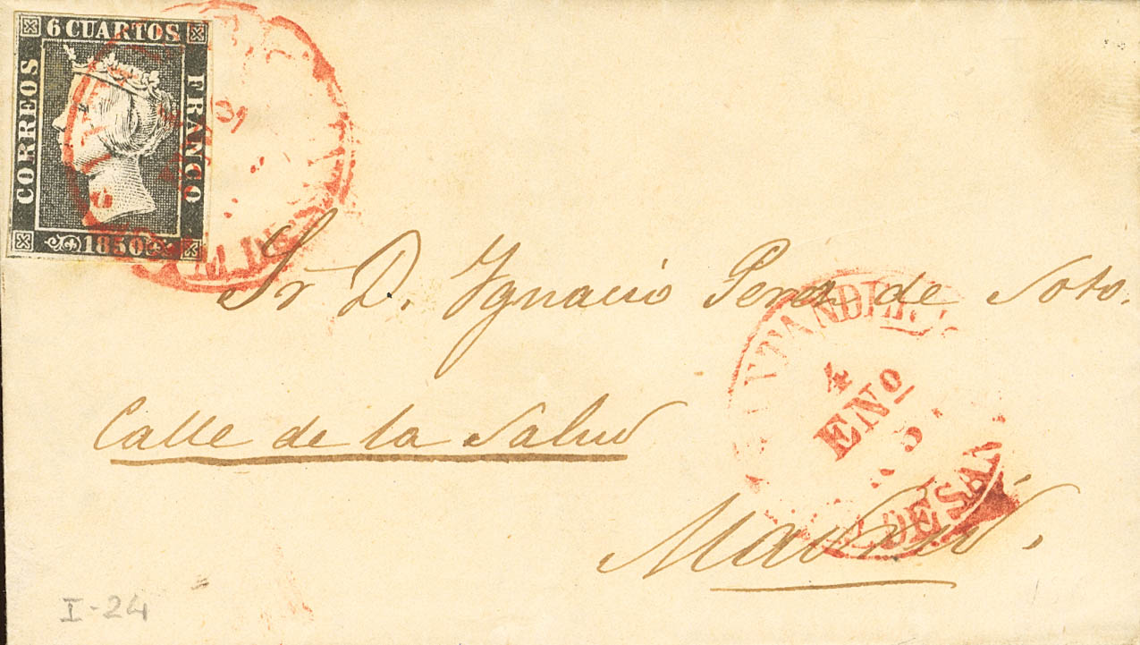 1. 1850. 6 cuartos negro. SANTANDER a MADRID. Matasello baeza SANTANDER / 4-ENº-1850 / M.DE SANTANDER. MAGNIFICA Y RARA CIRCULADA LOS PRIMEROS DIAS DEL MES DE ENERO.