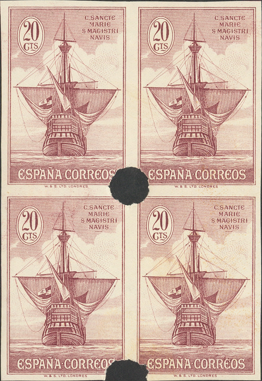 ★★ 546MTshe(4). 1930. 20 cts lila, bloque de cuatro. SIN DENTAR y SIN SOBRECARGA, con taladro angular. MAGNIFICO Y MUY RARO. Edifil 2020: +708 Euros
