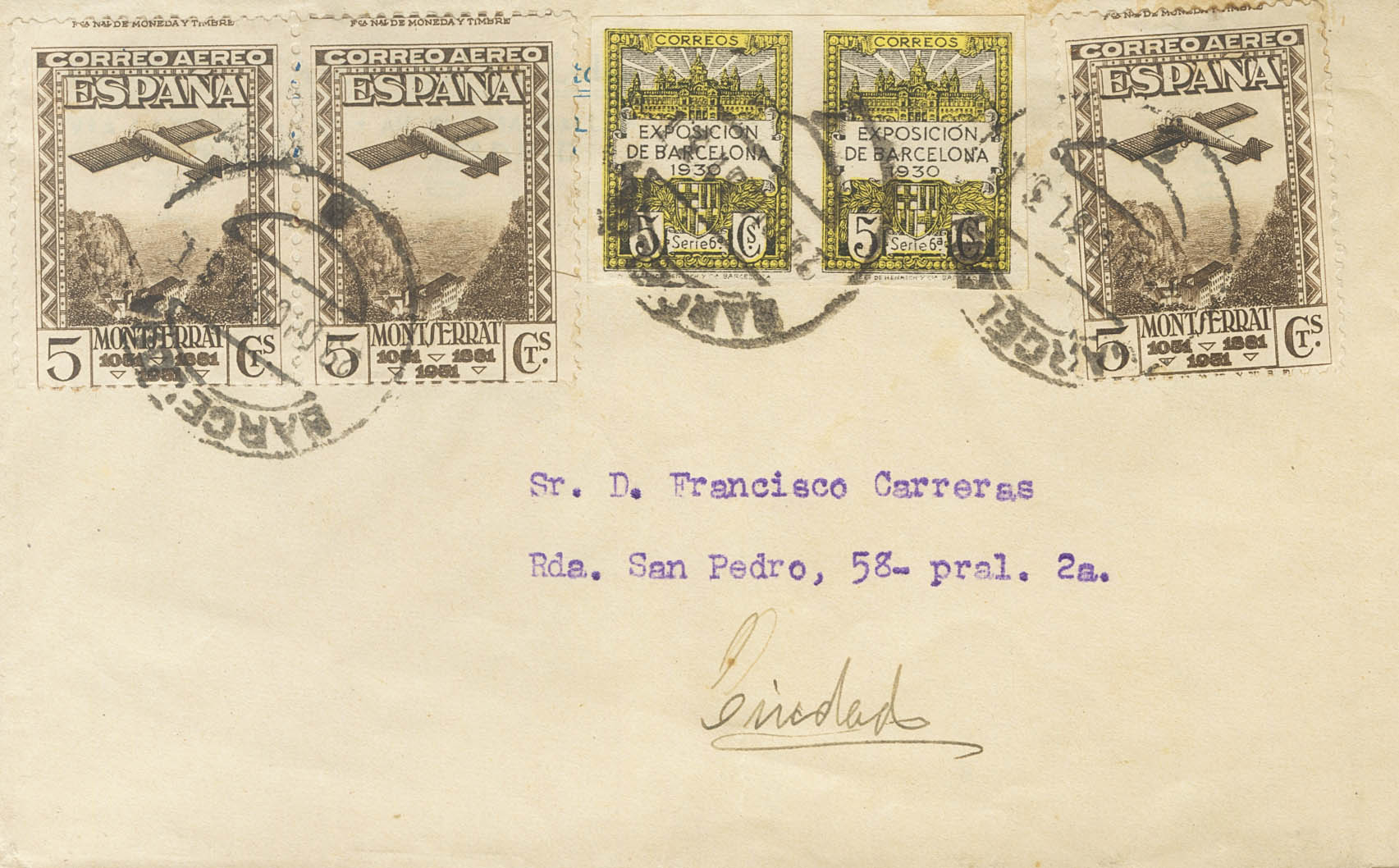 650(3). 1931. 5 cts castaño, tres sellos y 5 cts del Ayuntamiento de Barcelona SIN DENTAR, pareja. Carta Filatélica de Correo Interior de BARCELONA. MAGNIFICA.